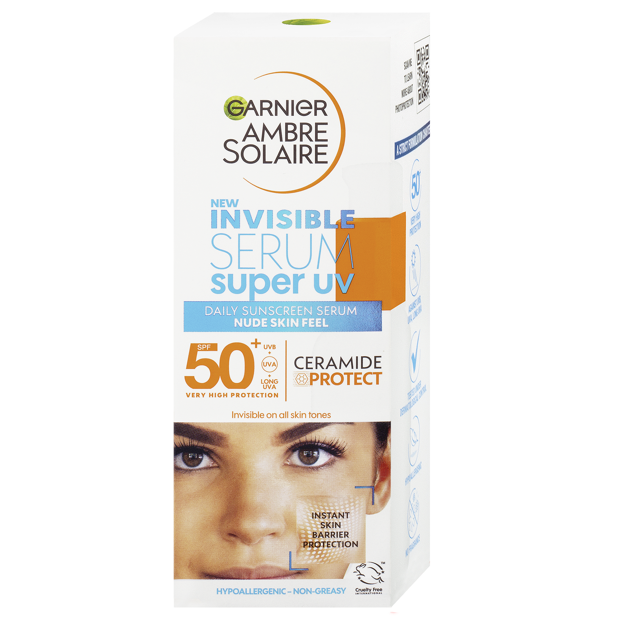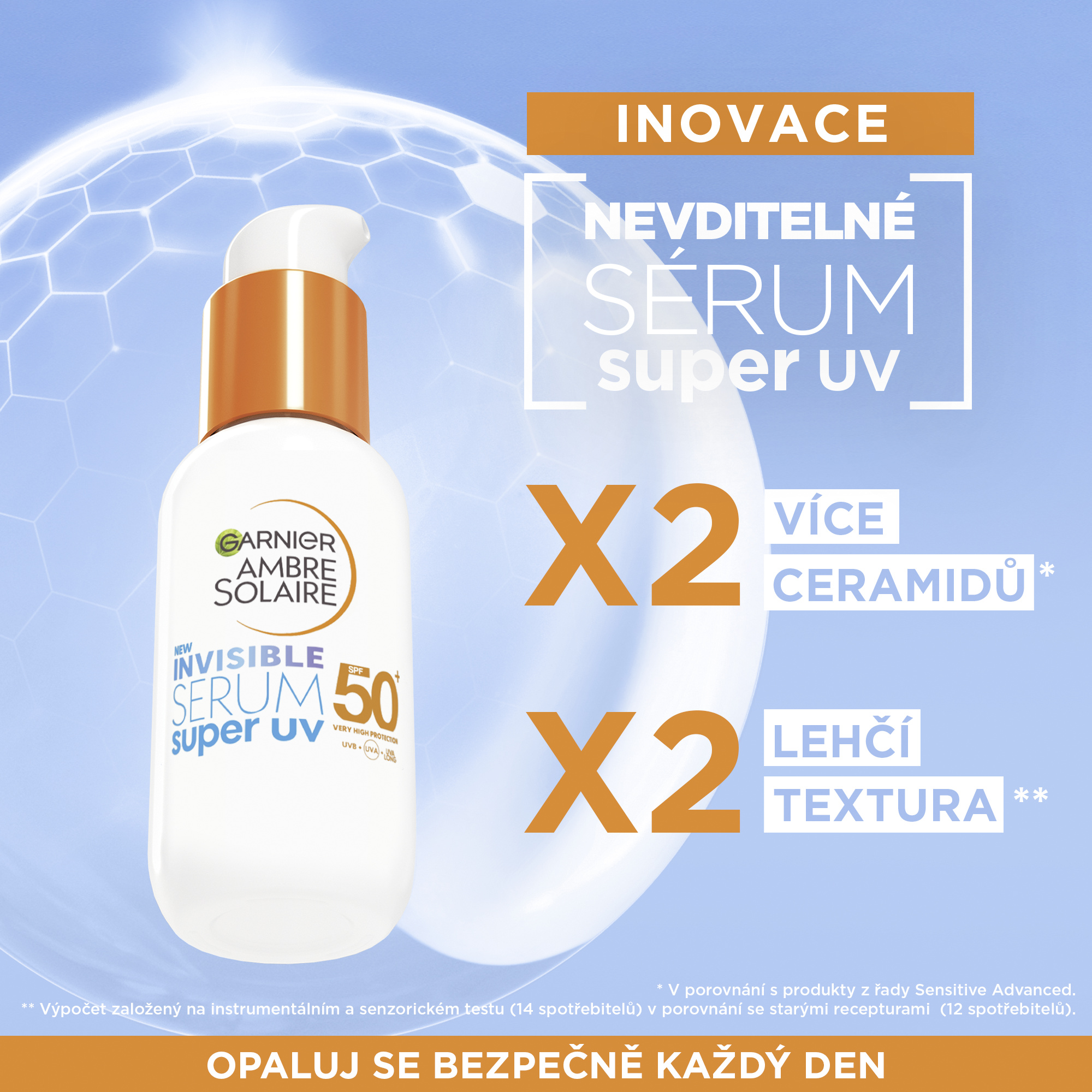Nové Super UV sérum nabízí každodenní velmi vysokou ochranu s faktorem SPF 50+ proti UVB, UVA a dlouhovlnnému UVA záření. Je vyvinuto pro citlivou oblast obličeje a pomáhá bojovat proti vnějším agresorům a znečištění pleti. Textura je lehčí než u klasických opalovacích krémů a umožňuje celodenní pohodlné nošení. Je vhodné jako podklad pod make-up.