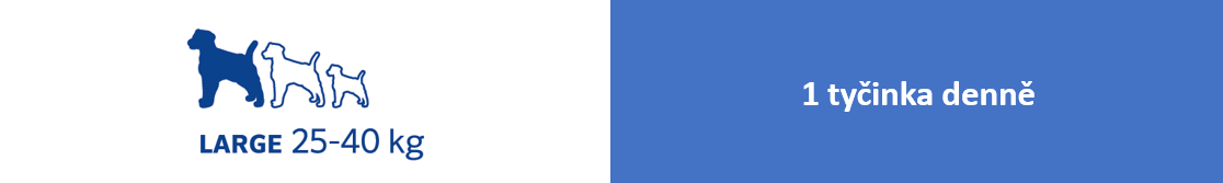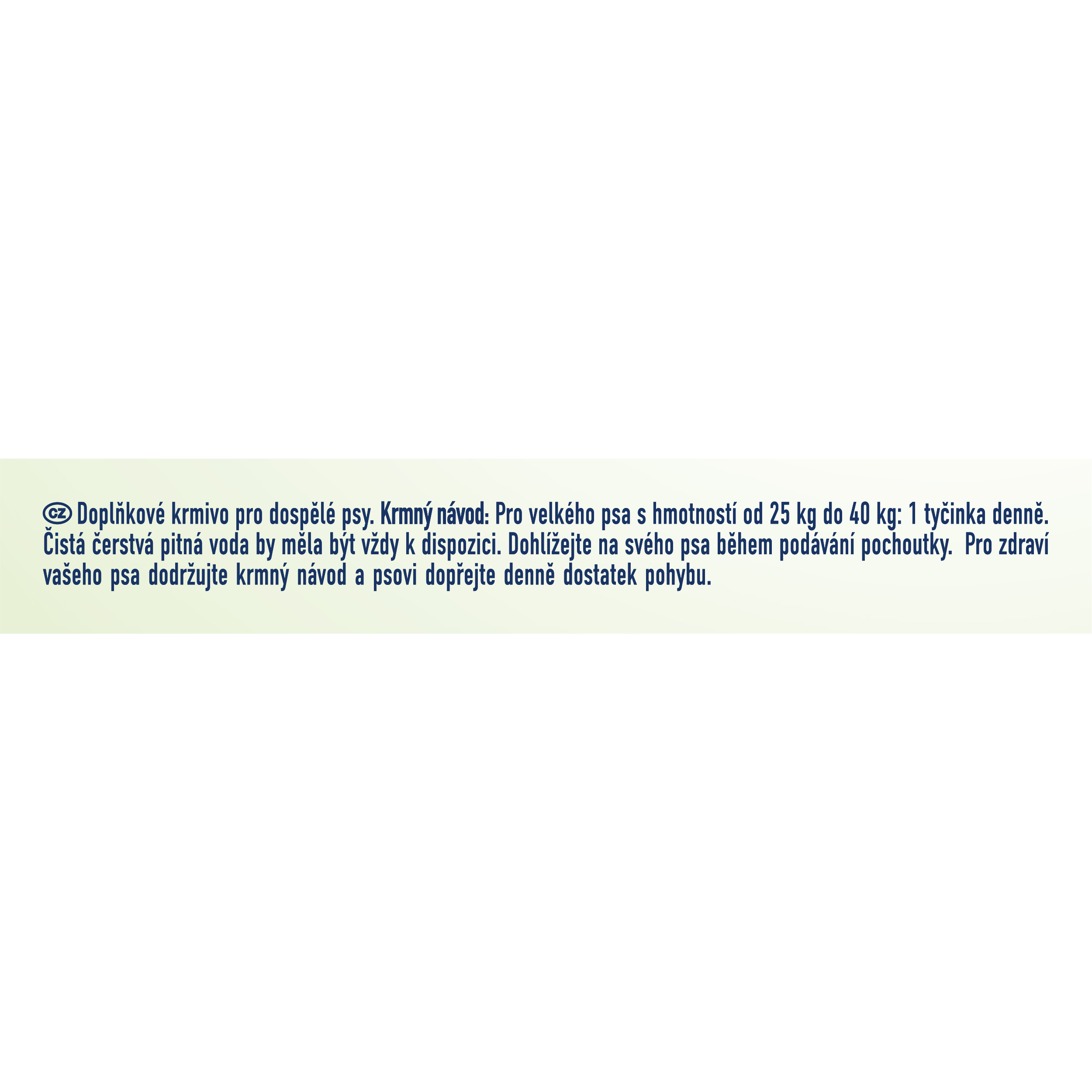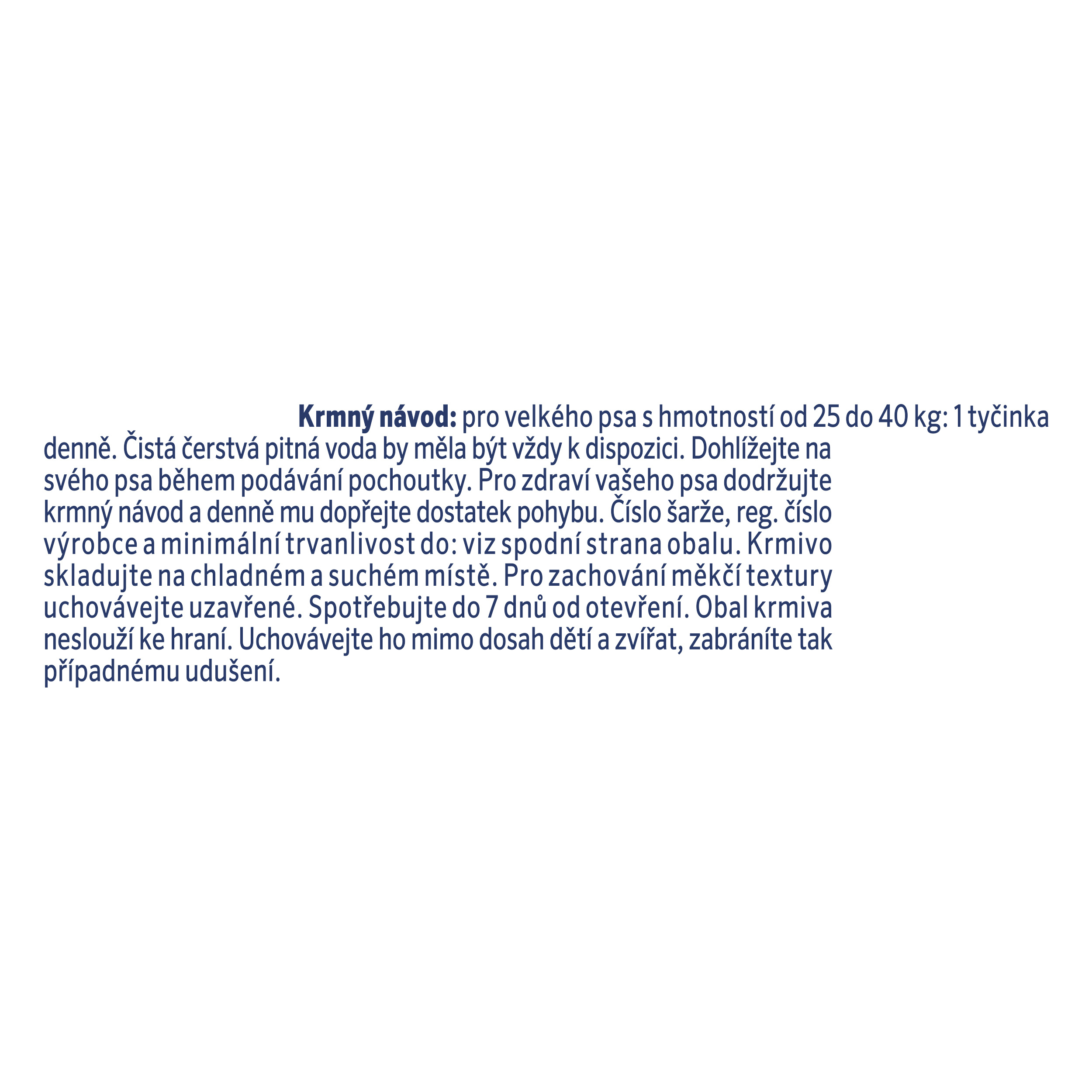Krmný návod: pro velkého psa s hmotností od 25 do 40 kg: 1 tyčinka denně. Čistá čerstvá pitná voda by měla být vždy k dispozici. Dohlížejte na svého psa během podávání pochoutky. Pro zdraví vašeho psa dodržujte krmný návod a denně mu dopřejte dostatek pohybu.
