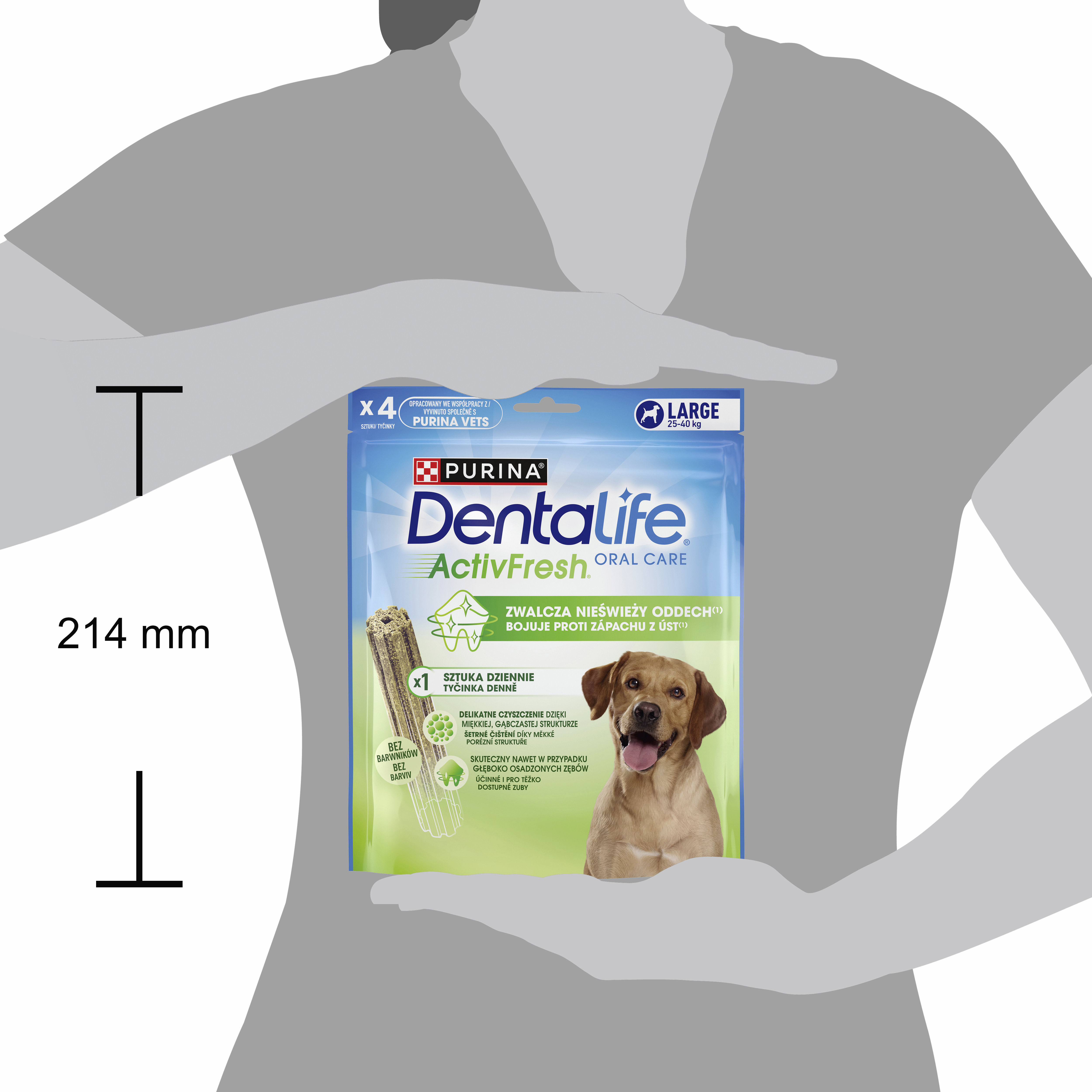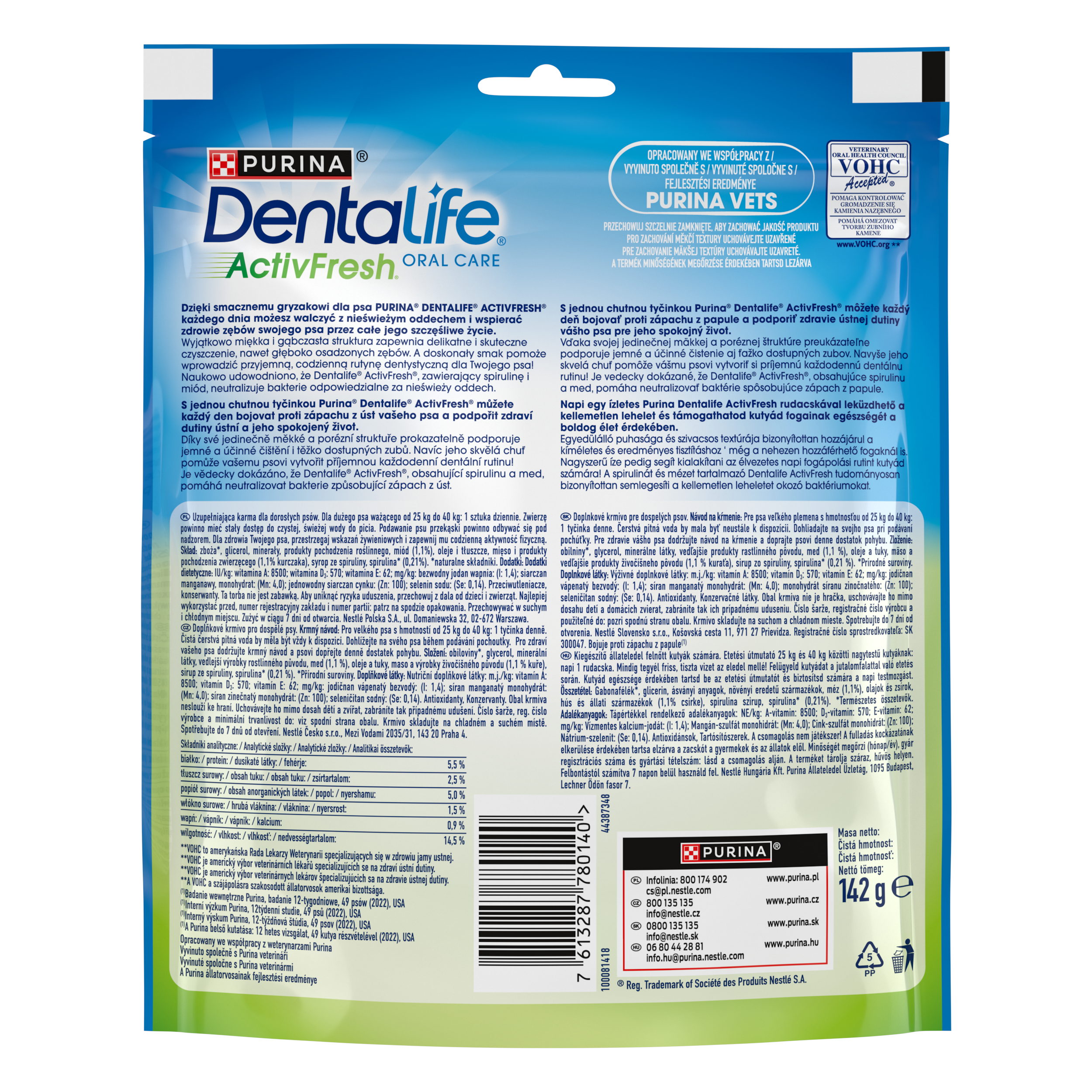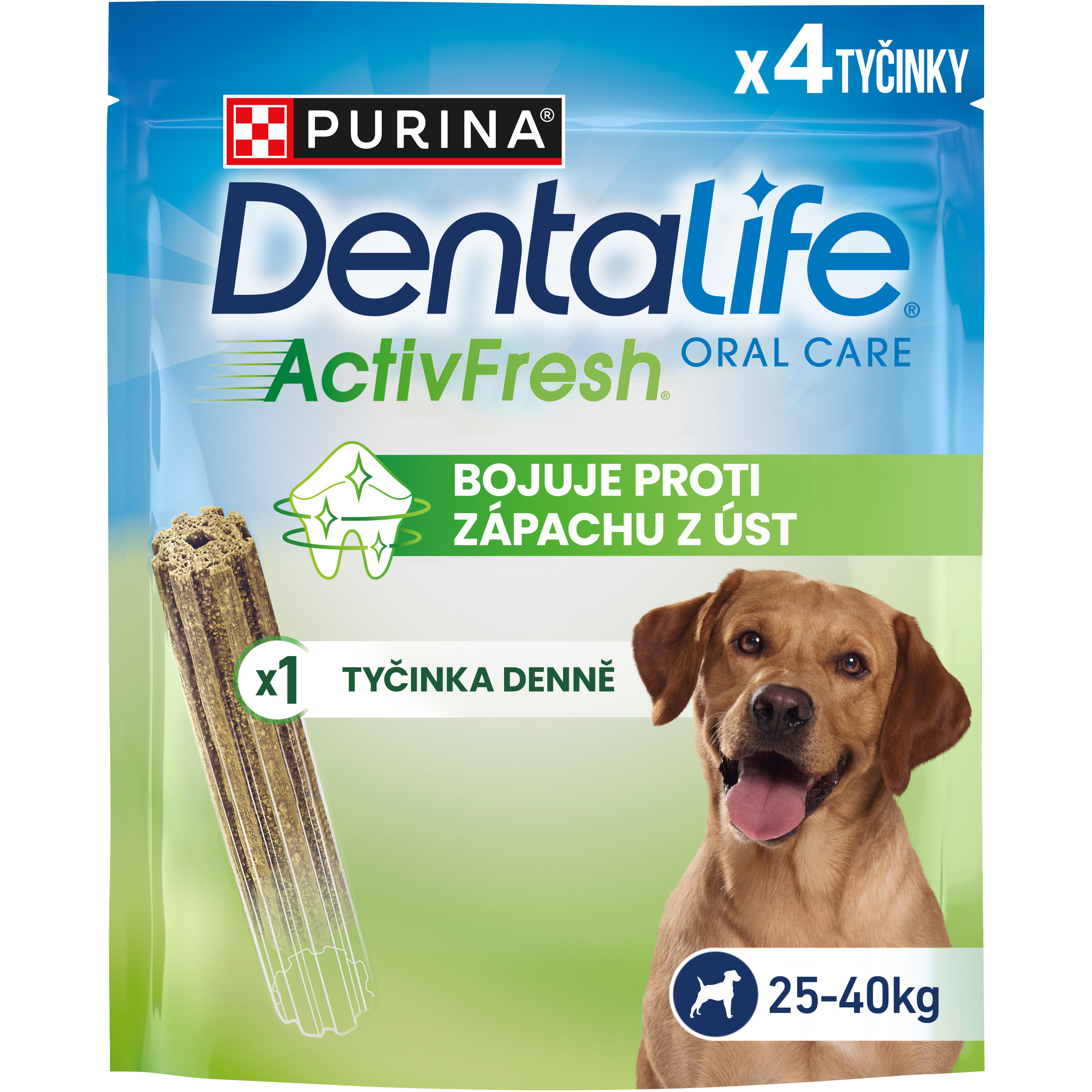 Doplňkové krmivo pro dospělé psy. S jednou chutnou tyčinkou Purina® Dentalife® ActivFresh® můžete každý den bojovat proti zápachu z úst vašeho psa a podpořit zdraví dutiny ústní a jeho spokojený život. Díky své jedinečně měkké a porézní struktuře prokazatelně podporuje jemné a účinné čištění i těžko dostupných zubů. Navíc jeho skvělá chuť pomůže vašemu psovi vytvořit příjemnou každodenní dentální rutinu! Je vědecky dokázáno, že Dentalife® ActivFresh®, obsahující spirulinu a med, pomáhá neutralizovat bakterie způsobující zápach z úst.