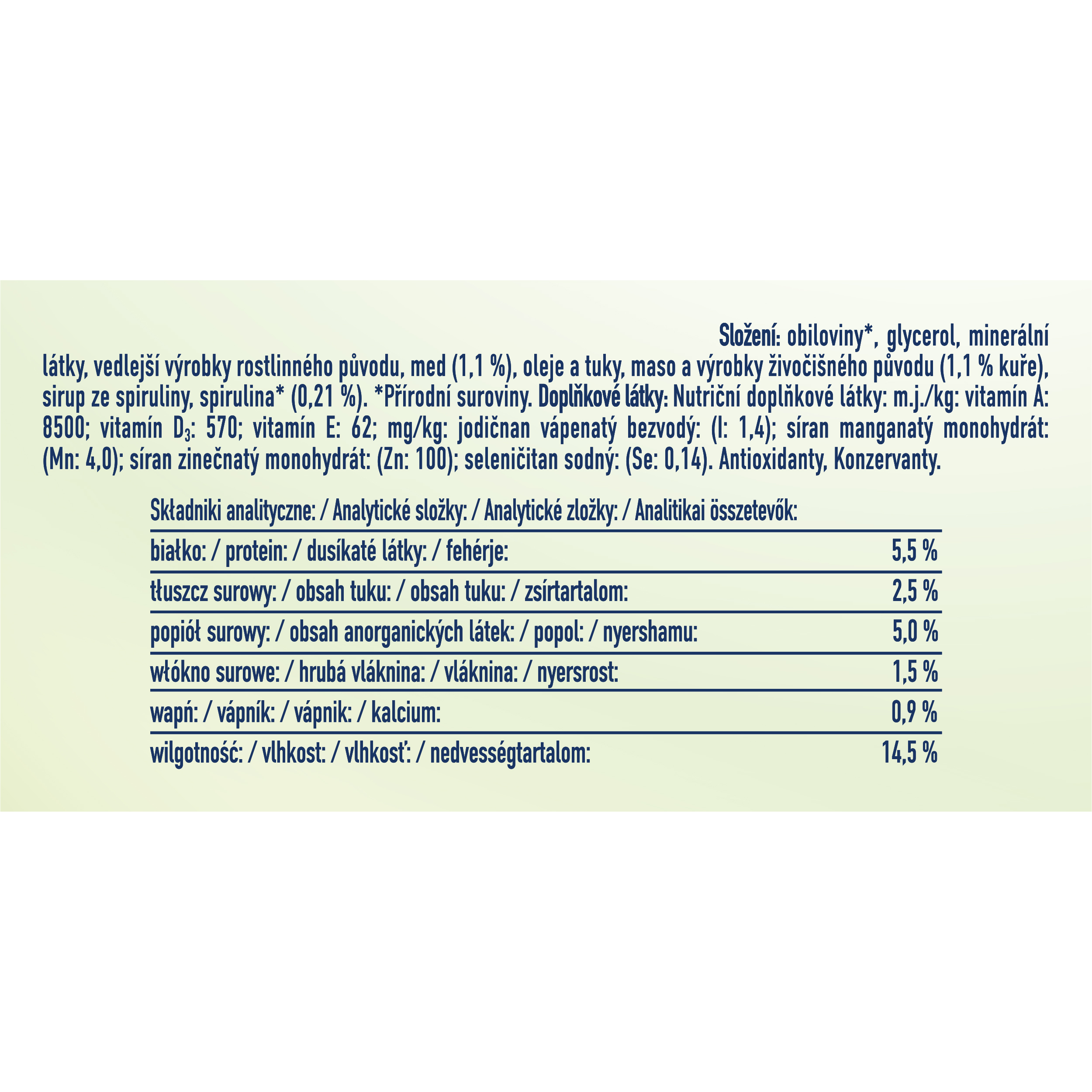 Složení: obiloviny*, glycerol, minerální látky, vedlejší výrobky rostlinného původu, med (1,1 %), oleje a tuky, maso a výrobky živočišného původu (1,1 % kuře), sirup ze spiruliny, spirulina* (0,21 %). *Přírodní suroviny.