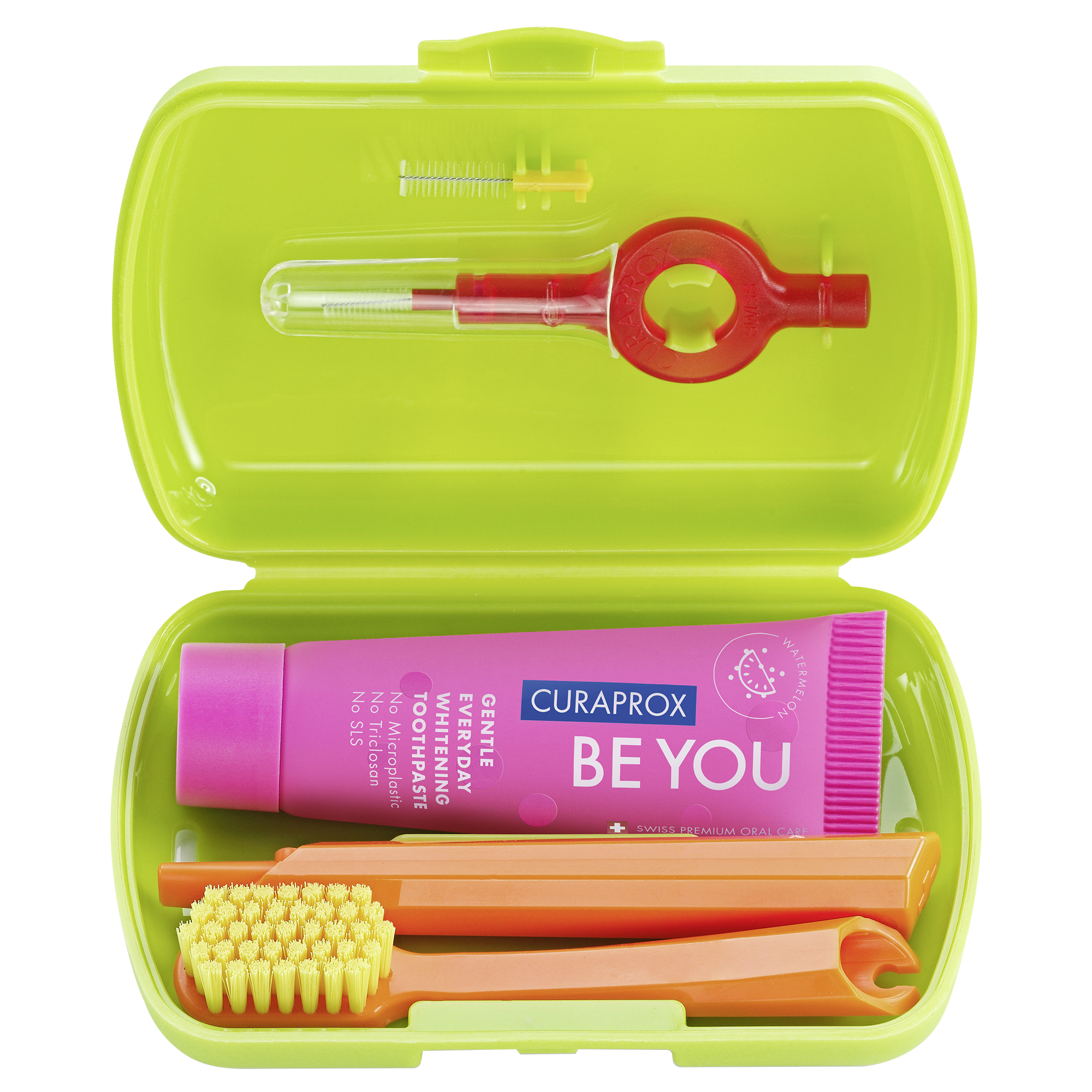 Už nemusíte dělat kompromisy. Na každé cestě můžete mít své pomocníky k dokonalé dentální hygieně vždy při sobě. Travel set je dostupný v několika variantách, které se liší barvou pouzdra a příchutí zubní pasty. Tato verze je v zelené barvě.