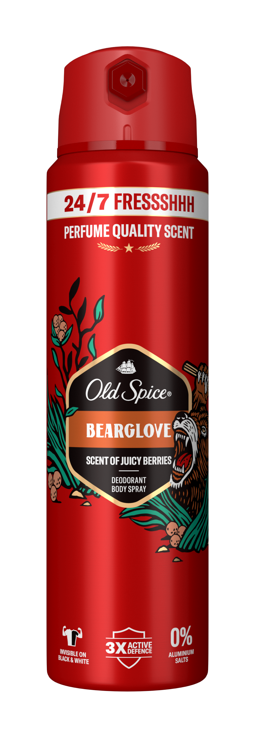 Dopřej si svěžest* 24 hodin denně, 7 dní v týdnu a voňtastické sebevědomí díky Bearglove deodorantu ve spreji Old Spice. A s touto úrovní bezstarostné svěžesti se můžeš soustředit na vyšší cíle, jako je uzavírání velkých obchodů nebo učení delfínů lidské řeči. UVOLNĚTE SLOŽENÍ 3× ACTIVE DEFENCE: Dlouhotrvající vůně / ochrana před zápachem / se složkami proti zápachu, takže budete vonět legendárně 24 hodin denně, 7 dní v týdnu* Tato vůně šťavnatých bobulí, pikantních citrusů, svěžího jablka s dotekem koření z tebe udělá lesního dravce, kterému nelze odolat. A zmínili jsme, že neobsahuje žádné hliníkové soli a zároveň je neviditelný na černém i bílém oblečení? Protože je to tak. *při každodenním používání