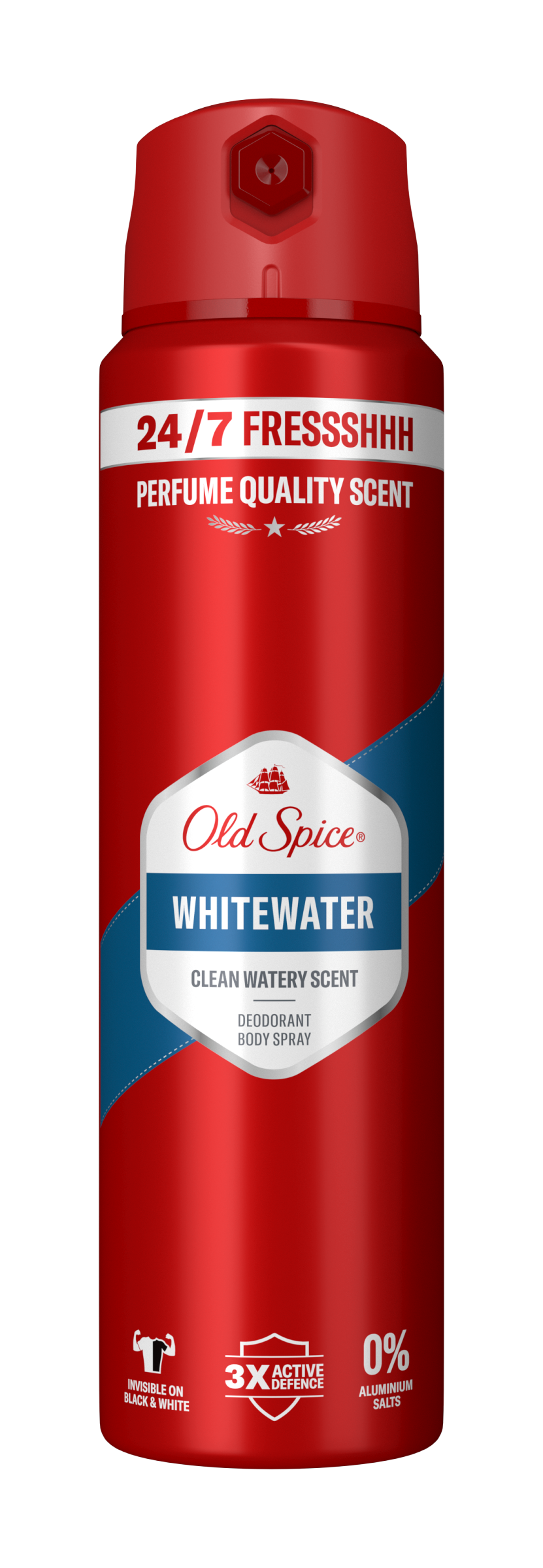 Dopřej si svěžest* 24 hodin denně, 7 dní v týdnu a voňtastické sebevědomí díky Whitewater deodorantu ve spreji Old Spice. A s touto úrovní bezstarostné svěžesti se můžeš soustředit na vyšší cíle, jako je uzavírání velkých obchodů nebo učení delfínů lidské řeči. UVOLNĚTE SLOŽENÍ 3× ACTIVE DEFENCE: Dlouhotrvající vůně / ochrana před zápachem / se složkami proti zápachu, takže budete vonět legendárně 24 hodin denně, 7 dní v týdnu* Díky vůni s čerstvými tóny vody, santalového dřeva, citrusů a jantaru budeš stejně neodolatelný jako zpěv Sirén. A zmínili jsme, že neobsahuje žádné hliníkové soli a zároveň je neviditelný na černém i bílém oblečení? Protože je to tak. *při každodenním používání