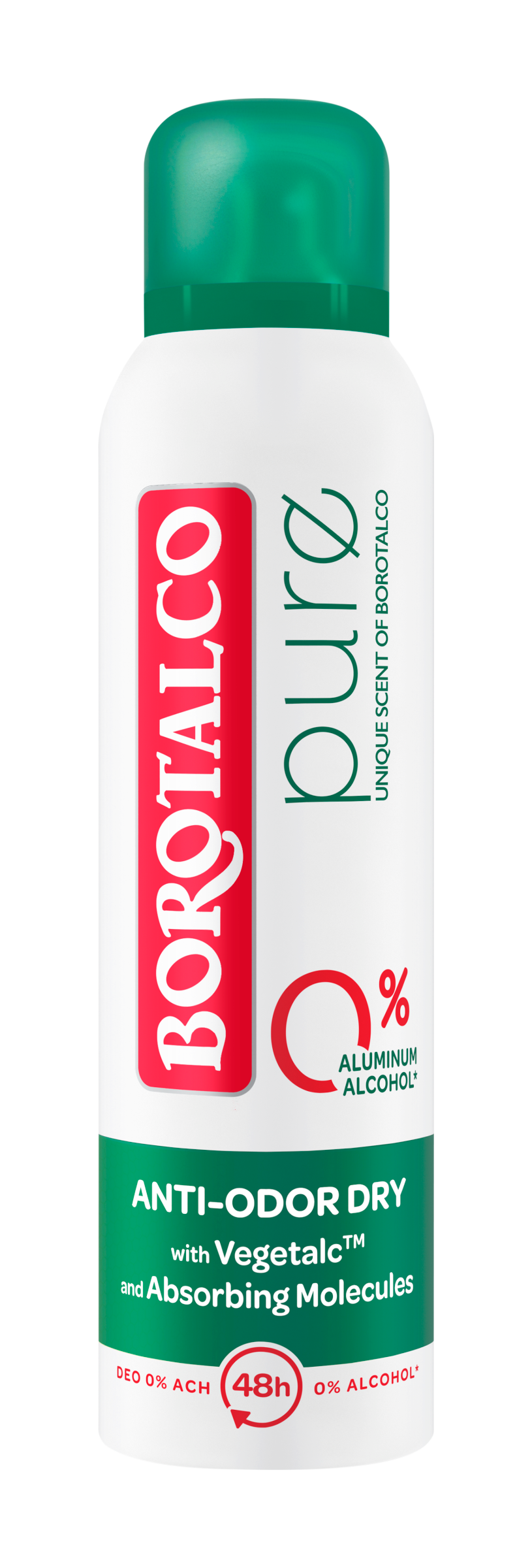 Oddejte se novému Borotalco® zážitku s deodorantem Pure! Extra účinnost v jemném složení s 0% solí, 0% alkoholu*. Obohacené o VegetalcTM, směs absorpčních prášků rostlinného původu, a absorpčními molekulami, exkluzivním mixem zinku a tapioky, pro suchý účinek a ochranu proti pachu bez kompromisů. 48hodinová účinnost deodorantu. Dermatologicky testováno.