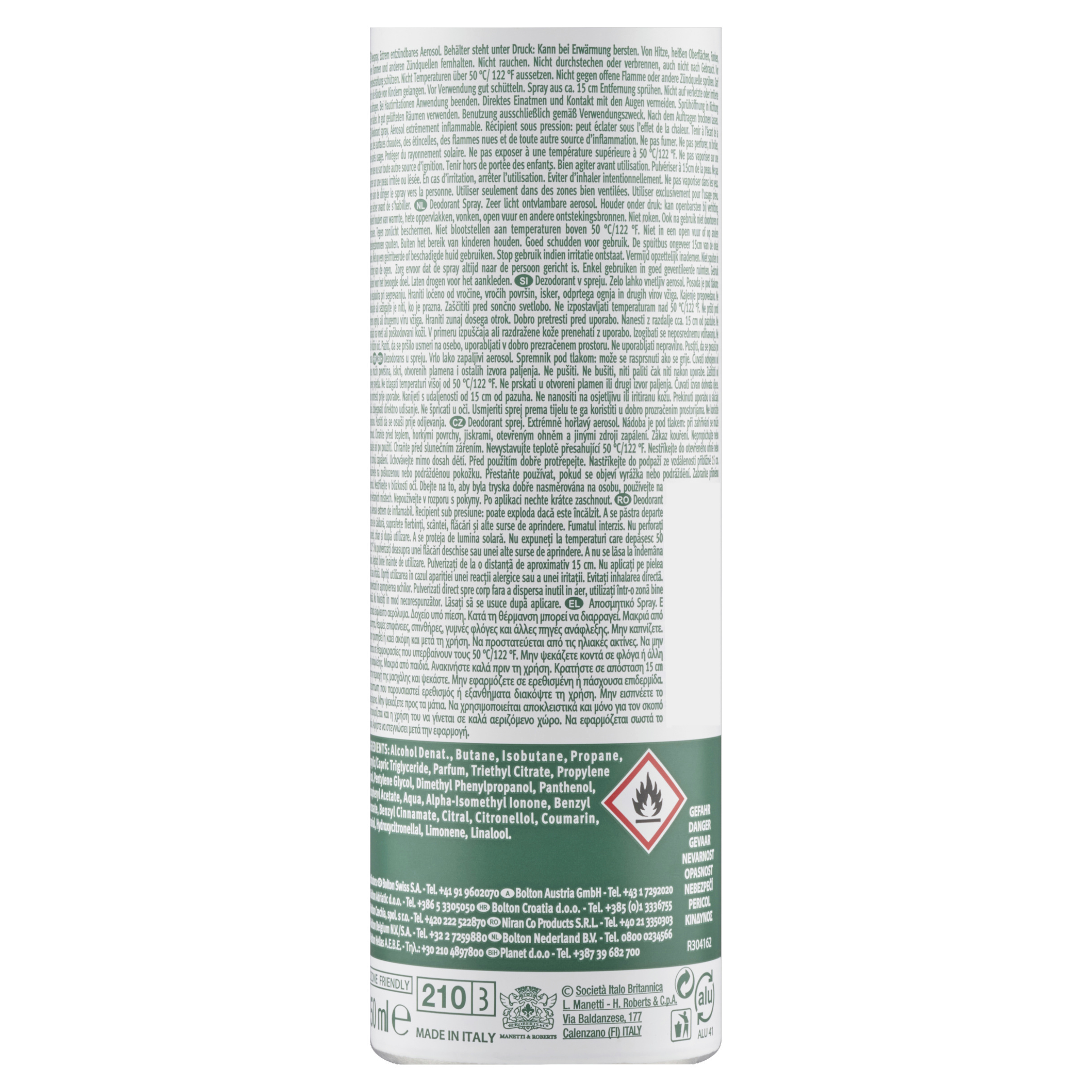 Deodorant sprej. Extrémně hořlavý aerosol. Nádoba je pod tlakem: při zahřívání se může roztrhnout. Chraňte před teplem, horkými povrchy, jiskrami, otevřeným ohněm a jinými zdroji zapálení. Zákaz kouření. Nepropichujte nebo nespalujte ani po použití. Chraňte před slunečním zářením. Nevystavujte teplotě přesahující 50 °C/122 °F. Nestříkejte do otevřeného ohně nebo jiných zdrojů zapálení. Uchovávejte mimo dosah dětí. Nepoužívejte na poškozenou nebo podrážděnou pokožku. Přestaňte používat, pokud se objeví vyrážka nebo podráždění. Zabraňte přímému vdechnutí. Nestříkejte v blízkosti oči. Dbejte na to, aby byla tryska dobře nasměrována na osobu, používejte na dobře větraných místech. Nepoužívejte v rozporu s pokyny.