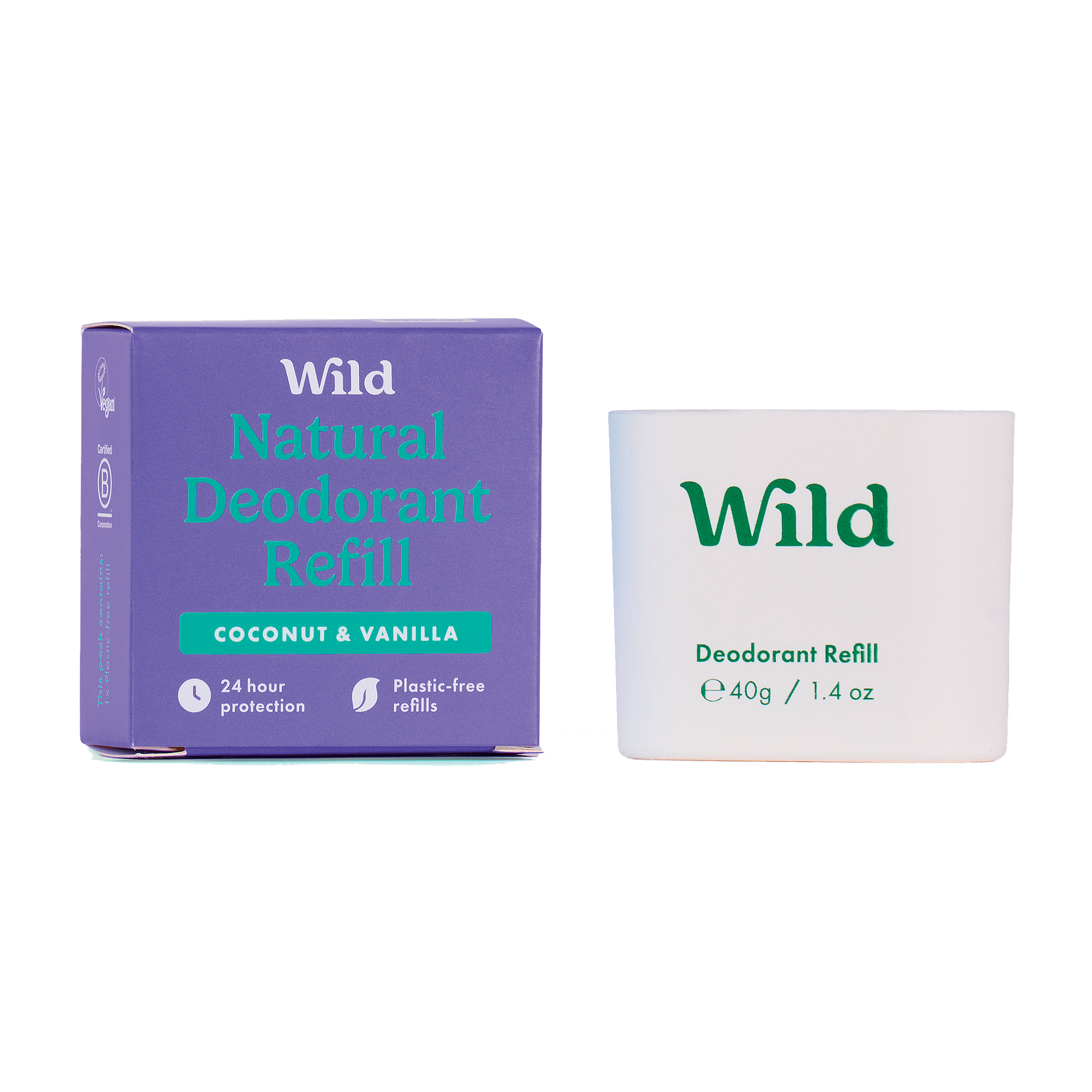 Přírodní deodorant Wild náhradní náplň s vůní Coconut & Vanilla. Náhradní náplň není testovaná na zvířatech, obsahuje jenom přírodní složky a je 100% vegan.