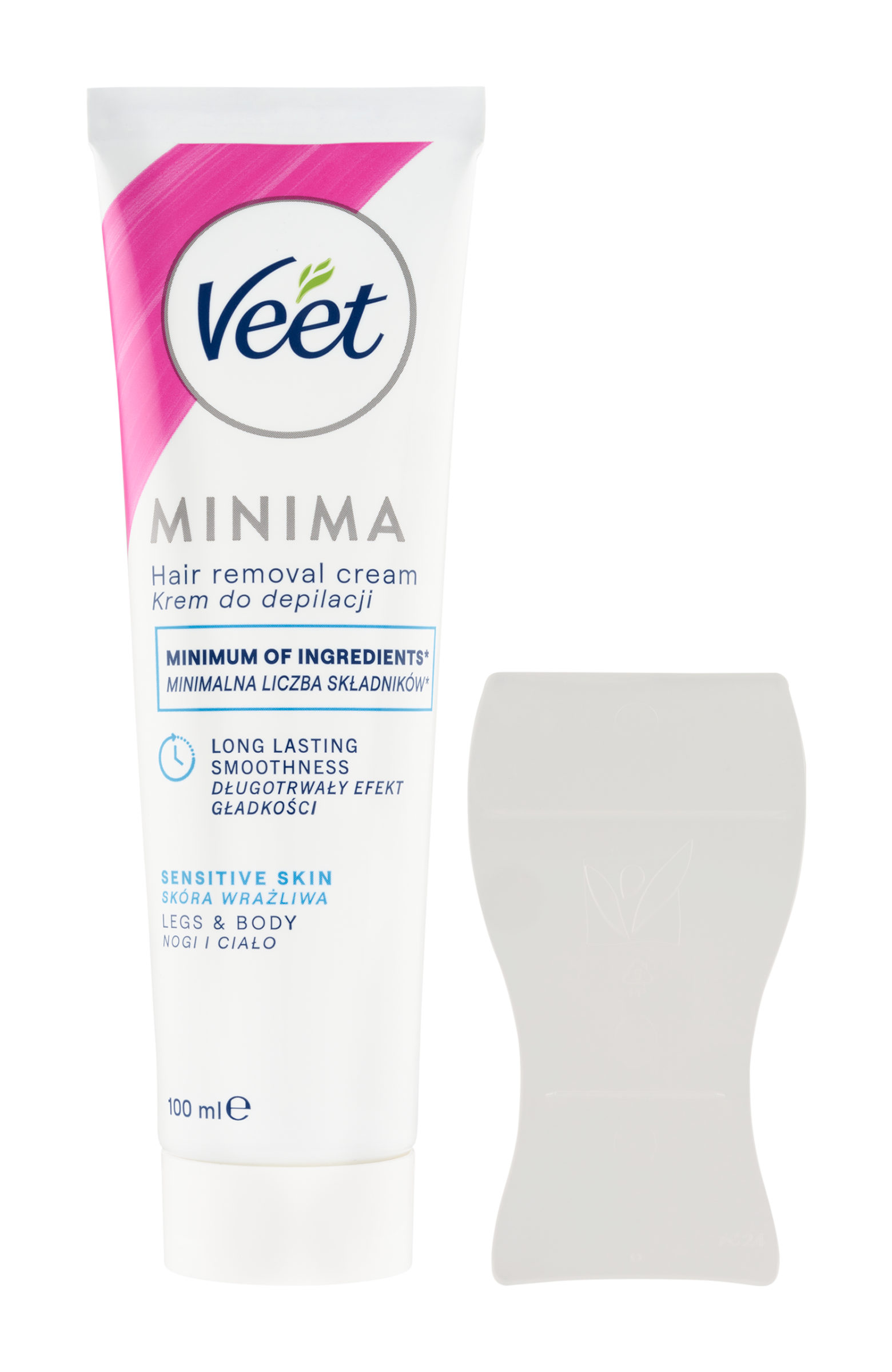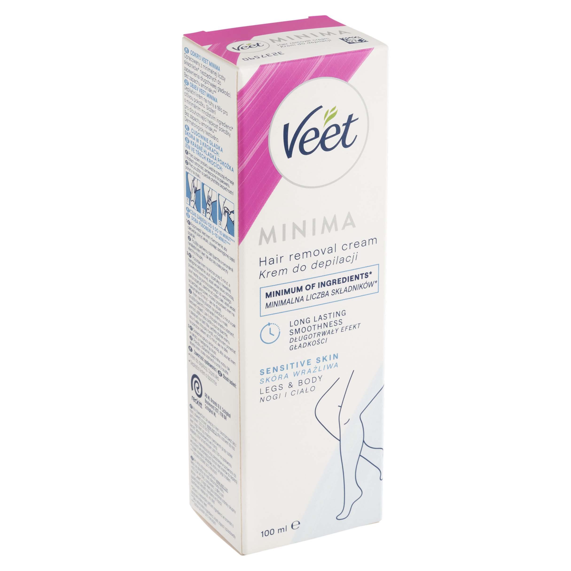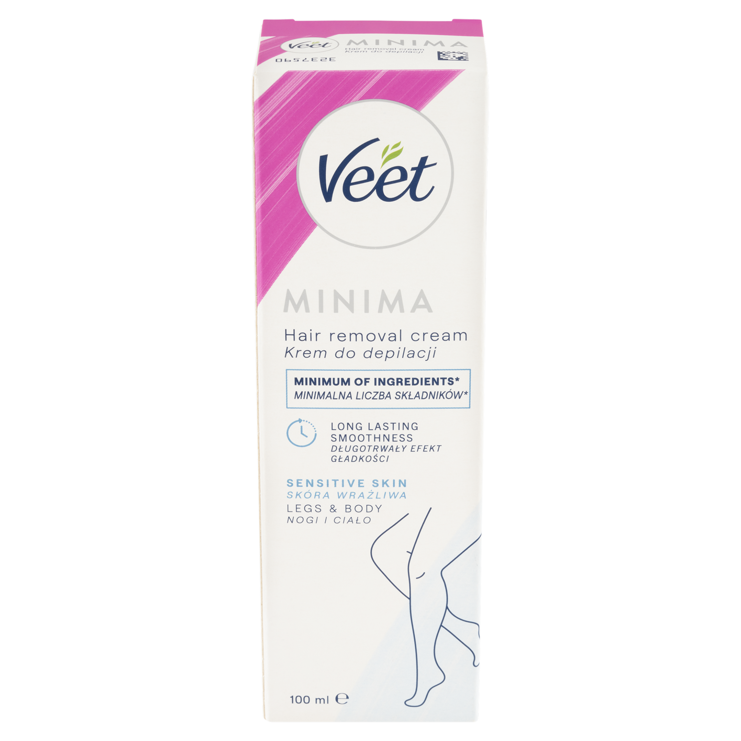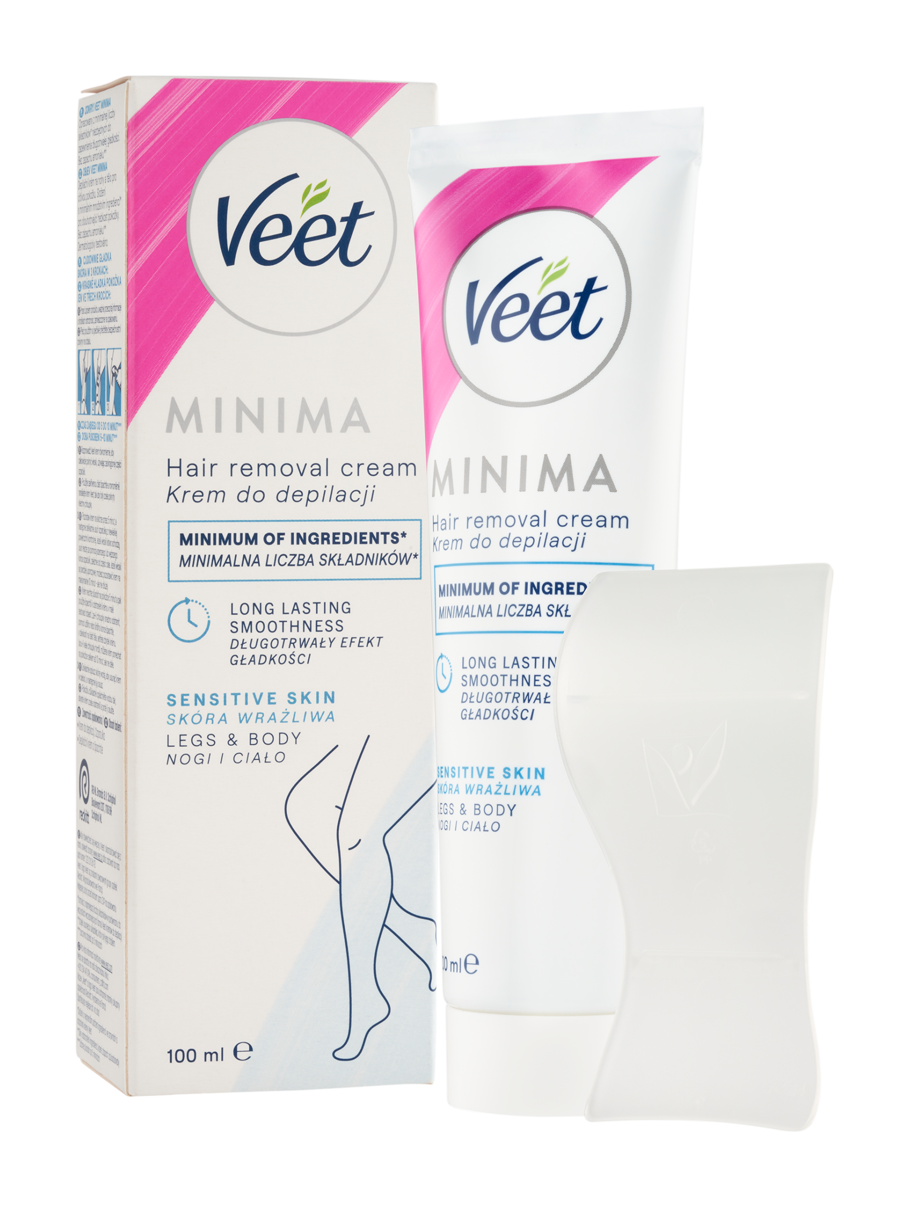 Objev Veet Minima Depilační krém na nohy a tělo pro citlivou pokožku. Složení s minimálním množstvím ingrediencí* pro dlouhotrvající hebkost pokožky. Bez zápachu amoniaku**. *Složení s nejmenším počtem ingrediencí ve srovnání s ostatními krémy Veet. **Díky odstranění ingrediencí, které zápach způsobovaly.