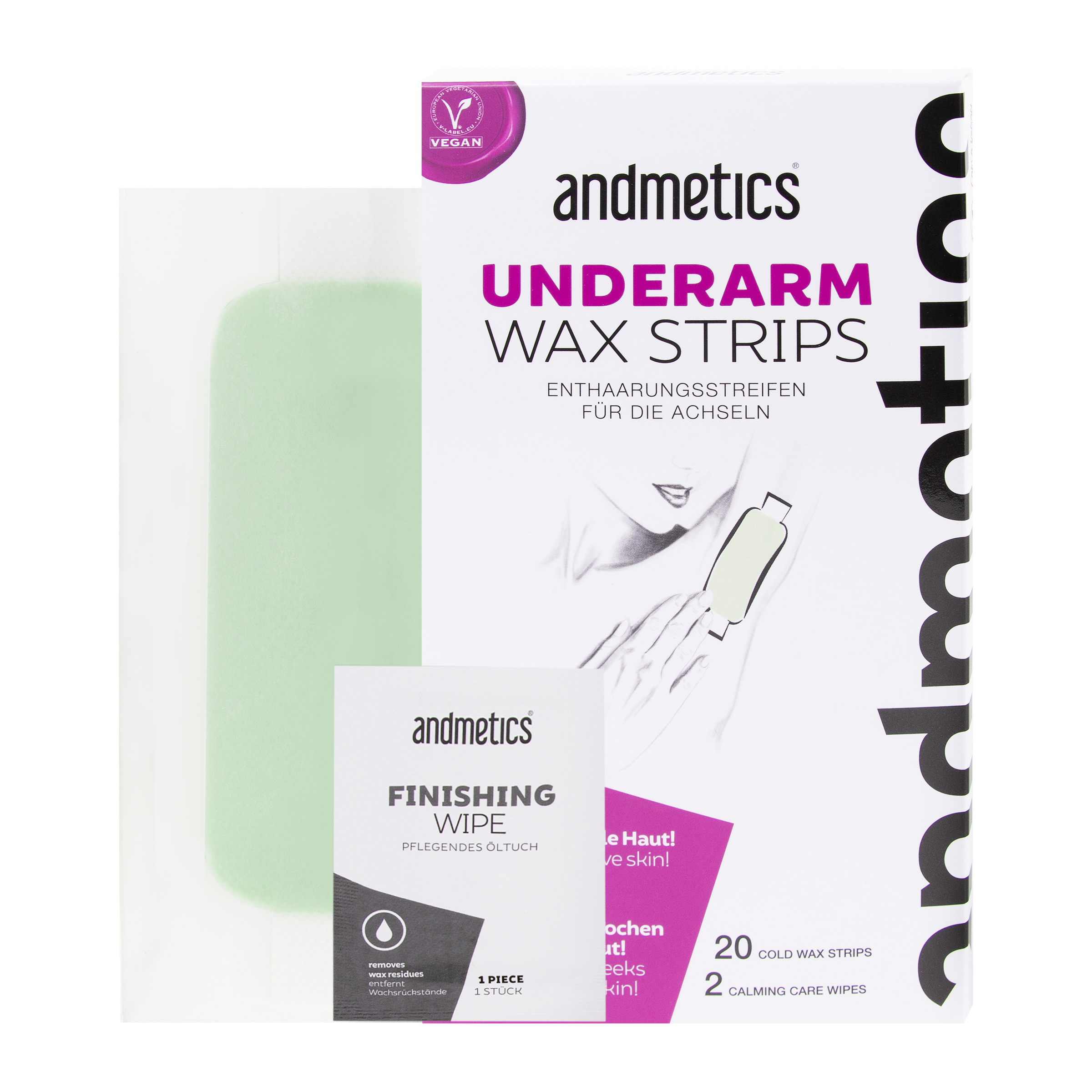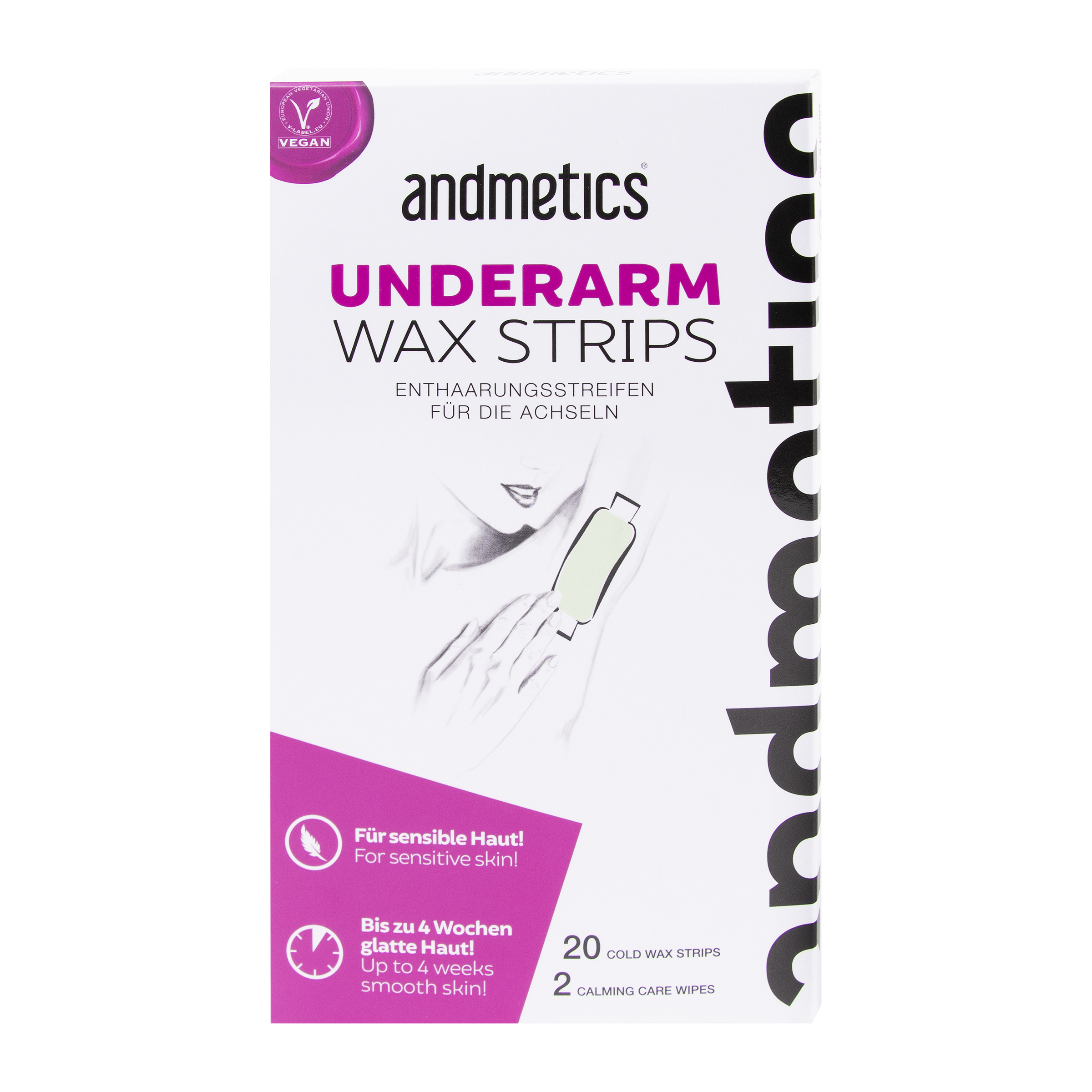 V PODPAŽÍ - Vždy v perfektní formě! Voskové pásky do podpaží andmetics jsou to pravé pro vás, pokud hledáte čisté, nekomplikované a rychlé odstranění chloupků v podpaží. Samotný vosk je formulován s přírodním extraktem z listů aloa, aby byla zajištěna maximální přilnavost k nežádoucím chloupkům. Super hladká pokožka bez chloupků, která vydrží až čtyři týdny. Voskové proužky andmetics UNDERARM do podpaží odstraní všechny nepříjemné chloupky během několika minut. Lze jej používat z domova a jeho použití je snadné a bezpečné. Proužky se nemusí zahřívat a jsou ihned připraveny k použití! Dokonale předtvarované proužky pro přesné odstranění chloupků v podpaží – pro všechny typy pleti.