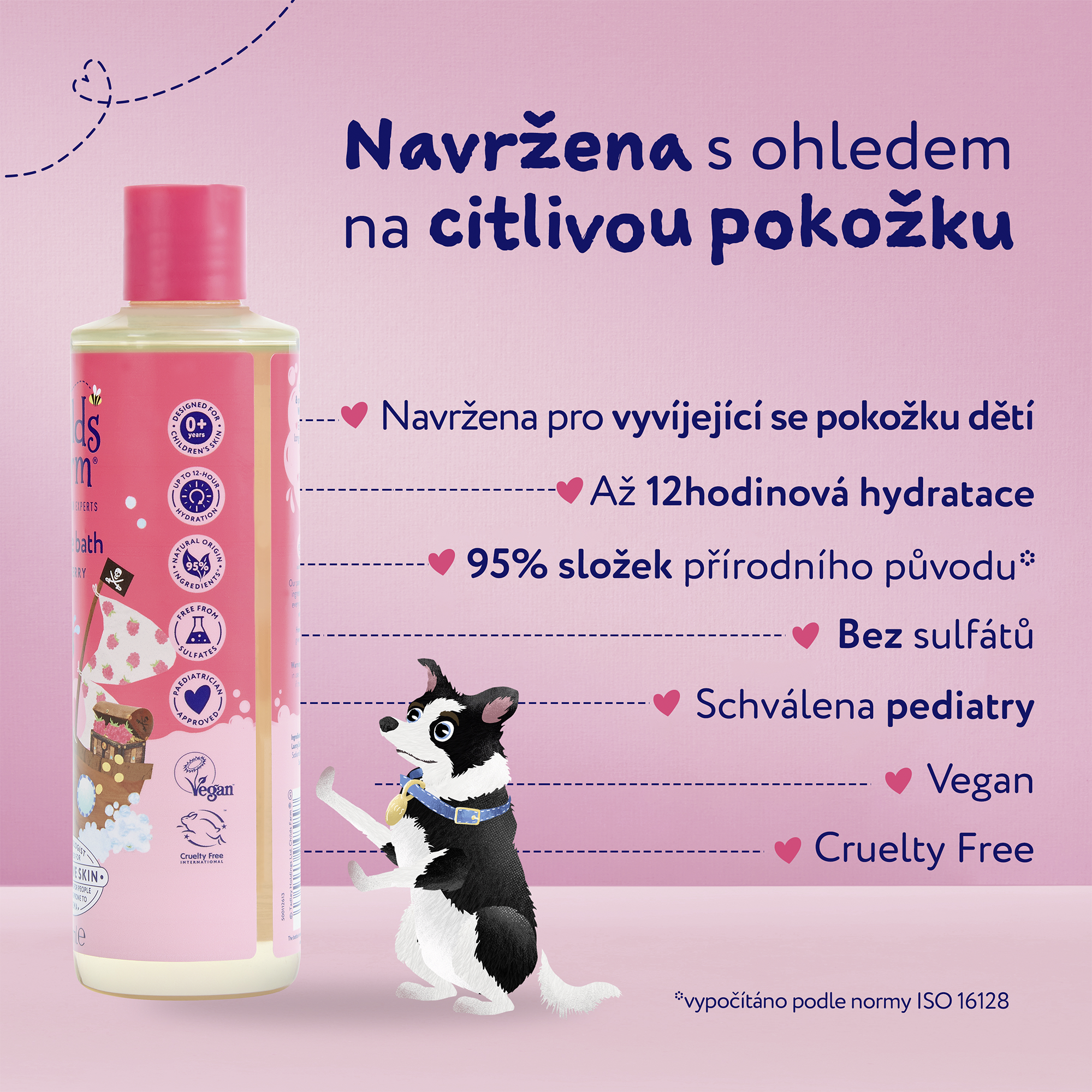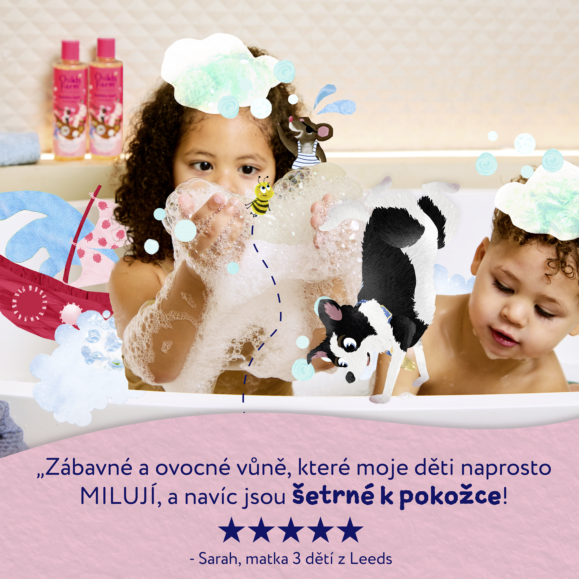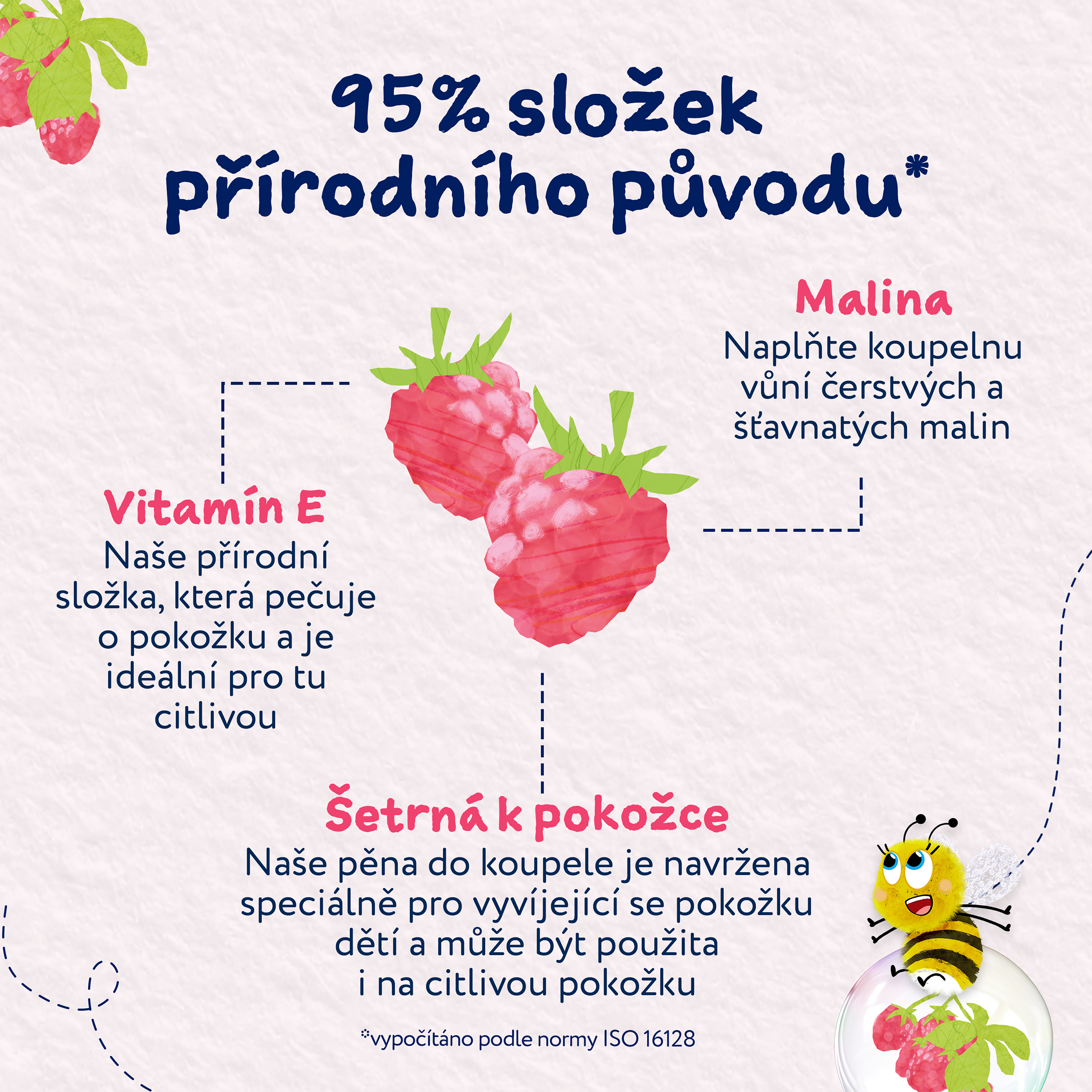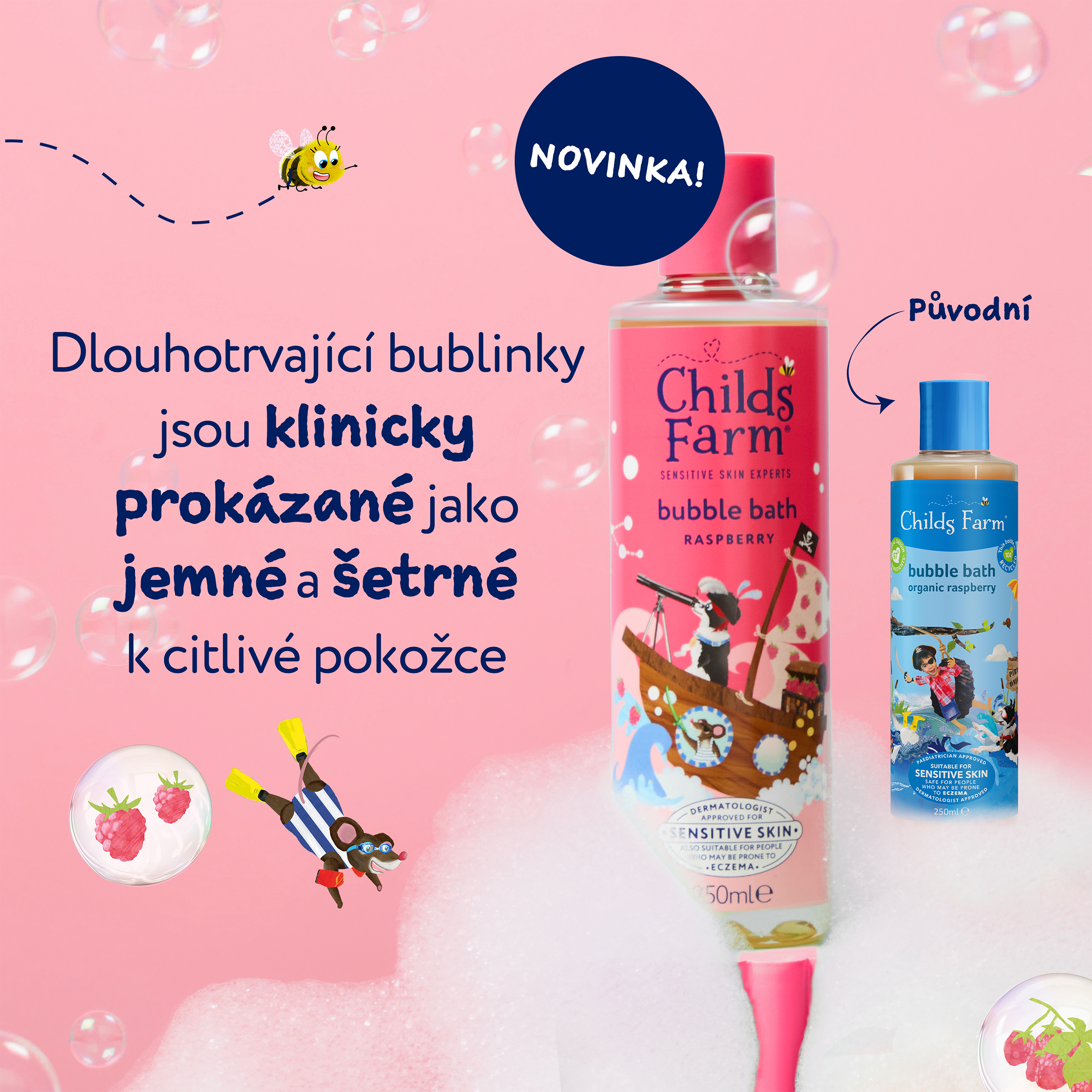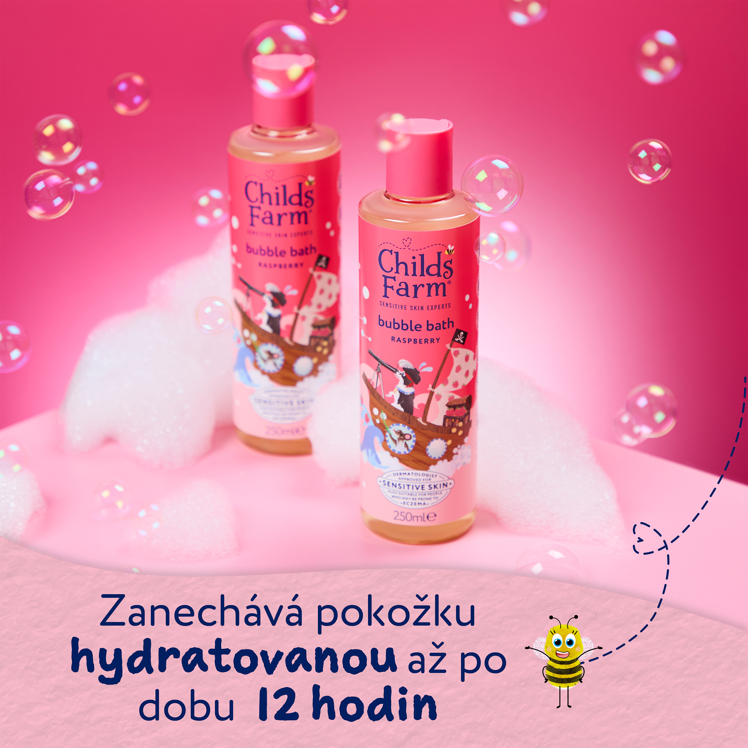 Dětská bublinková koupel s úžasnou vůní maliny obsahuje jemné čistící složky, díky kterým zůstane pokožka nejen čistá ale také hydratovaná až po dobu dvanácti hodin. Bublinková koupel je vhodná od narození, pro všechny typy pokožky, a to včetně té citlivé a se sklonem k ekzémům. Produkty Childs Farm jsou schválené dermatology i pediatry a nesou označení vegan a cruelty free.