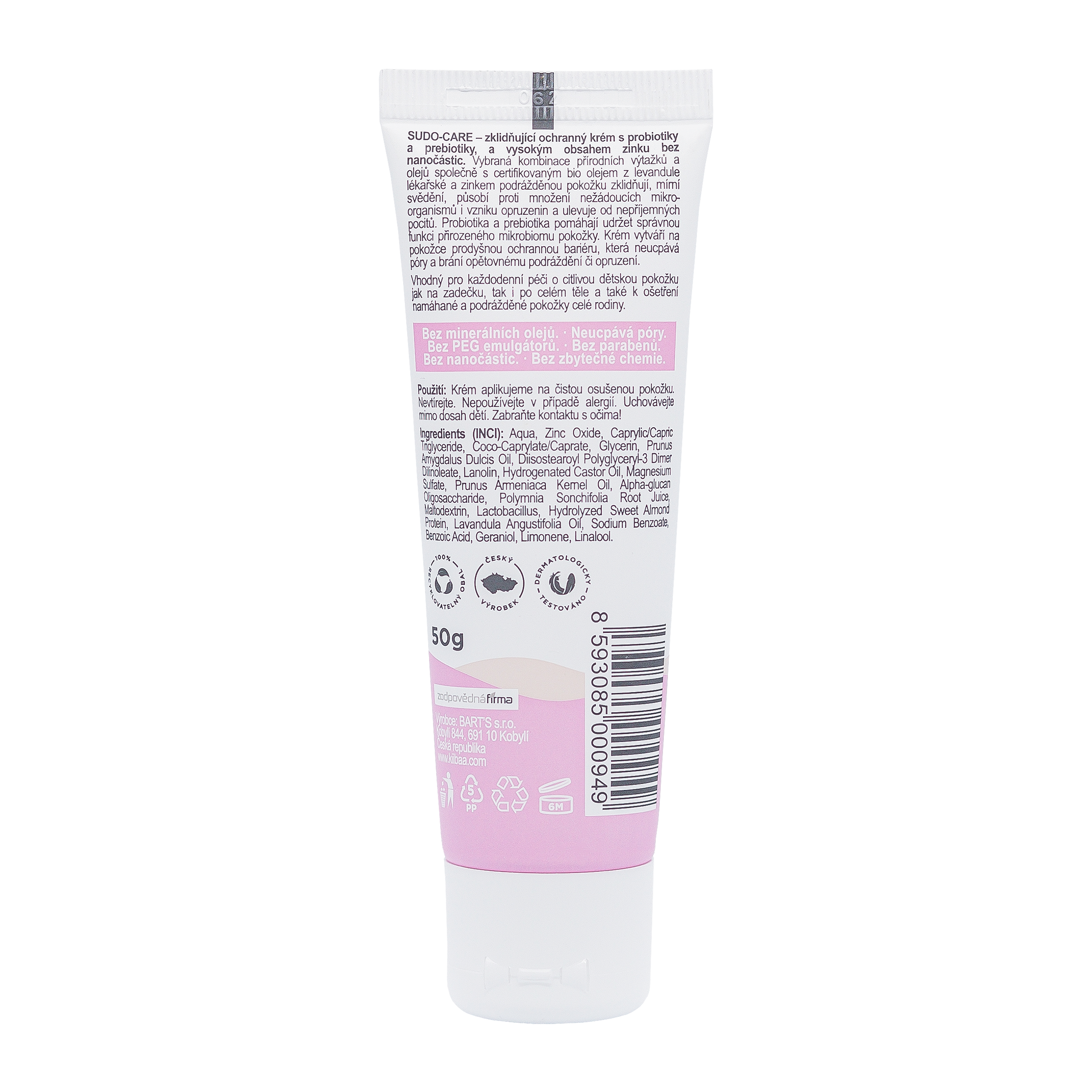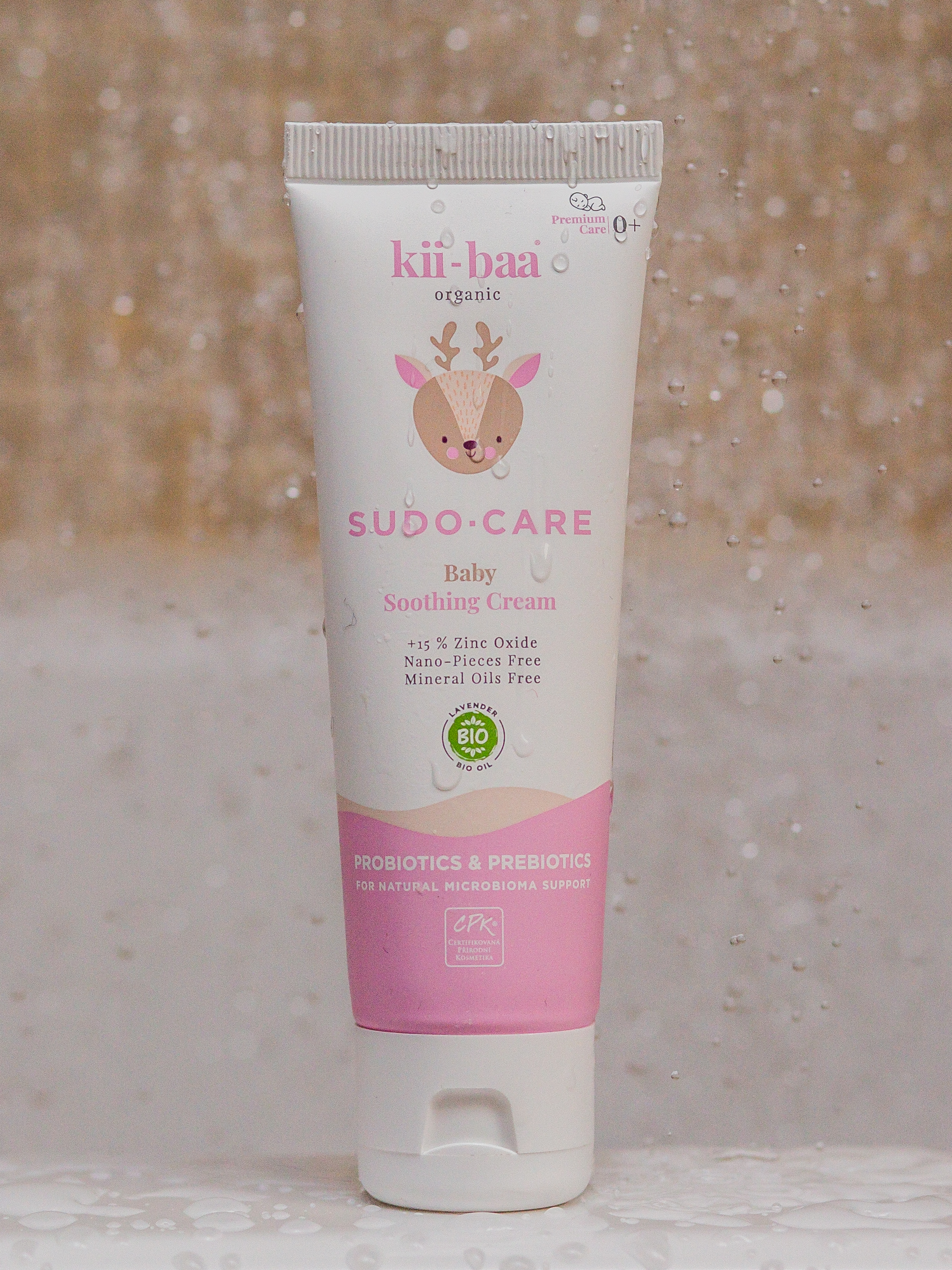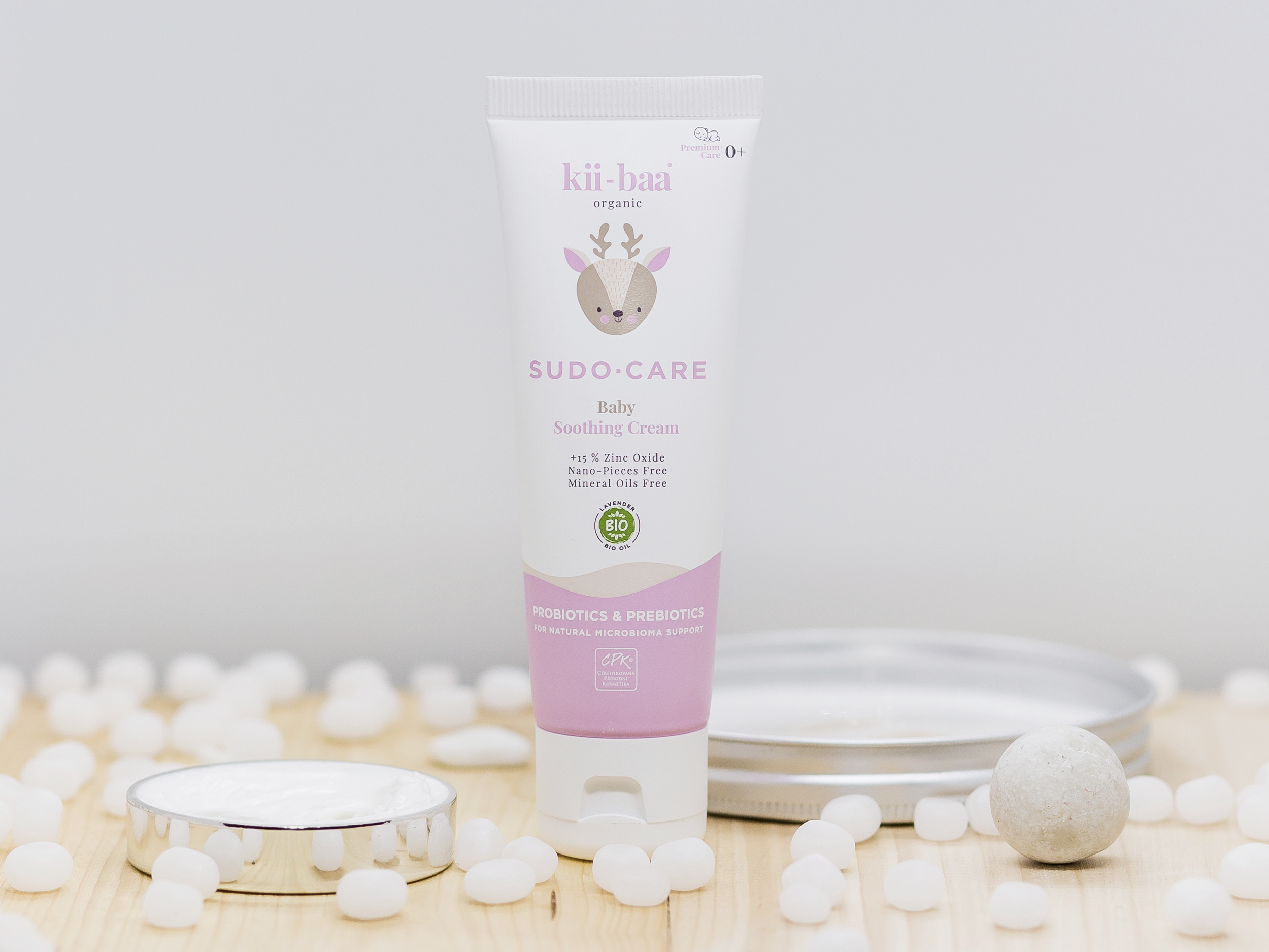 Zklidňující ochranný krém kii-baa® organic s probiotiky a prebiotiky a vysokým obsahem zinku bez nanočástic.