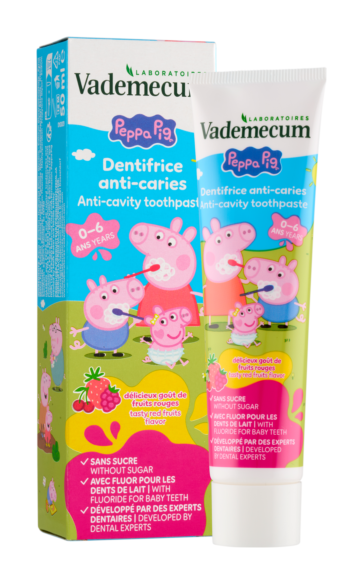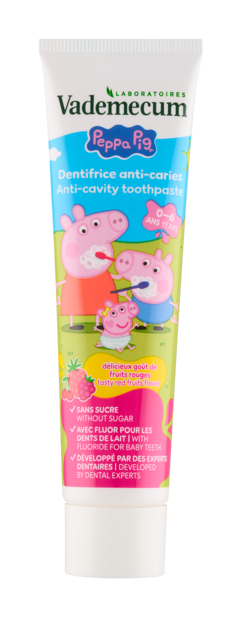 Vademecum x Peppa zubní pasta proti zubnímu kazu pro děti od 0 do 6 let: s fluoridem, příjemnou příchutí červeného ovoce a bez cukru, bez oxidu titaničitého a SLS. Obsahuje fluorid sodný (1 000 ppm F⁻).