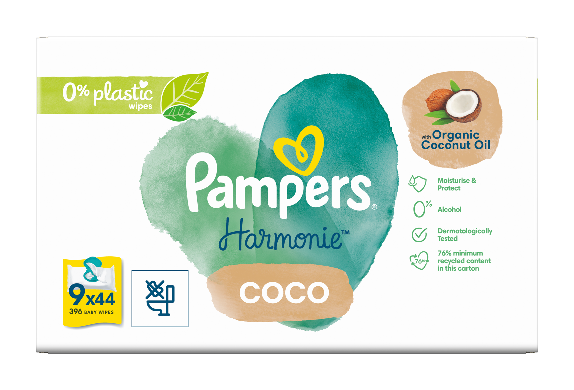 Pokožka vašeho děťátka je velmi citlivá a zaslouží si šetrné čištění. Dětské čisticí ubrousky Pampers Harmonie Coco obsahují organický kokosový olej, který hydratuje a chrání citlivou pokožku vašeho děťátka. Obsahují 0 % plastů, jsou vyrobené pouze ze 100% rostlinných vláken. Enzymy v moči a stolici mění pH pokožky a zvyšují riziko podráždění a vyrážky. Jedinečné složení dětských čisticích ubrousků Pampers Harmonie Coco je dermatologicky testované a chrání přirozené pH pokožky lépe než vodou navlhčená bavlněná látka. Ubrousky tak snižují riziko podráždění pokožky. Protože jsou vlhčené čisticí ubrousky Pampers Harmonie Coco navržené s ohledem na citlivou pokožku novorozenců, jsou bez alkoholu a barviv.