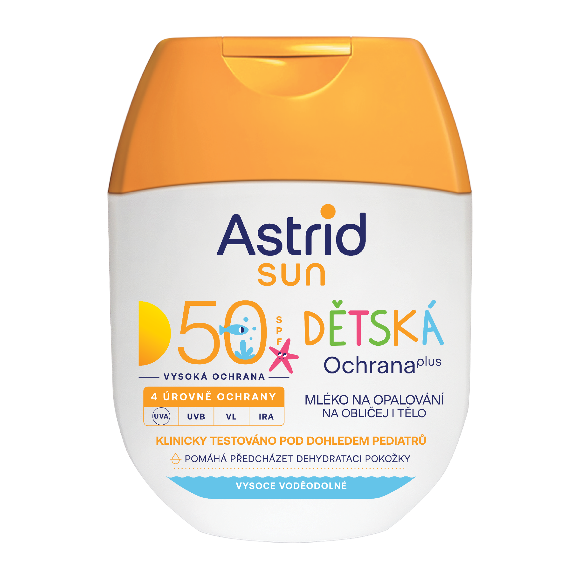 Dětské mléko na opalování SPF 50 Astrid Sun je jiný Astrid Sun nabízí mnohem více než jen základní ochranu proti slunci. Zohledňuje speciální dermatologické potřeby dětí a poskytuje optimální ochranu před 4 hlavními typy slunečního záření (UVA, UVB, VL*, IRA), které poškozují pokožku. Zároveň pomáhá minimalizovat riziko alergických reakcí.