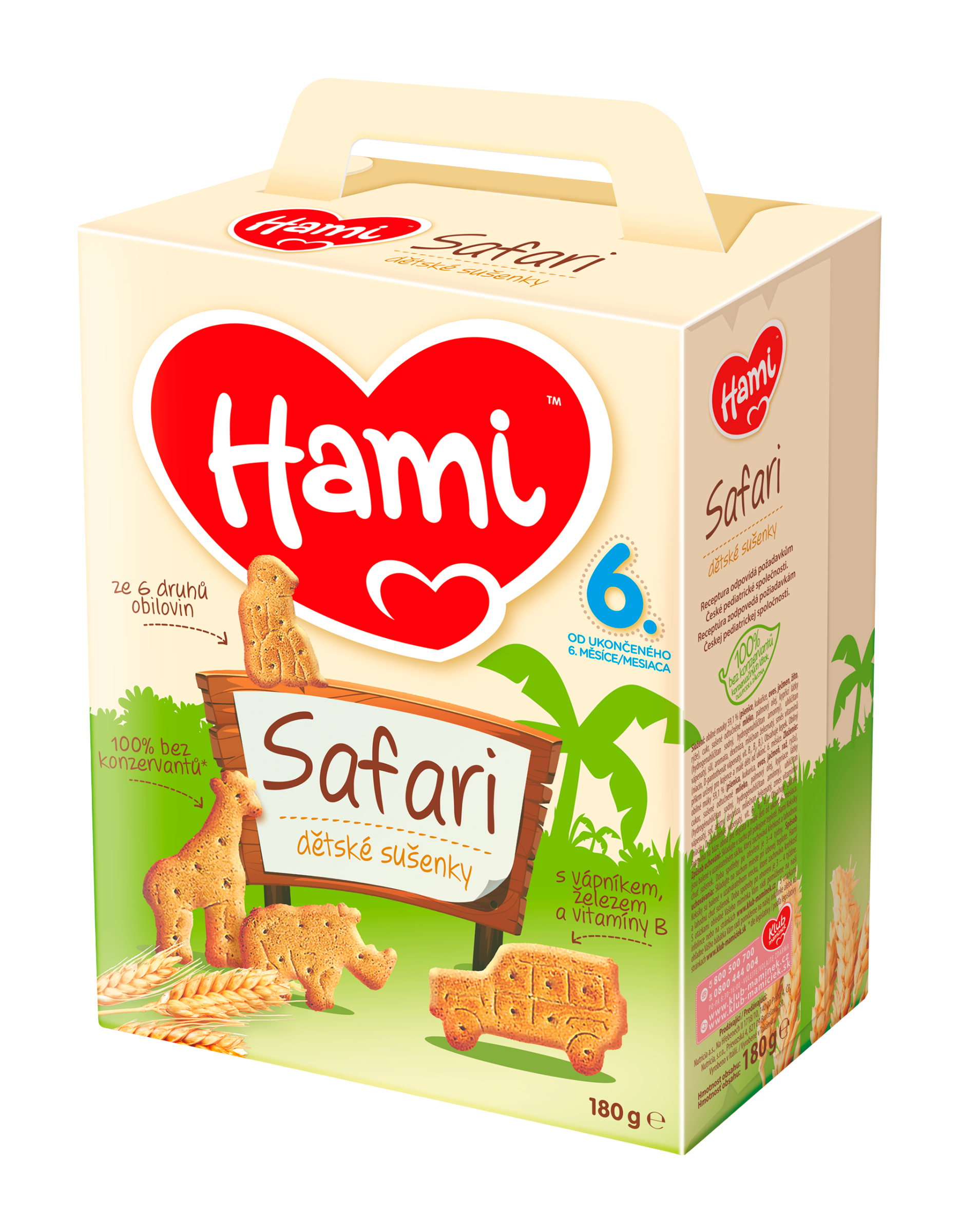 Obilné křupavé sušenky Hami Safari jsou vhodné pro miminka od ukončeného 6. měsíce života.
