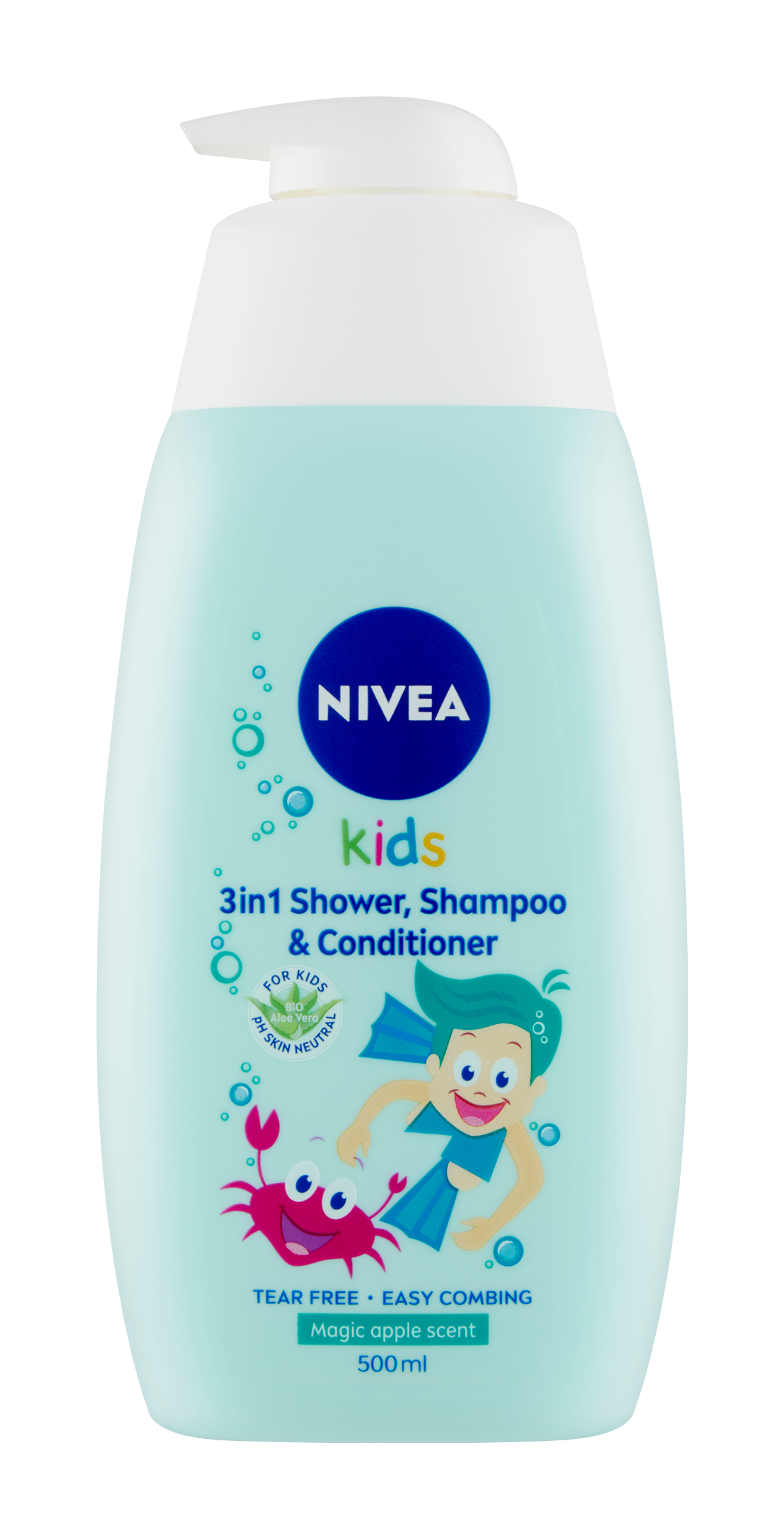 Nivea® Kids Sprchový gel, šampon a kondicionér 3 v 1 s bio aloe vera a heřmánkem šetrně myje a pečuje o jemnou dětskou pokožku a vlásky.