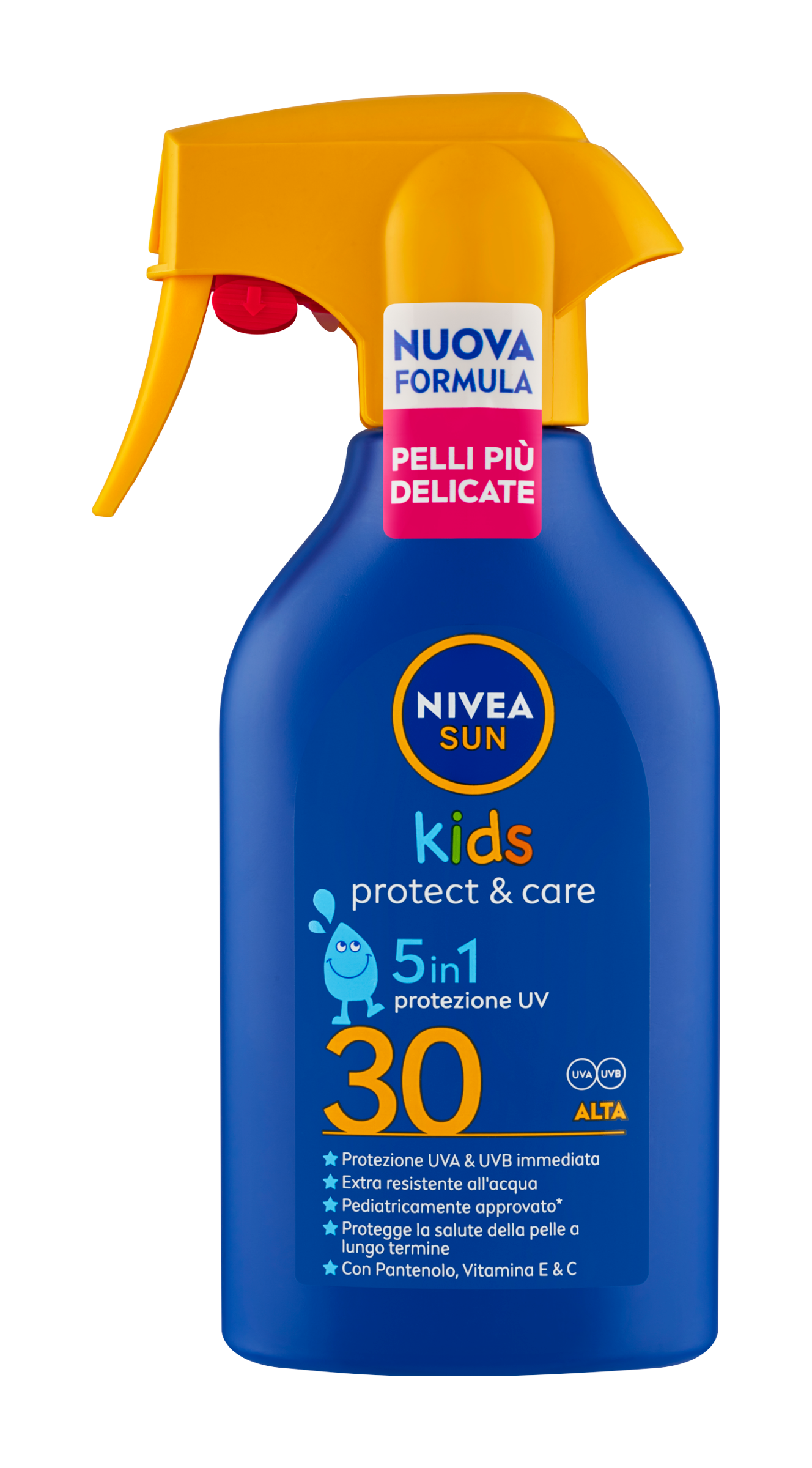 Extra voděodolné složení s pečlivě vybranými UV filtry poskytuje okamžitou UVA a UVB ochranu a chrání tak před poškozením UV zářením. Pečující složení s panthenolem, vitamínem E a C bylo vyvinuto pro jemnou dětskou pokožku od 3 let. Pomáhá chránit dlouhodobé zdraví pokožky. Složení respektuje oceány - neobsahuje UV filtry octinoxate, oxybenzone, octocrylene a je bez mikroplastů.