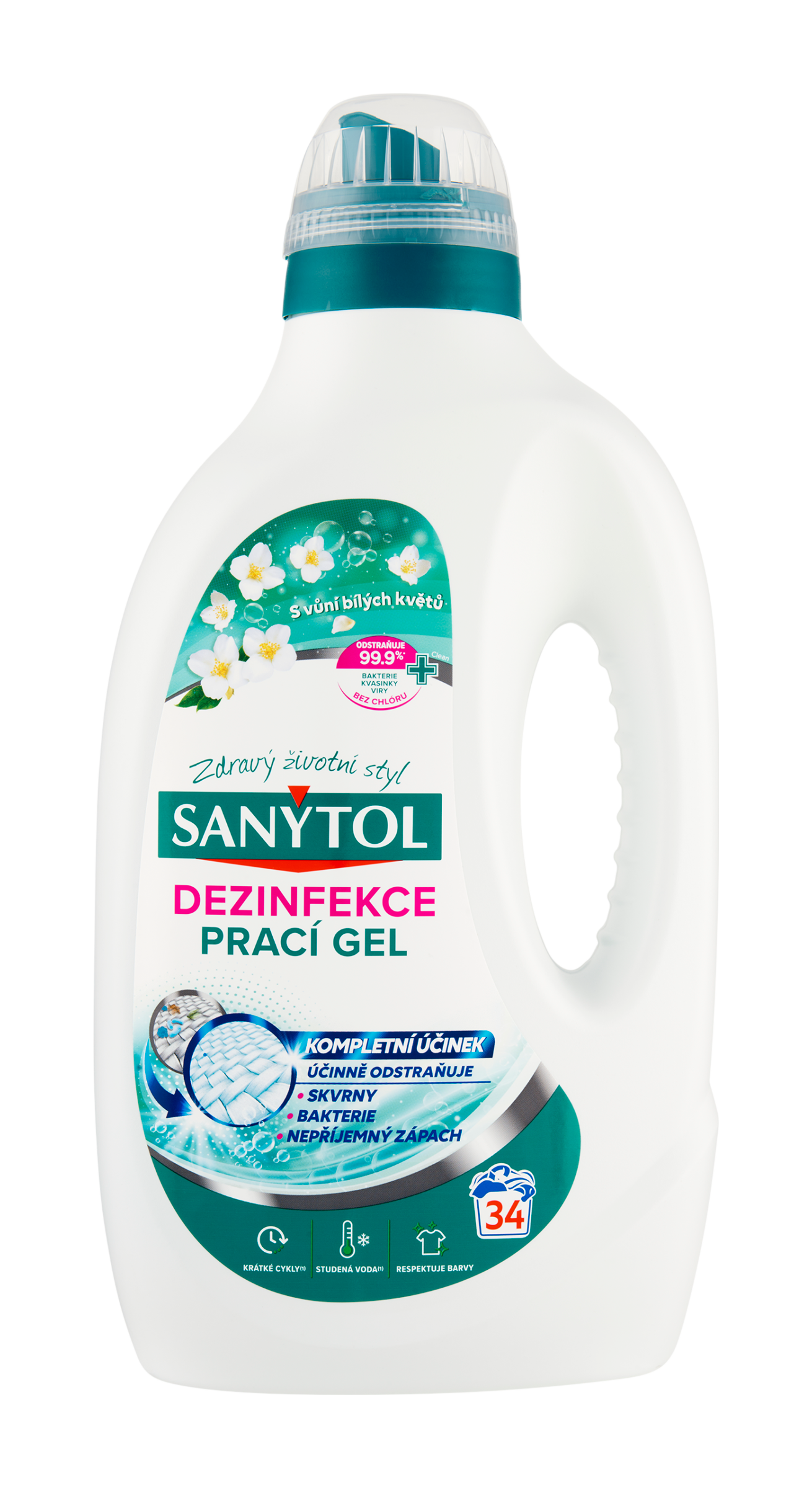Odstraňuje 99,9%* bakterie, kvasinky, viry. Po běžném vyprání nemusí být vaše prádlo zcela čisté, často na něm zůstávají skvrny nebo bakterie a způsobují nepříjemný zápach. Řešením je dezinfekční prací prostředek Sanytol, který díky svému jedinečnému a šetrnému složení dosáhne během jediného praní zcela čistého prádla. Odstraní skvrny, mikroorganismy a nepříjemný zápach až do hloubky vláken. Je také účinný při nízkých teplotách, krátkých pracích programech, na bílé a barevné prádlo a zanechává intenzivní vůni bílých květů. Krátké cykly⁽¹⁾ Studená voda⁽¹⁾