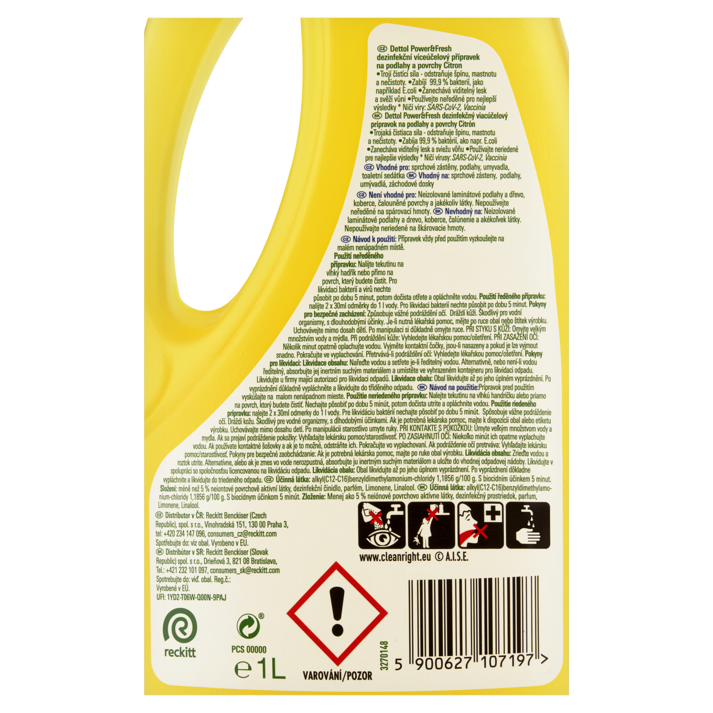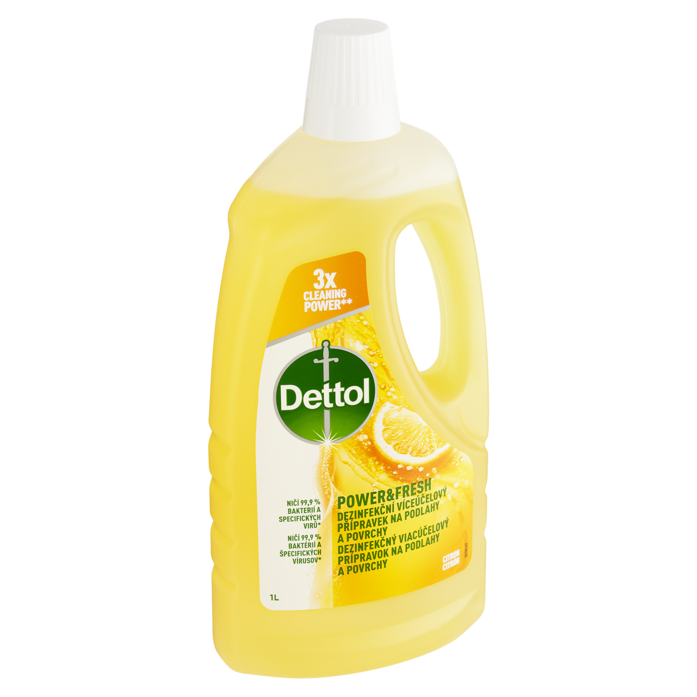 Dezinfekční přípravek na podlahy a povrchy Dettol Power & Fresh Citron je silný dezinfekční čistič na podlahy a všechny omyvatelné povrchy, který spojuje hygienickou účinnost s příjemnou svěží vůní. Díky trojici účinných vlastností snadno odstraní mastnotu, usazenou špínu i každodenní nečistoty a zároveň spolehlivě zlikviduje 99,9 % bakterií včetně E.coli a specifických virů* jako SARS-CoV-2. Při použití neředěného přípravku získáte maximální dezinfekční účinek, zářivý lesk a dlouhotrvající čistotu – ideální pro důkladný úklid celé domácnosti.