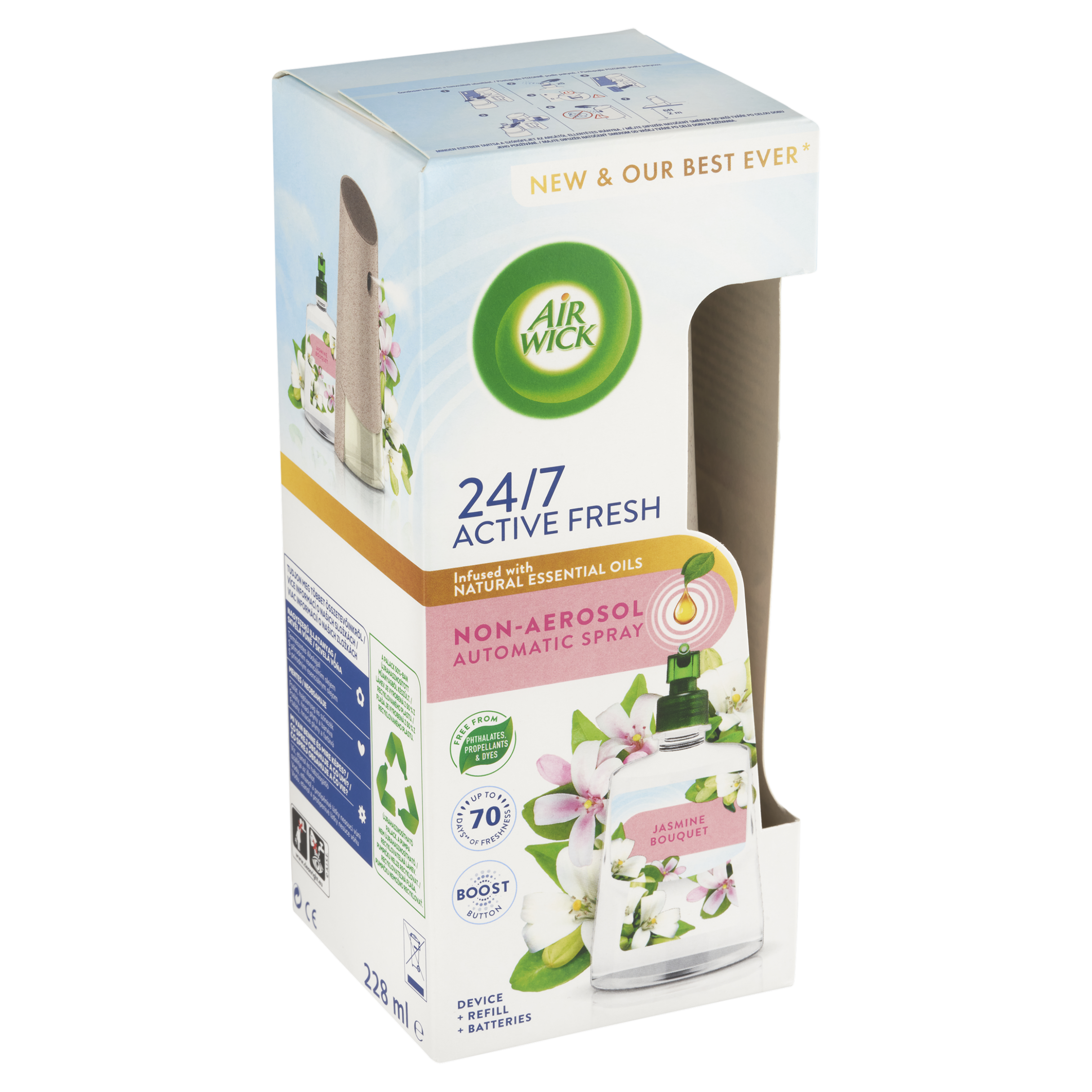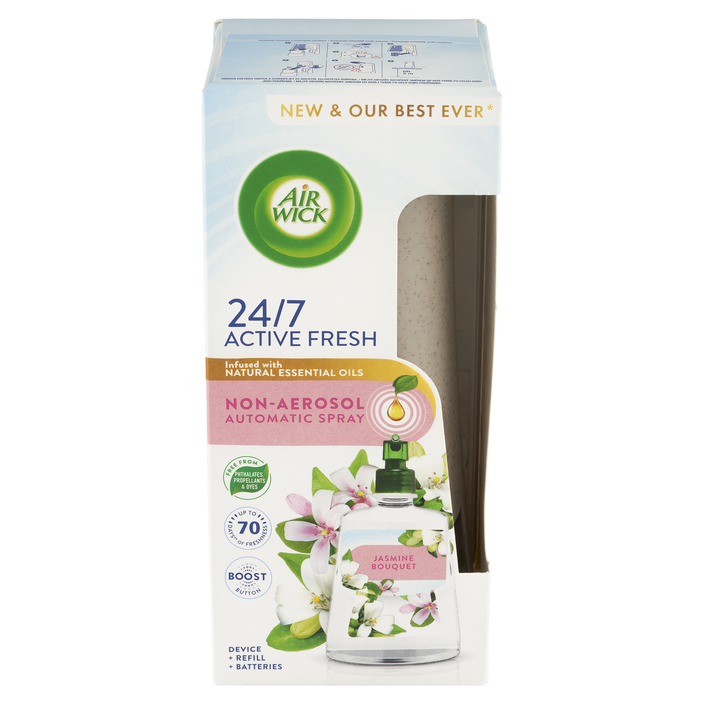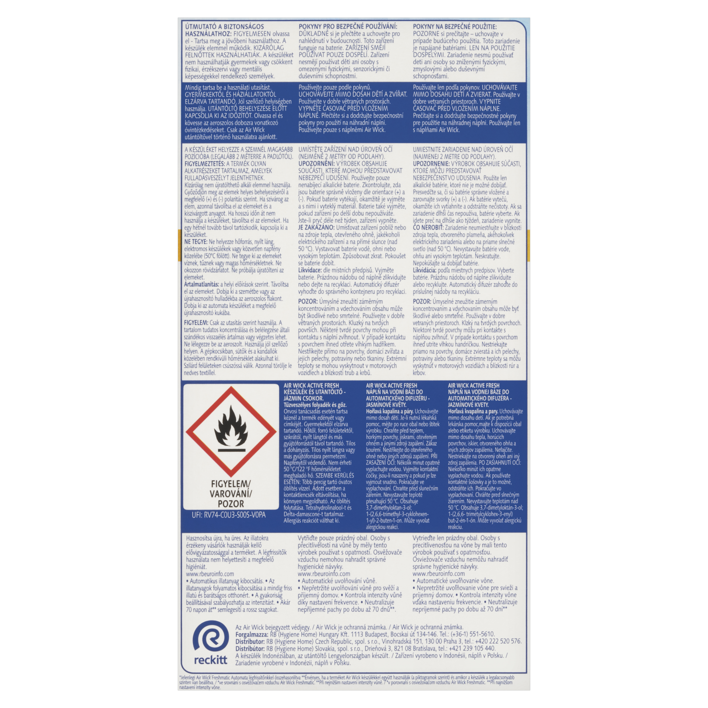 VAROVÁNÍ POKYNY PRO BEZPEČNÉ POUŽÍVÁNÍ: DŮKLADNĚ si je přečtěte a uchovejte pro nahlédnutí v budoucnosti. Toto zařízení funguje na baterie. ZAŘÍZENÍ SMĚJÍ POUŽÍVAT POUZE DOSPĚLÍ. Zařízení nesmějí používat děti ani osoby s omezenými fyzickými, senzorickými či duševními schopnostmi. Používejte pouze podle pokynů. UCHOVÁVEJTE MIMO DOSAH DĚTÍ A ZVÍŘAT. Používejte v dobře větraných prostorách. VYPNĚTE ČASOVAČ PŘED VLOŽENÍM NÁPLNĚ. Přečtěte si a dodržujte bezpečnostní pokyny pro použití na náhradní náplni. Používejte pouze s náplněmi Air Wick. UMÍSTĚTE ZAŘÍZENÍ NAD ÚROVEŇ OČÍ (NEJMÉNĚ 2 METRY OD PODLAHY). UPOZORNĚNÍ: VÝROBEK OBSAHUJE SOUČÁSTI, KTERÉ MOHOU PŘEDSTAVOVAT NEBEZPEČÍ UDUŠENÍ. Používejte pouze nenabíjecí alkalické baterie. Zkontrolujte, zda jsou baterie správně vloženy dle orientace (+) a (-). Pokud baterie vytékají, okamžitě je vyjměte a s nimi i vyteklý materiál. Baterie také vyjměte, pokud zařízení po delší dobu nepoužíváte. Jste-li pryč déle než týden, zařízení vypněte. JE ZAKÁZÁNO: Umisťovat zařízení poblíž nebo na zdroje tepla, otevřeného ohně, jakéhokoli elektrického zařízení a na přímé slunce (nad 50 °C). Vystavovat baterie vodě, ohni nebo vysokým teplotám. Způsobovat zkrat. Pokoušet se baterie dobít. POZOR: Úmyslné zneužití záměrným koncentrováním a vdechováním obsahu může být škodlivé nebo smrtelné. Používejte v dobře větraných prostorách. Kluzký na tvrdých površích. Některé tvrdé povrchy mohou při kontaktu s náplní zvlhnout. V případě kontaktu s povrchem ihned otřete vlhkým hadříkem. Nestříkejte přímo na povrchy, domácí zvířata a jejich pelechy, potraviny nebo tkaniny. Extrémní teploty se mohou vyskytnout v motorových vozidlech a blízkosti trub a krbů. AIR WICK ACTIVE FRESH NÁPLŇ NA VODNÍ BÁZI DO AUTOMATICKÉHO DIFUZÉRU - JASMÍNOVÉ KVĚTY. Hořlavá kapalina a páry. Uchovávejte mimo dosah dětí. Je-li nutná lékařská pomoc, mějte po ruce obal nebo štítek výrobku. Chraňte před teplem, horkými povrchy, jiskrami, otevřeným ohněm a jinými zdroji zapálení. Zákaz kouření. Nestříkejte do otevřeného ohně nebo jiných zdrojů zapálení. PŘI ZASAŽENÍ OČÍ: Několik minut opatrně vyplachujte vodou. Vyjměte kontaktní čočky, jsou-li nasazeny a pokud je lze vyjmout snadno. Pokračujte ve vyplachování. Chraňte před slunečním zářením. Nevystavujte teplotě přesahující 50 °C. Obsahuje 3,7-dimethyloktan-3-ol; 1-(2,6,6-trimethyl-3-cyklohexen-1-yl)-2-buten-1-on. Může vyvolat alergickou reakci. Osoby s přecitlivělostí na vůně by měly tento výrobek používat s opatrností. Osvěžovače vzduchu nemohou nahradit správné hygienické návyky. Postupujte POZORNĚ podle pokynů. MĚJTE DIFUZÉR NATOČENÝ SMĚREM OD VAŠÍ TVÁŘE PO CELOU DOBU JEHO POUŽÍVÁNÍ.