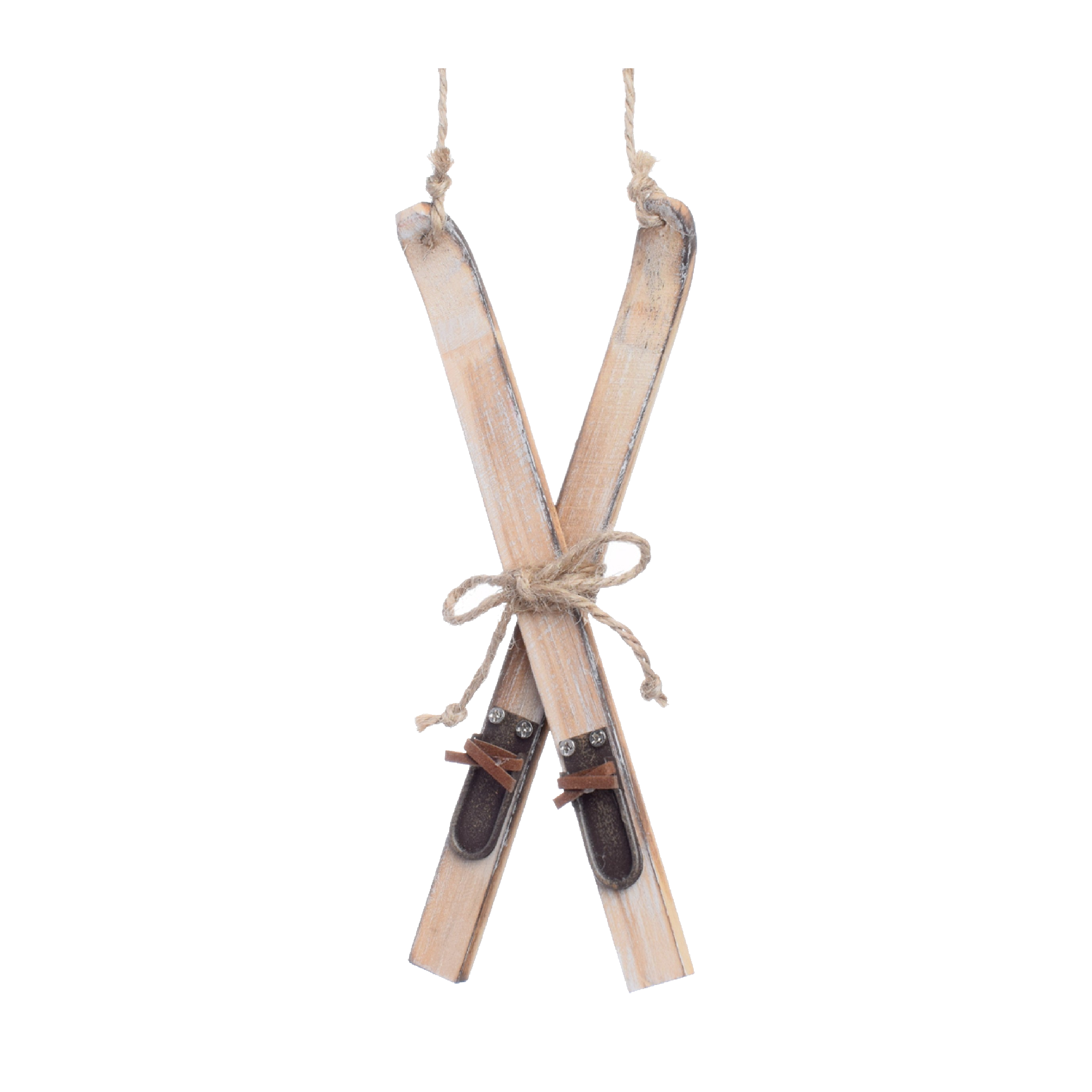 Stylová dřevěná dekorace ve tvaru zkřížených lyží s jutovým provázkem dodá vašemu interiéru zimní atmosféru s nádechem nostalgie. Ideální k zavěšení na stromeček, věnec nebo jako součást horské výzdoby. Výška 17,5 cm.