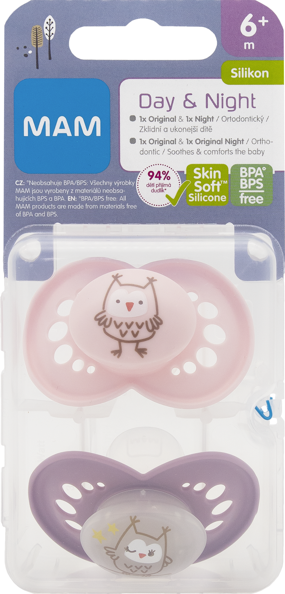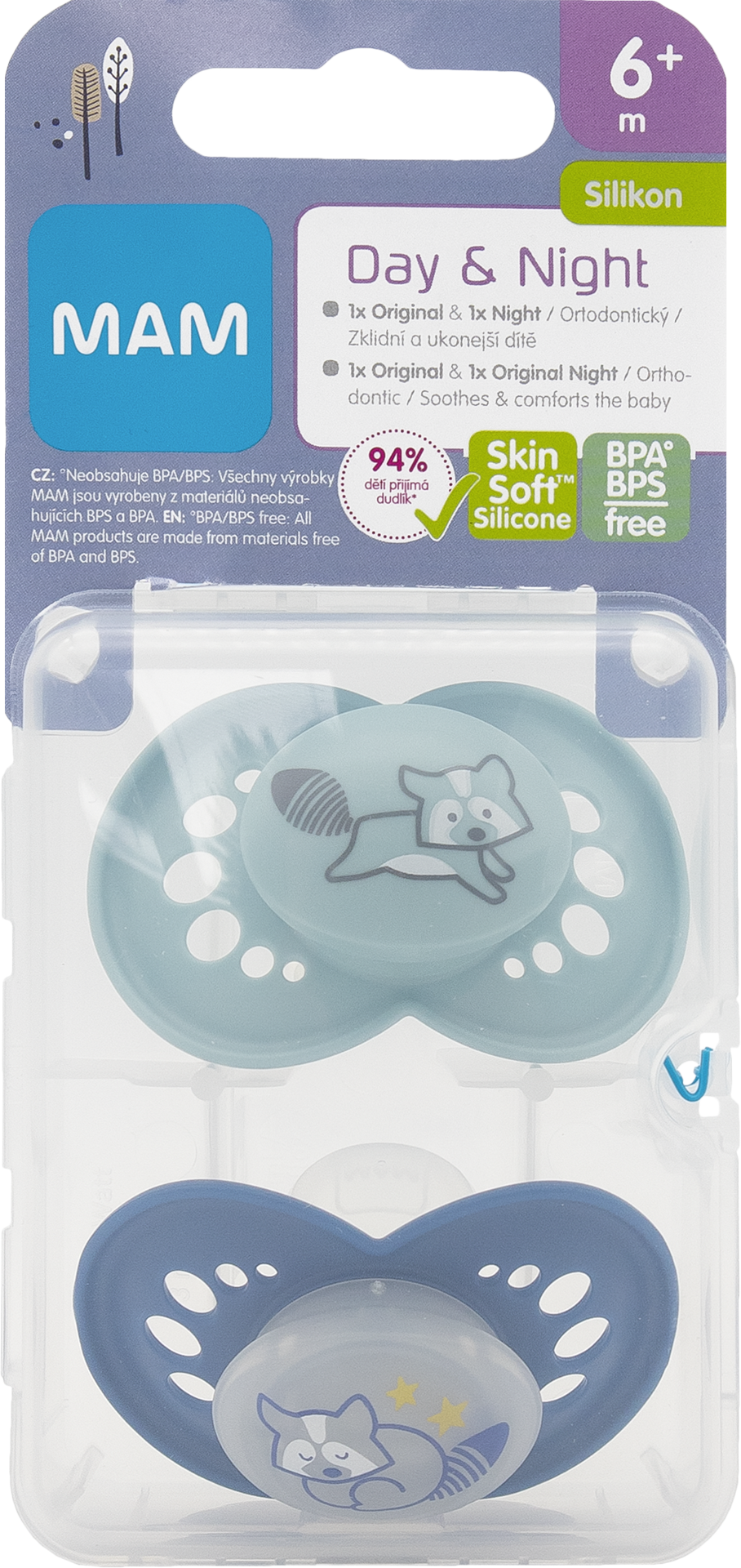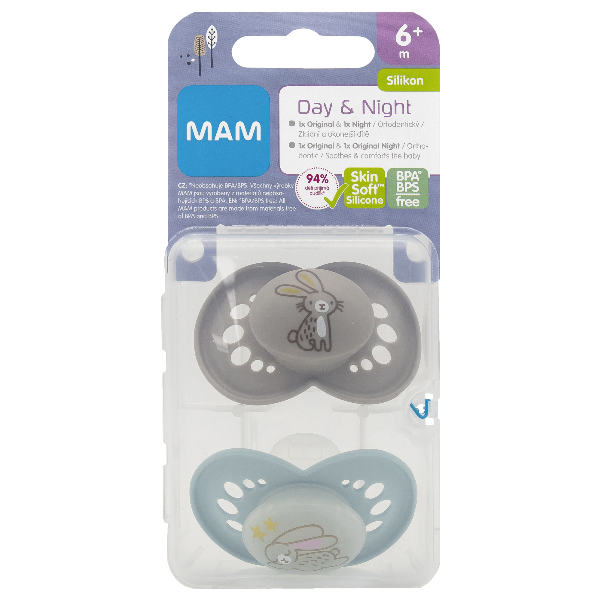 MAM dudlík Day & Night má dokonale sladěný design pro den a noc. Výhodné balení dvou dudlíků v praktickém sterilizačním boxu. Knoflík nočního dudlíku svítí ve tmě, takže ho rodiče i děti snadno mohou nalézt. Dudlík má symetrický tvar, a proto se vždy dokonale přizpůsobí dětským ústům. Díky knoflíku ho lze snadno a rychle uchopit a rovněž jednoduše připevnit k pásku. Inovativní savička MAM je jemná jako pokožka a je dětmi snadno přijímána. Dudlík je šetrný k pokožce díky velkým vzduchovým otvorům a také unikátním MAM důlkům. MAM dudlíky byly vyvíjeny společně se zubními experty pro zdravý vývoj zubů.