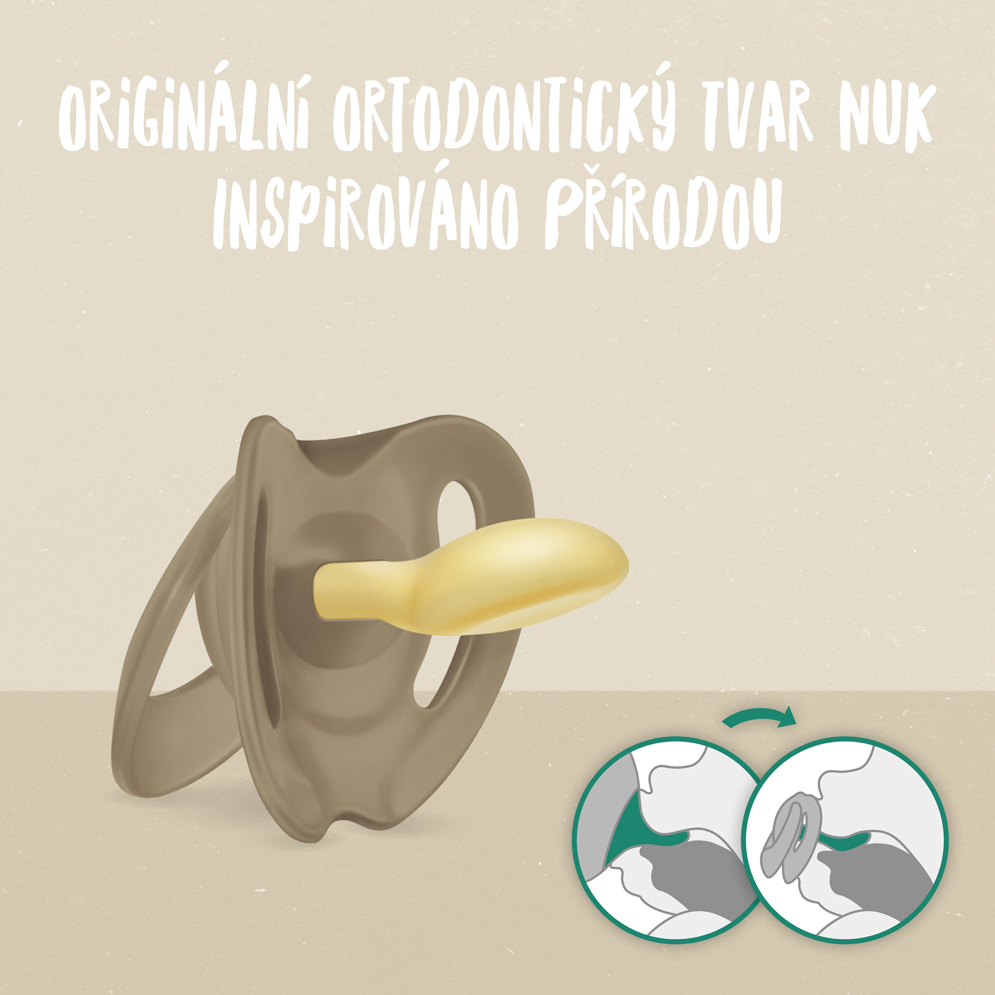 Originální tvar NUK je také inspirován přírodou - nahoře kulatý, dole plochý. Dudlík NUK for Nature se tak snadno přitiskne k patru a ponechá dostatek místa pro jazyk. Dudlík je přijímán 95 % miminek, je obzvláště šetrný ke kojení a nezpůsobuje špatný vývoj zoubků nebo čelistí.** Z těchto a mnoha dalších důvodů je dudlík NUK for Nature doporučován lékařskými odborníky** a je oblíben u rodičů, kteří dbají na ochranu životního prostředí. NUK for Nature. Uklidňuje udržitelným způsobem.