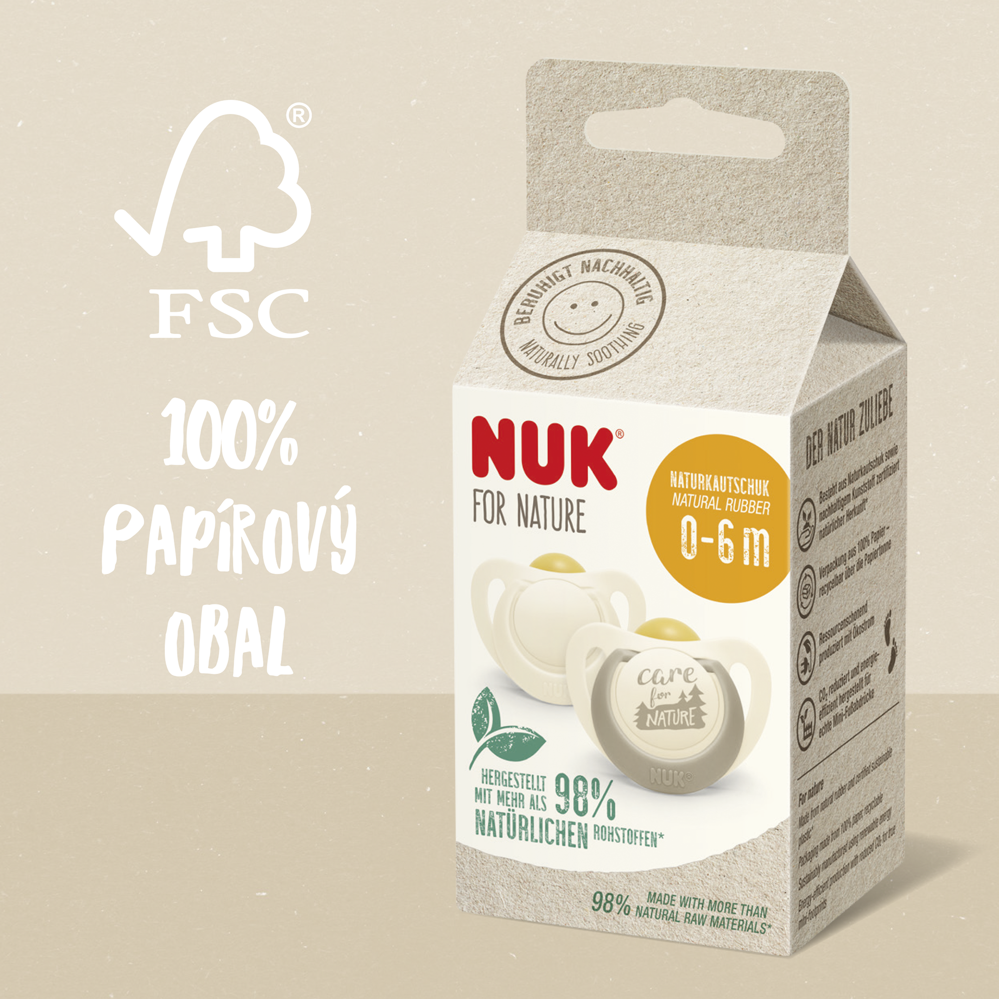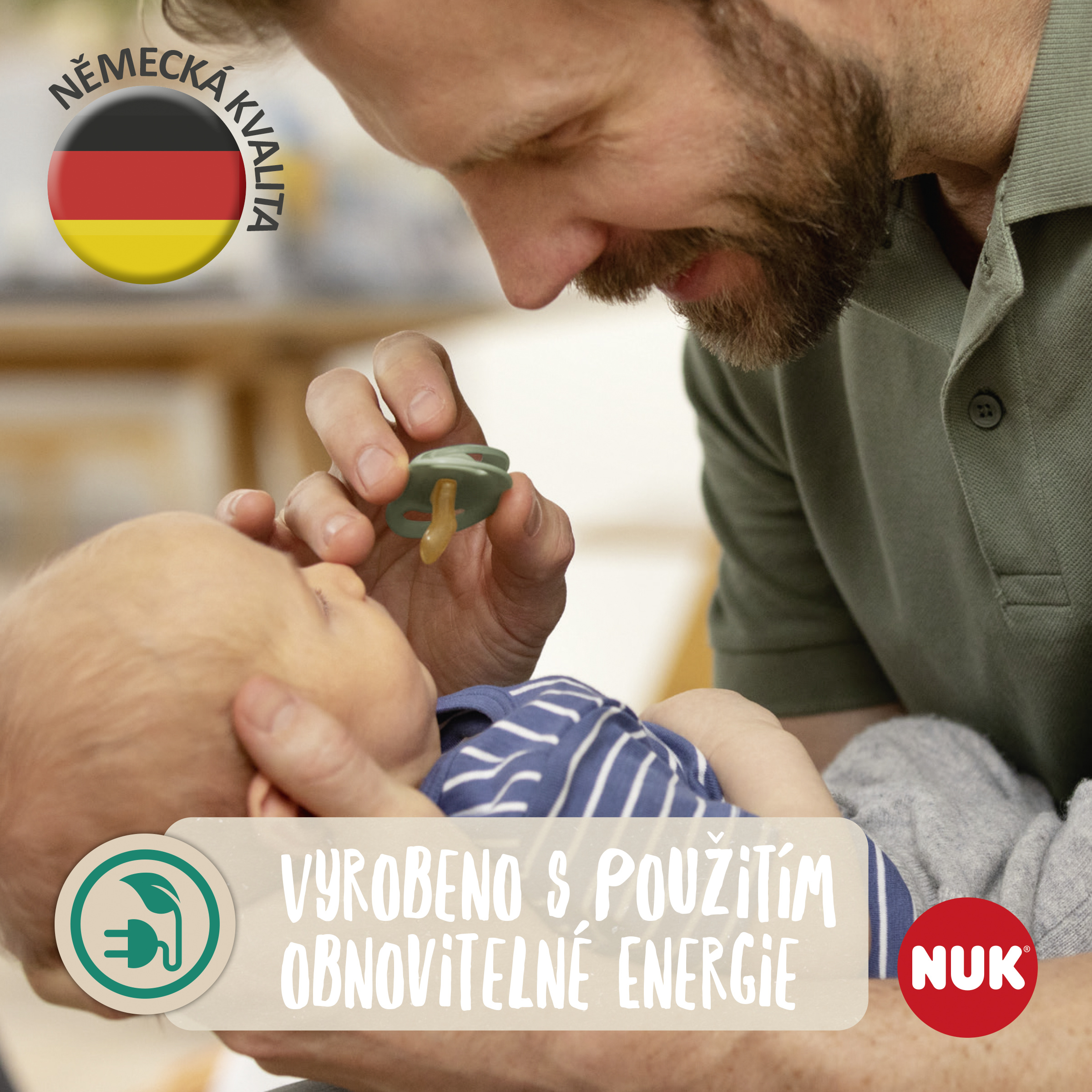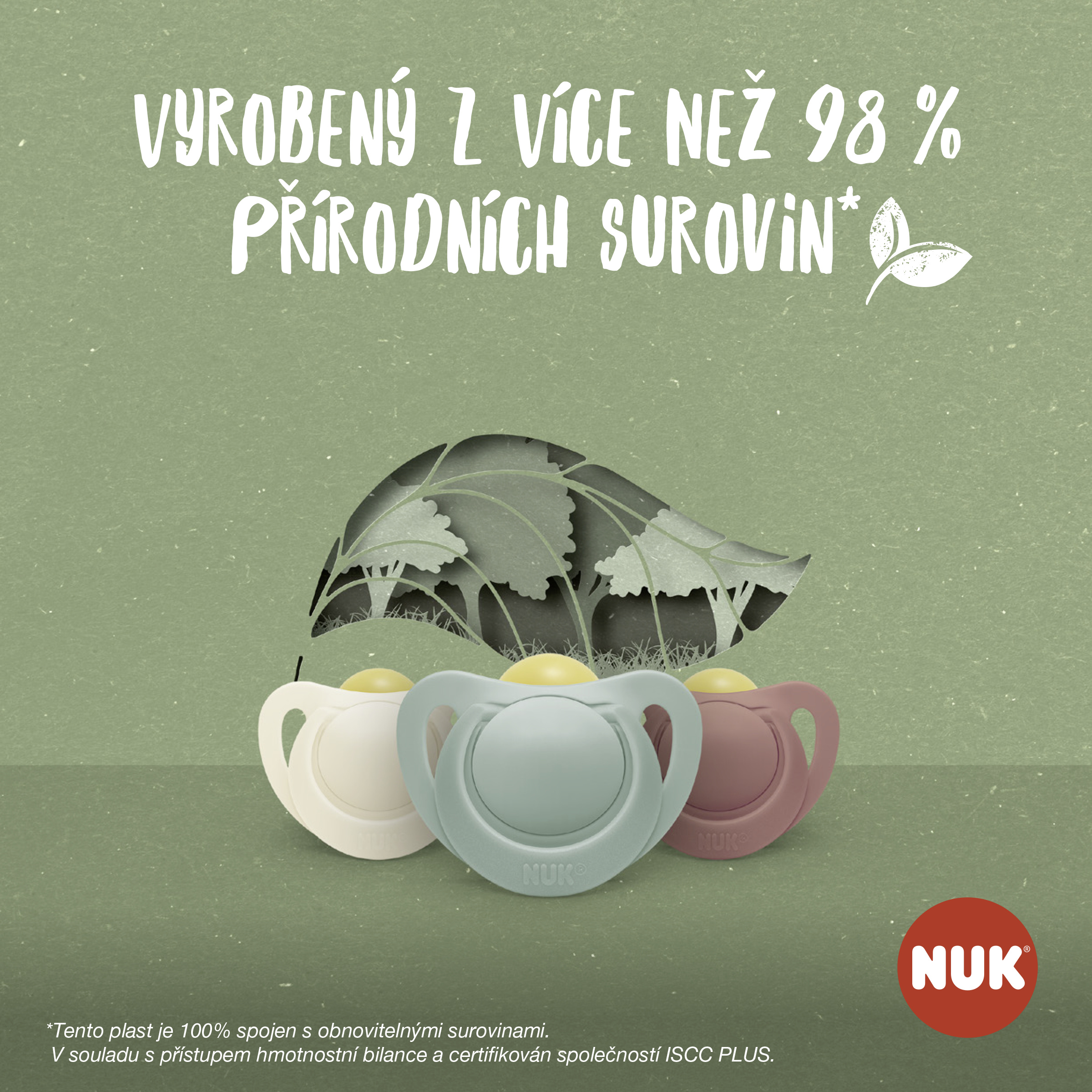 NUK for Nature - přirozený, uklidňuje. Přirozeně uklidňující. Příroda uklidňuje nejlépe. Proto k výrobě našich dudlíků NUK for Nature používáme více než 98 % přírodních surovin. Pevné části vyrábíme z udržitelných plastů. Přírodní původ je nezávisle certifikován. Měkká savička je vyrobena z čistého přírodního kaučuku. Obnovitelná surovina zcela rostlinného původu, která je velmi měkká a teplá a mimořádně pružná. NUK for Nature ale neznamená, že udržitelnost končí u dudlíku. Aby uhlíková stopa dudlíku byla ještě menší, veškeré procesy, počínaje využitím přírodních surovin přes výrobu s využitím obnovitelných zdrojů energie, jsou optimalizovány tak, aby byly šetrné k životnímu prostředí. A jdeme ještě dál. Každý den pracujeme na tom, aby naše produkty byly ještě přírodnější a udržitelnější.