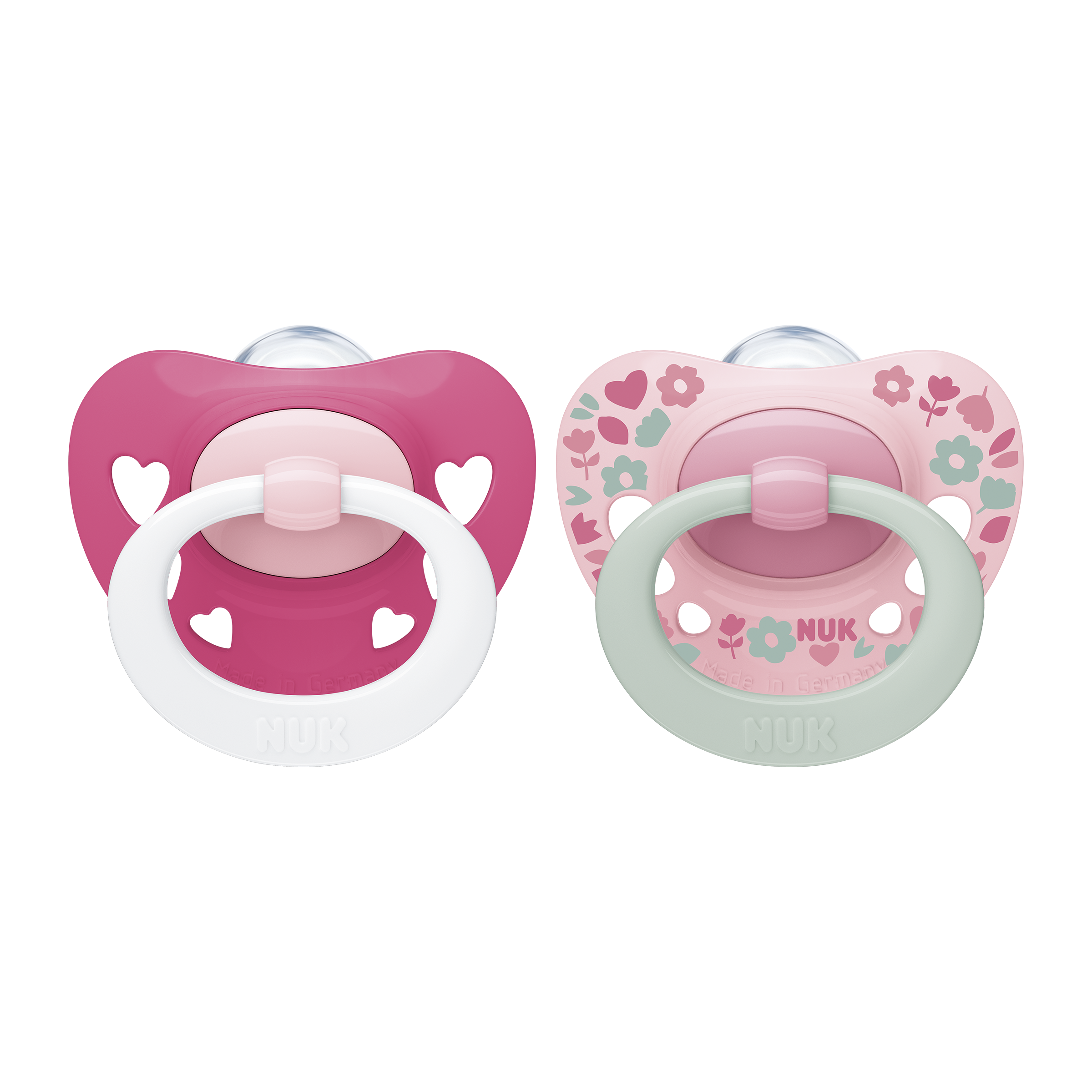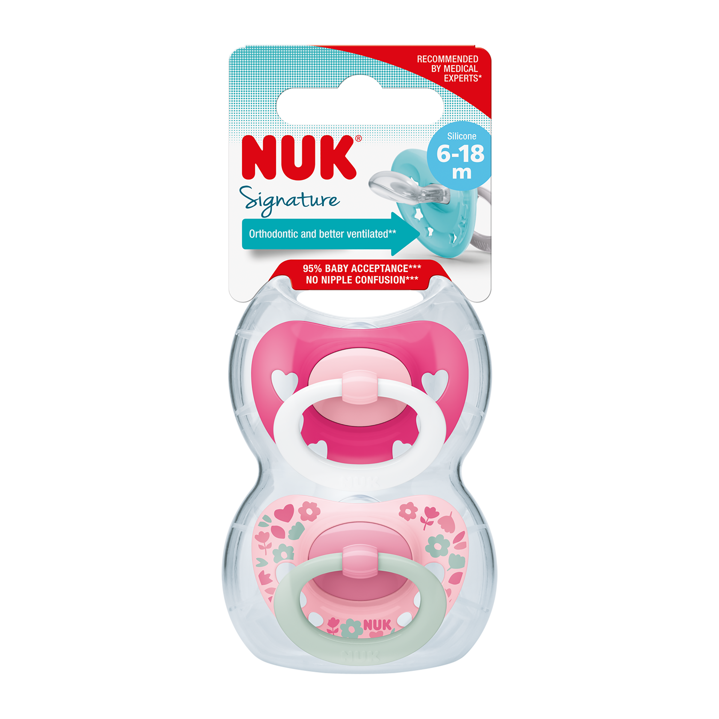 Dudlíky NUK® Signature reagují na potřebu přirozenosti svým zcela přirozeným tvarem. Tvar dudlíku připomíná tvar matčiny bradavky během kojení, tudíž podporuje zdravý vývoj úst miminka. Je dokázáno, že přirozené sání zajišťuje nejen příjem potravy, ale také podporuje rozvoj důležitých schopností, jako je správný způsob polykání, žvýkání či mluvení. Savička dudlíku NUK Signature je natolik plochá, tenká a úzká, že dokonale padne miminku do pusy a nechává jazyku dostatek místa pro přirozené sací pohyby. 100 % ortodontistů uznává, že toto je ten správný tvar, a potvrzují, že dudlíky NUK nezpůsobují poškození zoubků ani čelisti.* A nyní má tento široce oblíbený dudlík úžasný nový vzhled – oblíbený oblý tvar naústního štítu ve tvaru srdce a módní vylepšení roztomilého kroužku. Díky tomu bude malý obličejík vypadat ještě roztomileji.