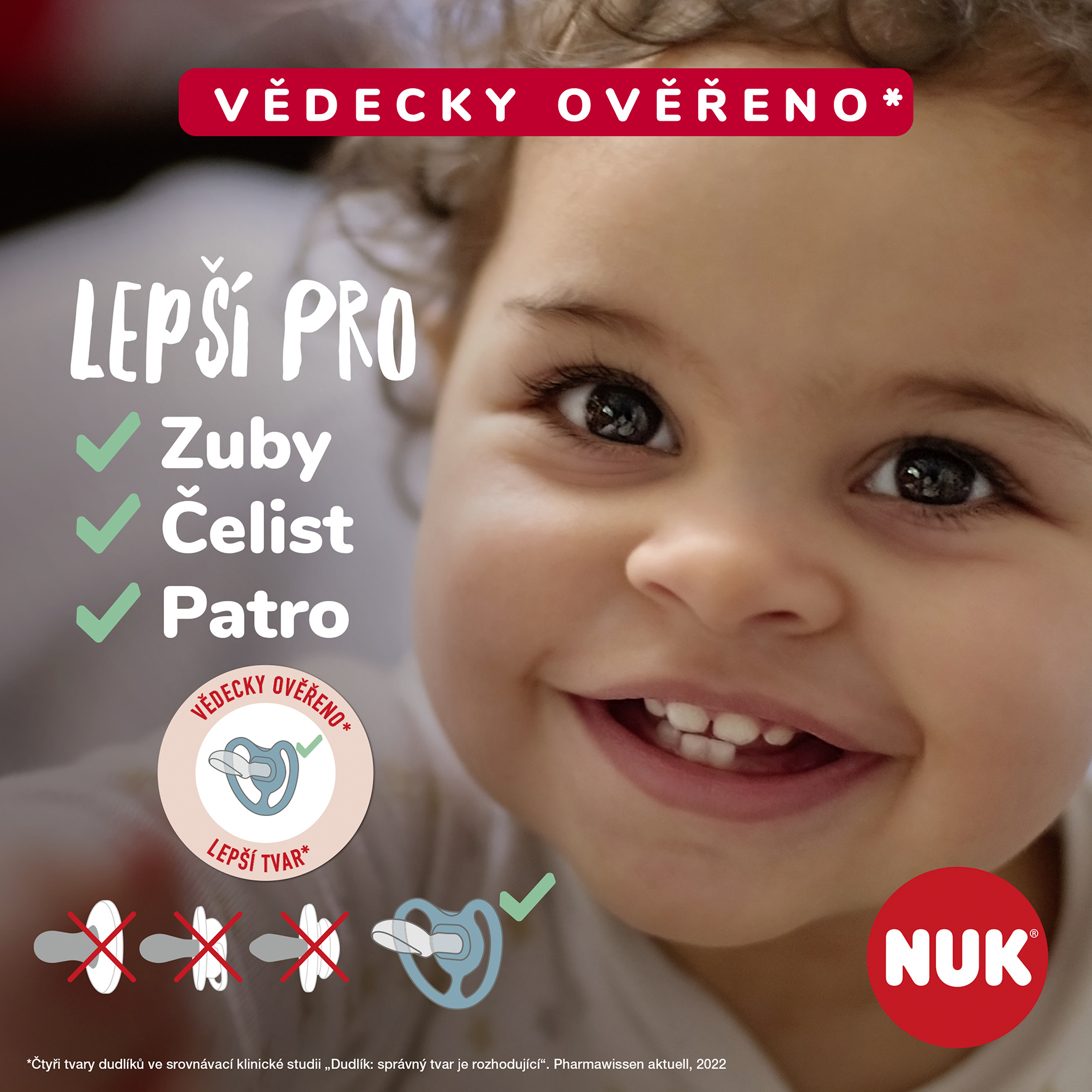 - Vylepšený originální tvar dudlíku NUK – připomíná tvar matčiny bradavky během kojení, díky čemuž perfektně vyhovuje dětské pusince při sání