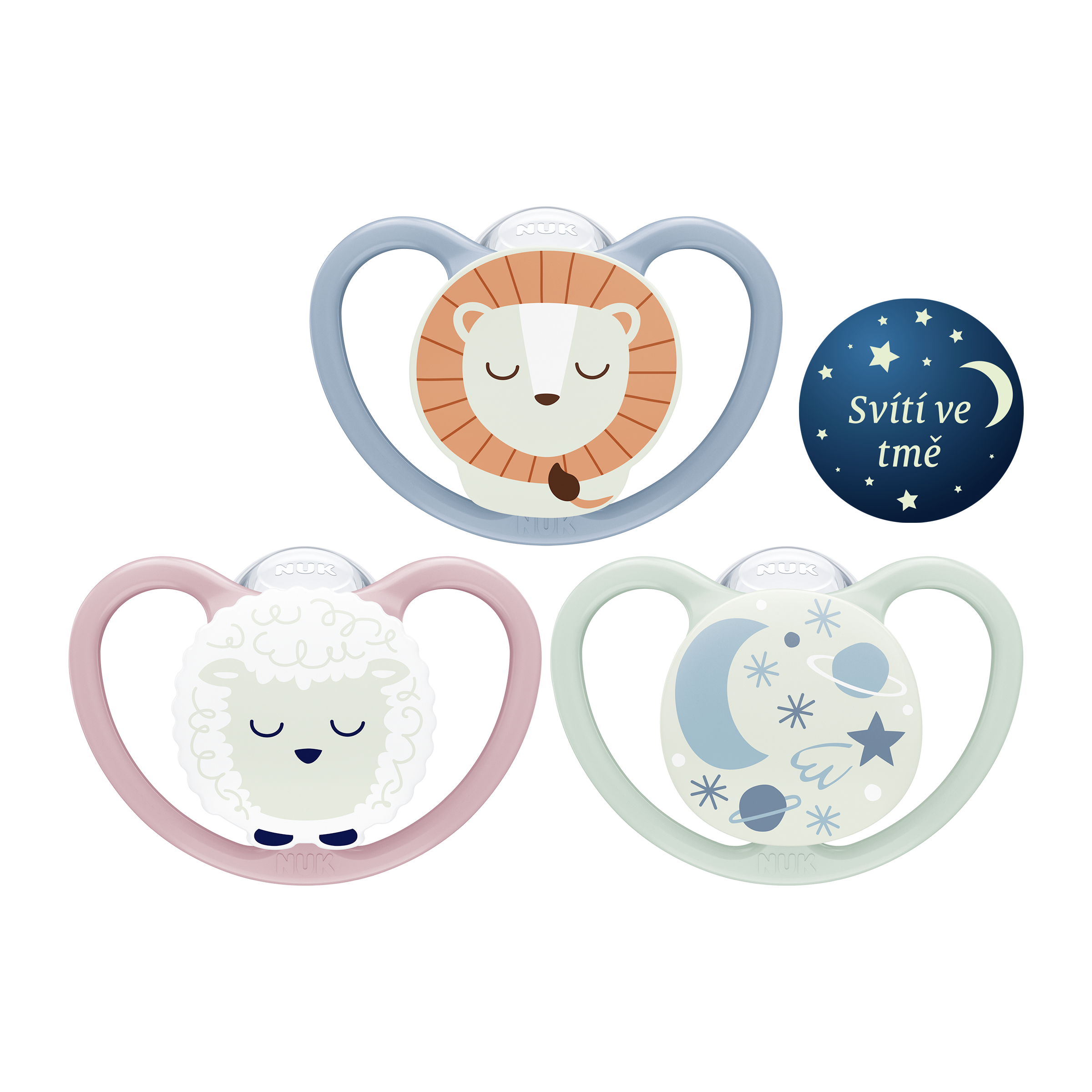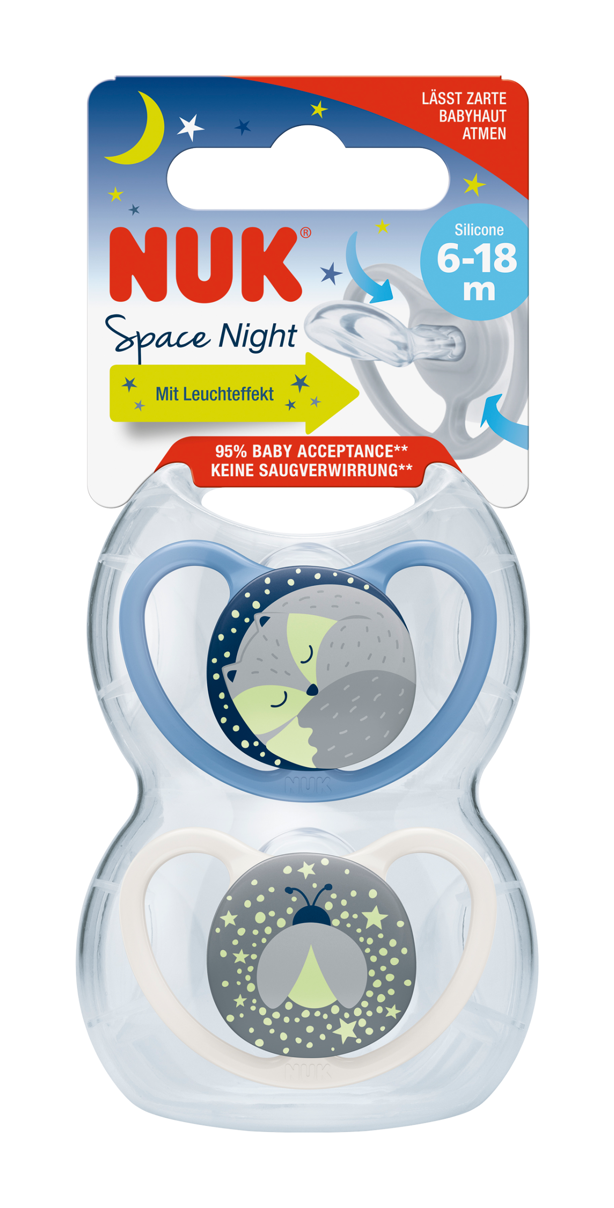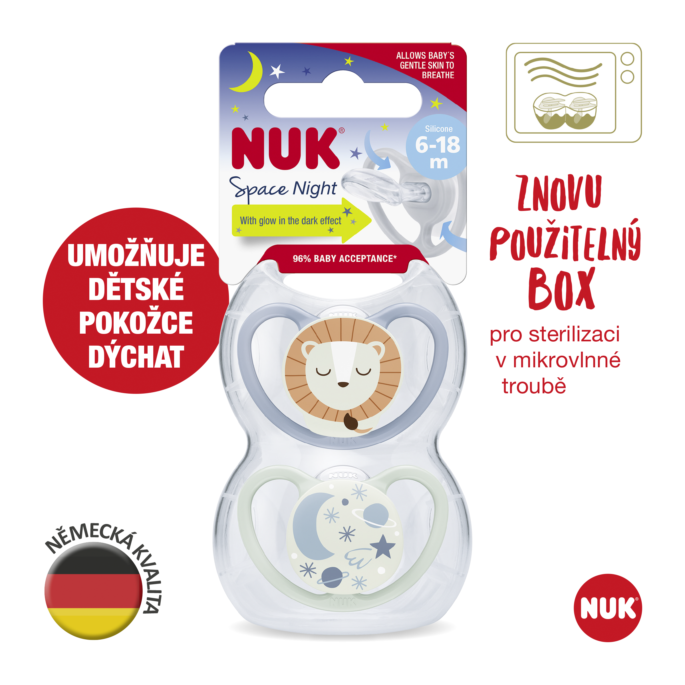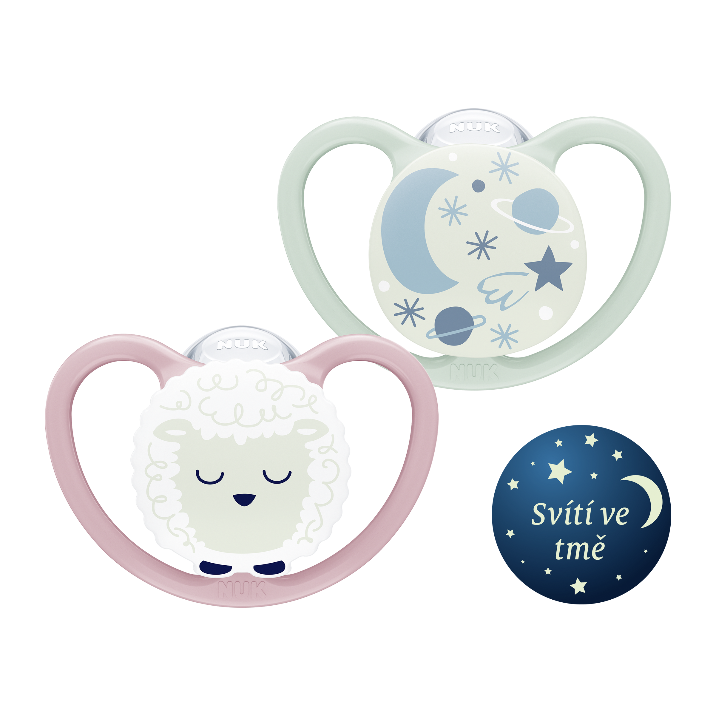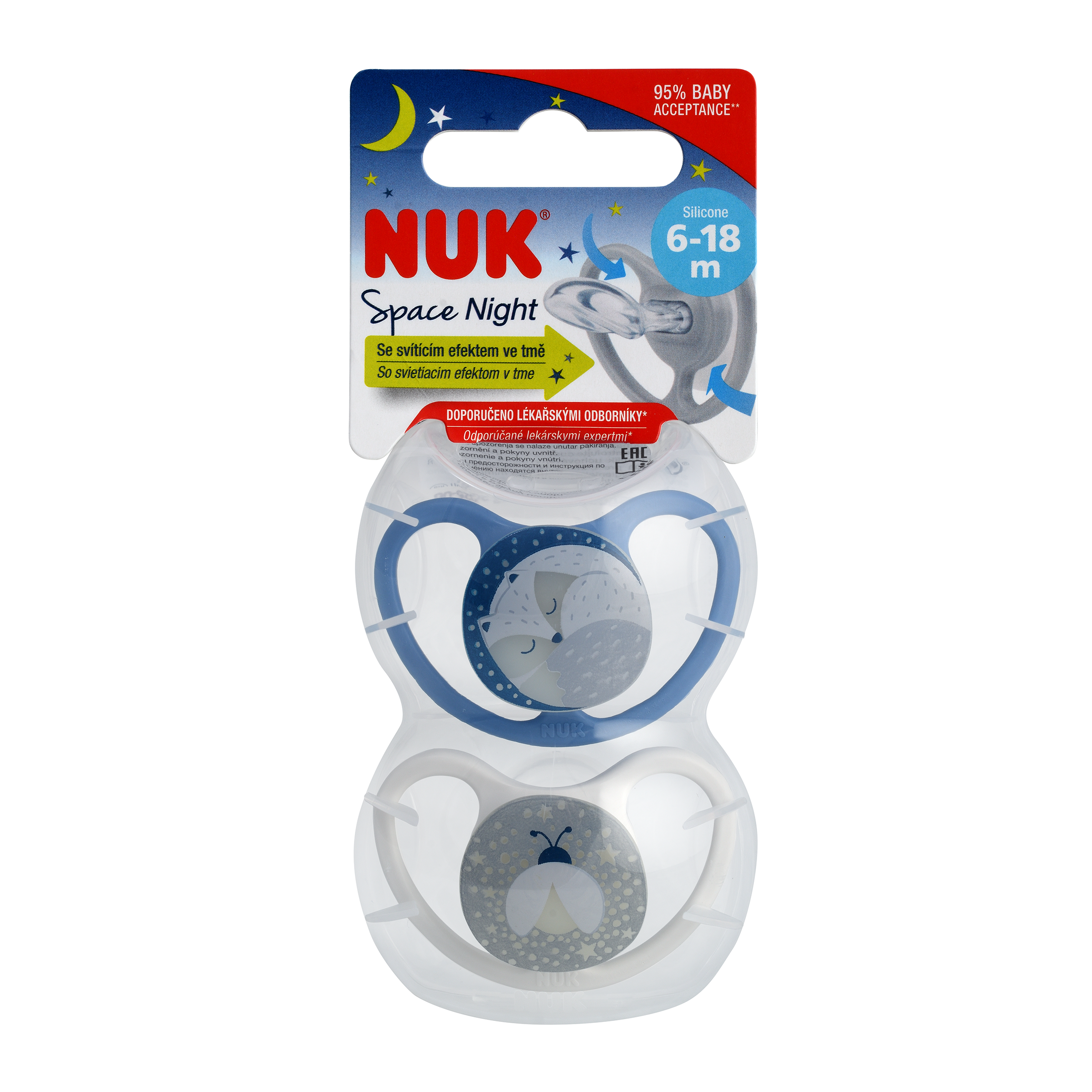 Nový dudlík NUK Night Space silikonový: SVÍTÍ VE TMĚ. Naši nejmladší mají od počátku vlastní hlavu, ale také úplně odlišné fyzické vlastnosti. Dětská pokožka je velmi jemná a citlivá. NUK vynalezl nový dudlík NUK Space, aby chránil dětskou pokožku tím nejlepším možným způsobem a poskytl vašim potomkům maximální pohodlí za každé situace. Dudlík zaujme svou zploštělou a úzkou savičkou, která poskytuje dostatečný prostor pro přirozené sací pohyby. Dudlík NUK Space vyhovuje perfektně dětské pusince během sání. Více než 95 % miminek dudlík NUK bez problémů přijme*.
