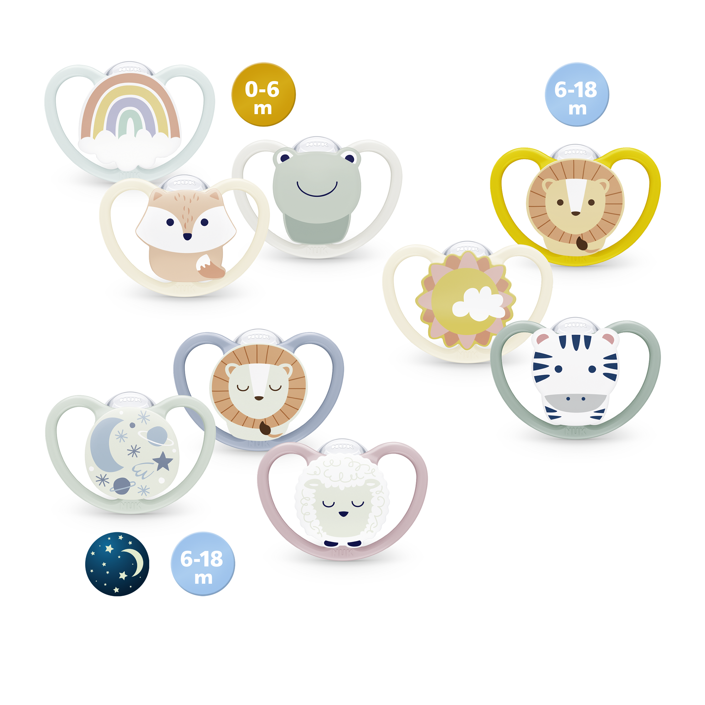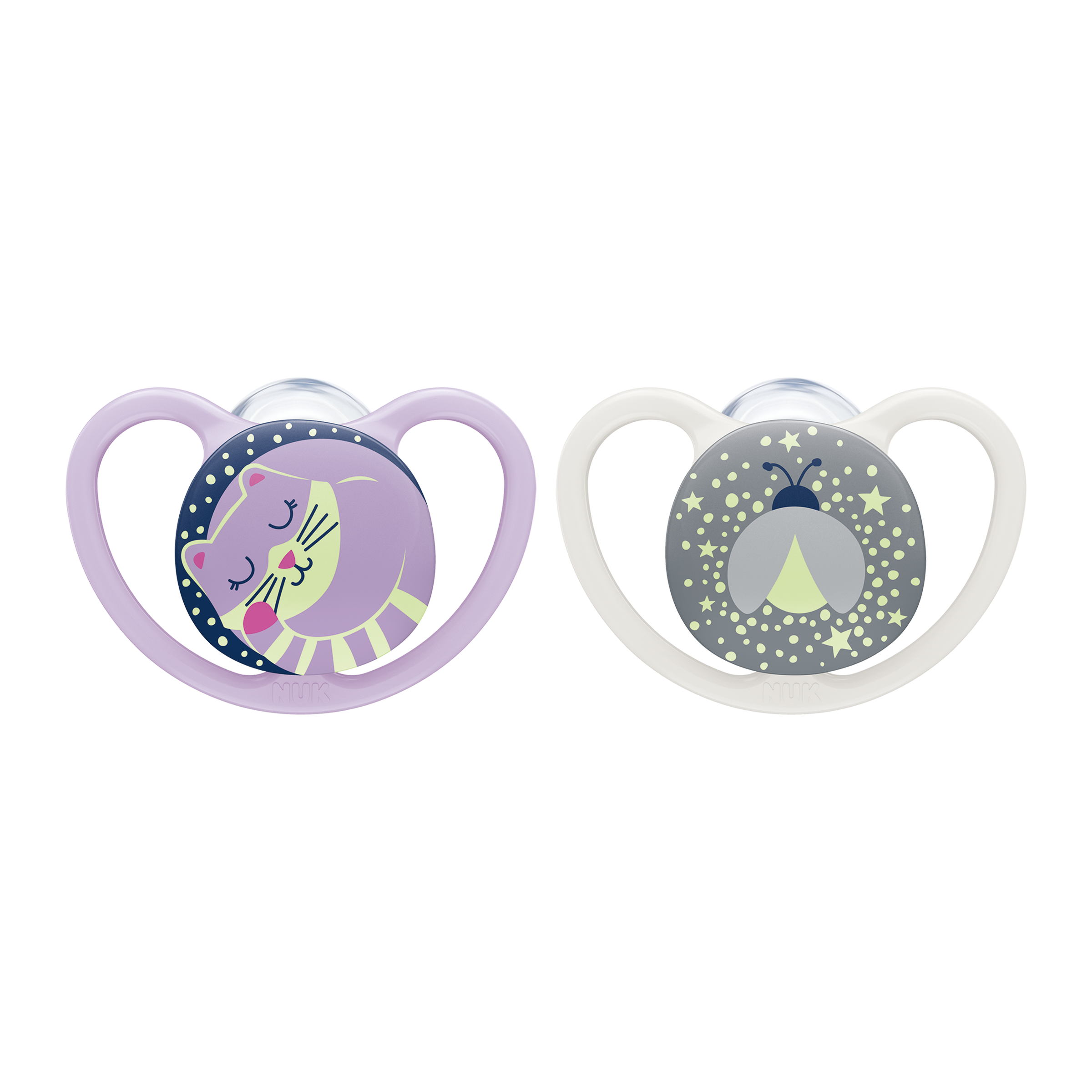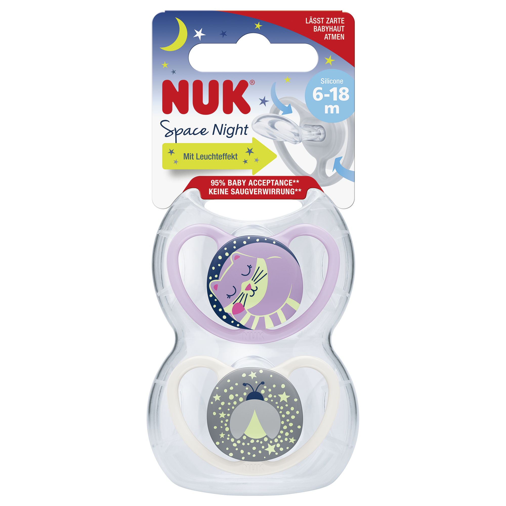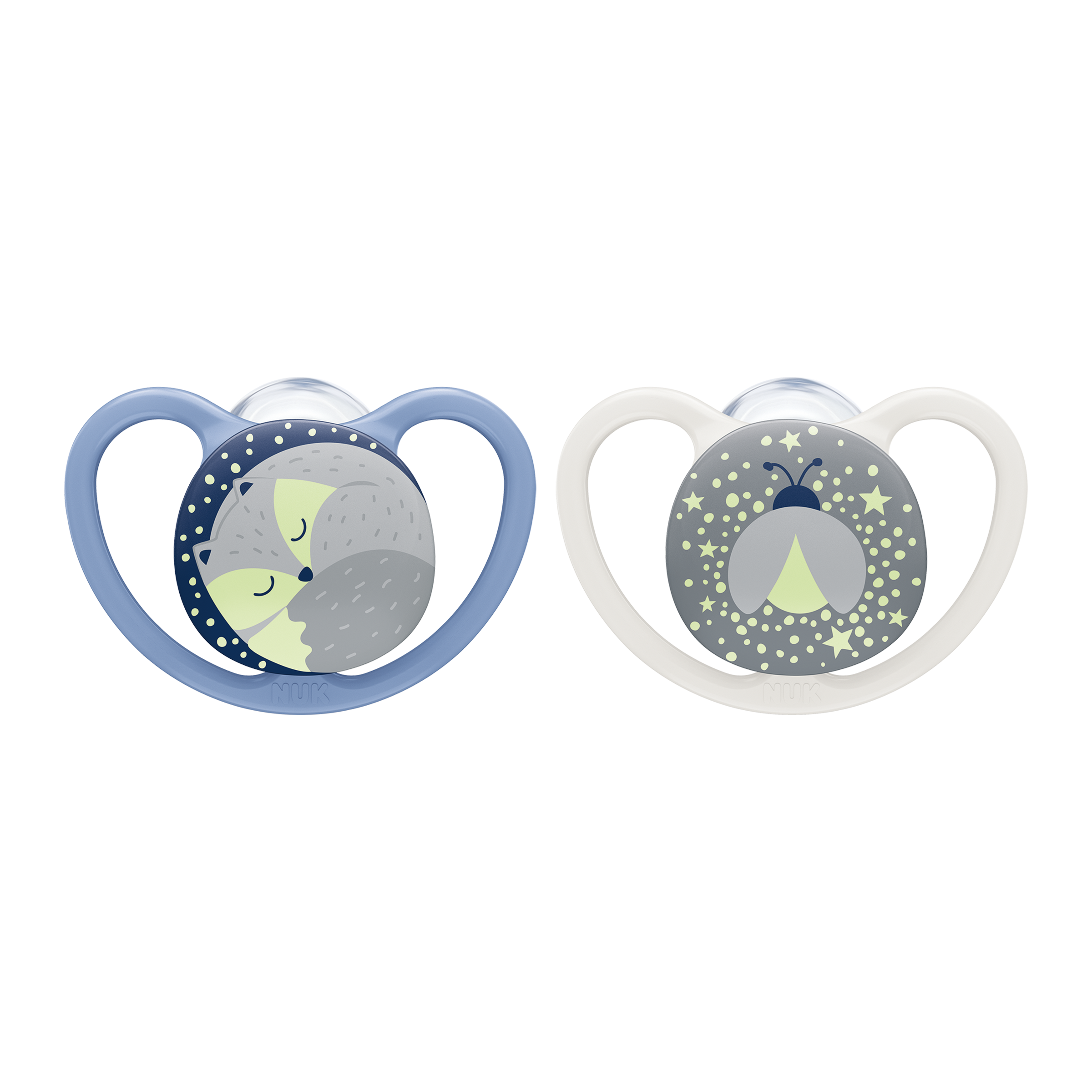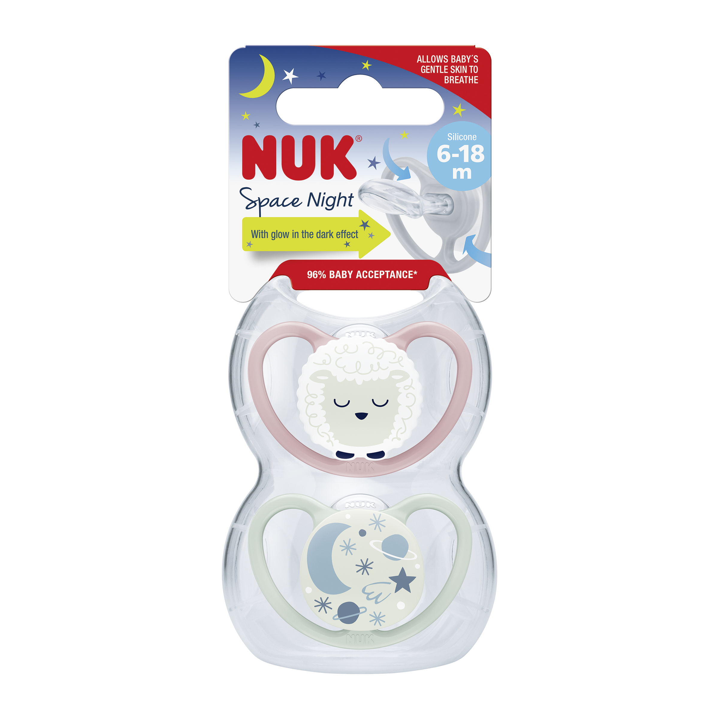 Nový dudlík NUK Night Space silikonový: SVÍTÍ VE TMĚ. Naši nejmladší mají od počátku vlastní hlavu, ale také úplně odlišné fyzické vlastnosti. Dětská pokožka je velmi jemná a citlivá. NUK vynalezl nový dudlík NUK Space, aby chránil dětskou pokožku tím nejlepším možným způsobem a poskytl vašim potomkům maximální pohodlí za každé situace. Dudlík zaujme svou zploštělou a úzkou savičkou, která poskytuje dostatečný prostor pro přirozené sací pohyby. Dudlík NUK Space vyhovuje perfektně dětské pusince během sání. Více než 95 % miminek dudlík NUK bez problémů přijme*.