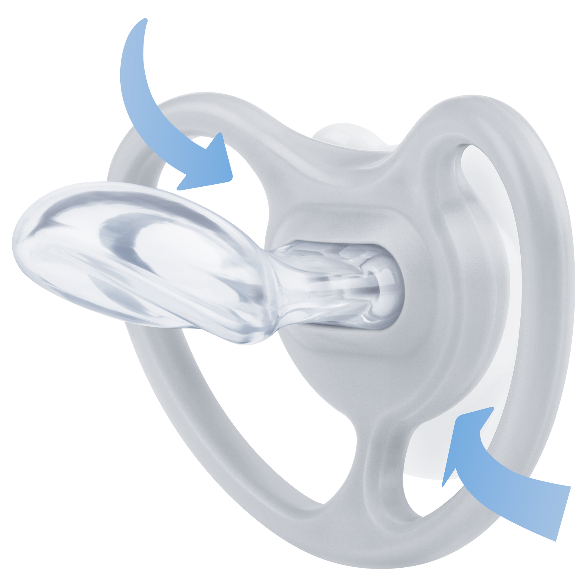 - V ojedinělých případech se může stát, že si dítě vsune celý dudlík do úst. V takovém případě NEPANIKAŘTE! Díky svému speciálnímu tvaru nelze dudlík spolknout a dva dýchací otvory zajistí dítěti dostatečný přísun vzduchu pro dýchání. Vyjměte dudlík dítěti z úst co nejšetrněji.