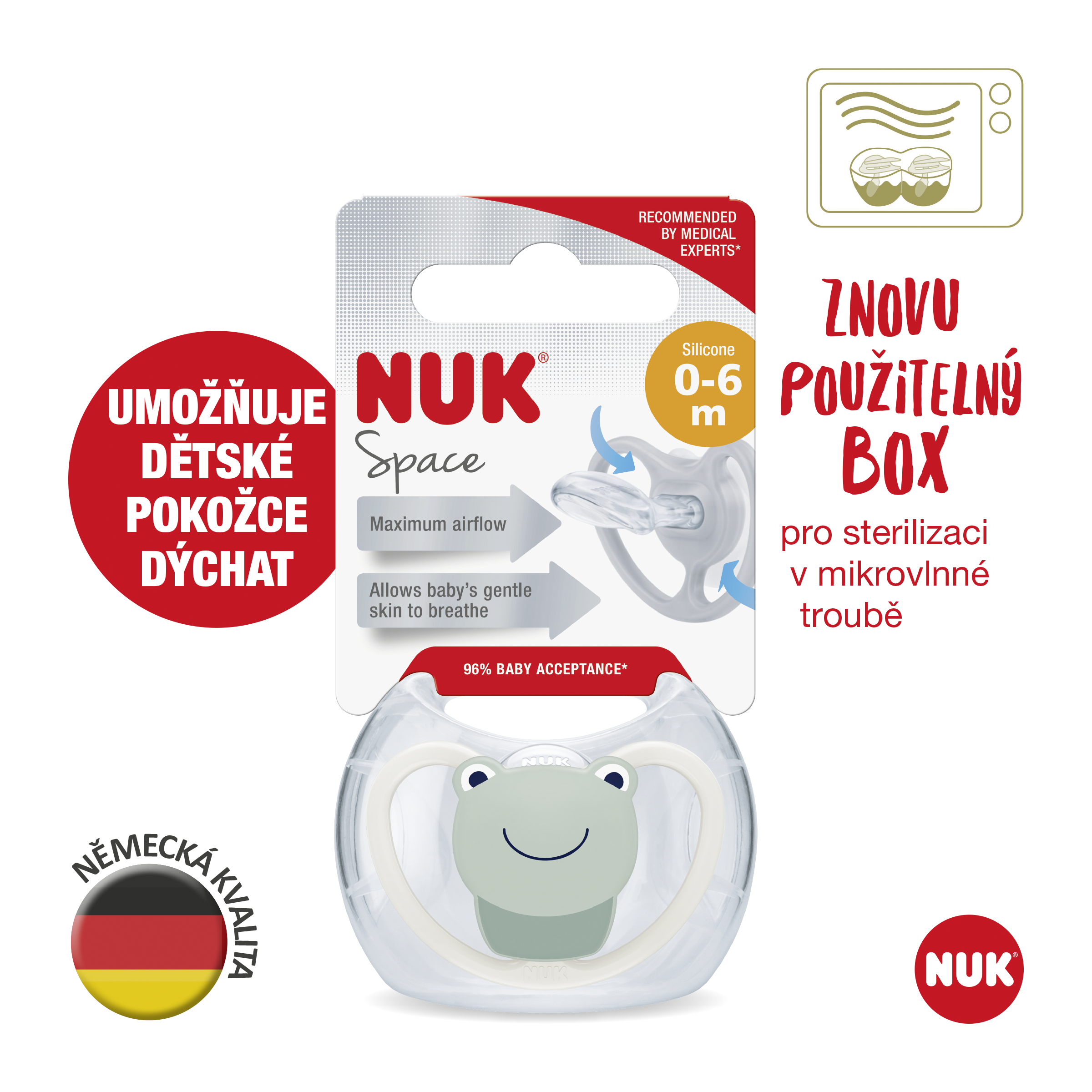 Čerstvý vzduch a láska k pokožce! Dětská pokožka je choulostivá a citlivá. Jakkoli miminka své dudlíky milují, sliny ze sání mohou dráždit jejich pokožku. Proto jsme navrhli dudlík NUK Space, který umožňuje pokožce volně dýchat. Tento účinek potvrzuje 98 % maminek.** Díky unikátnímu designu s extra velkými otvory je dudlík NUK Space nejen šetrný k pokožce, ale i skvěle vypadá a je k dispozici v mnoha provedeních. Kromě příjemného pocitu na pokožce je dudlík NUK Space příjemný v ústech miminka. Toto je pravděpodobně důvod, proč se jím 99 % miminek uklidňuje.*** Materiál dudlíku je na horní straně velice tenký, a proto je extrémně měkký. Díky této měkké zóně se velmi jemně přitiskne k patru. A protože je dudlík úzký a plochý, na zuby ani čelisti není vyvíjen téměř žádný tlak. Proto ho doporučuje více než 90 % ortodontistů.*** Díky širokému výběru velikostí si každá dětská pusinka najde ten svůj správný dudlík. Od novorozenců až po batolata do 6 měsíců.