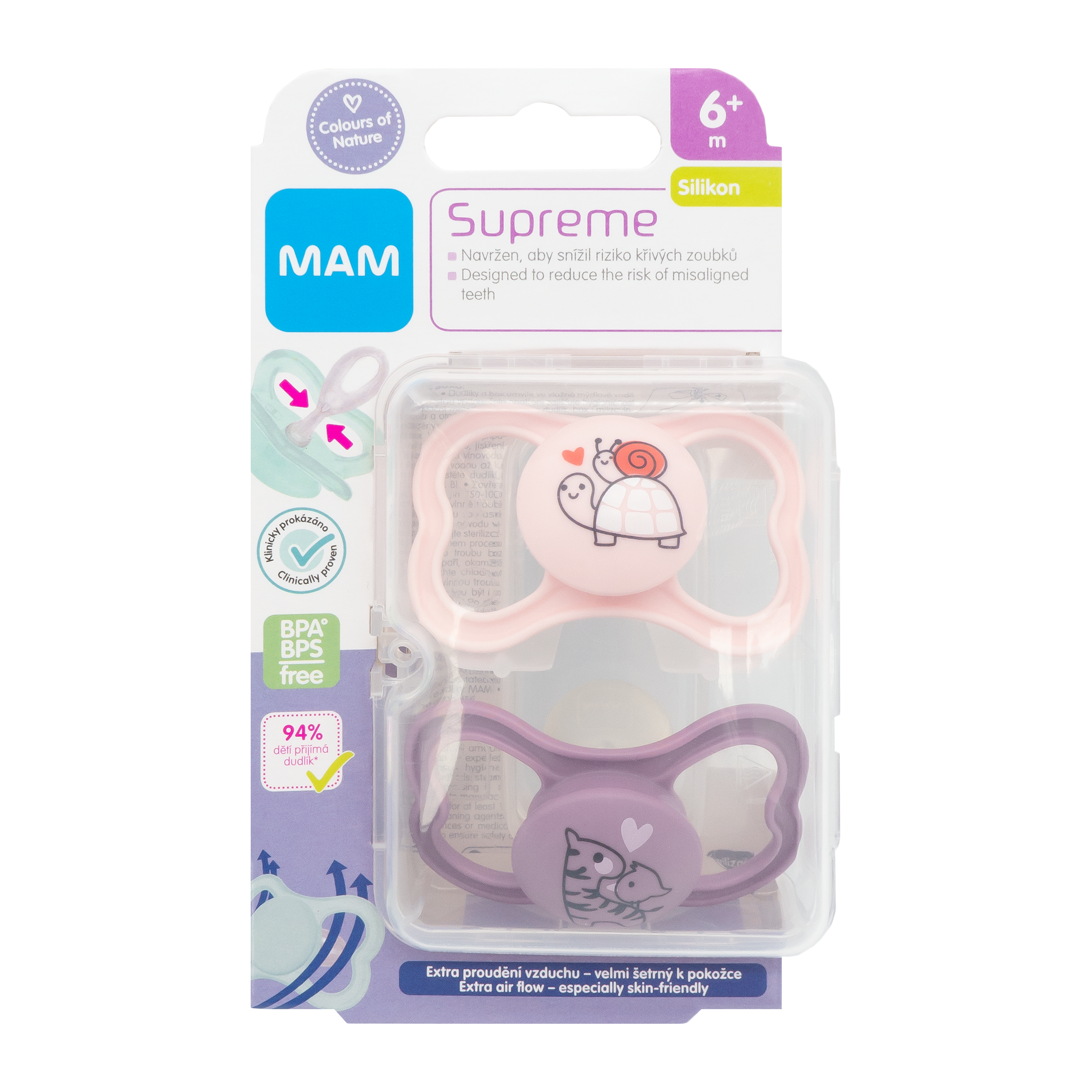 Novinka MAM Supreme je kombinací oblíbených dudlíků MAM Air s extra velkými otvory pro proudění vzduchu a MAM Perfect s extra tenkou savičkou snižující nebezpečí křivého růstu zoubků a vadného skusu. Díky jedinečné savičce Dento-Flex, jemné jako pokožka, je krček dudlíku o 60 % tenčí a 4krát měkčí (v průměru: o 36 - 76 % tenčí / 2 - 8krát měkčí než běžné silikonové dudlíky). Zoubky tak získají větší prostor pro svůj růst, a riziko zkřivení zoubků se tak sníží. Speciální design ochranného krytu umožňuje extra proudění vzduchu, díky čemuž dokonale sedí a je šetrný k dětské pokožce v okolí úst. Navíc balen v praktickém sterilizačním boxu.