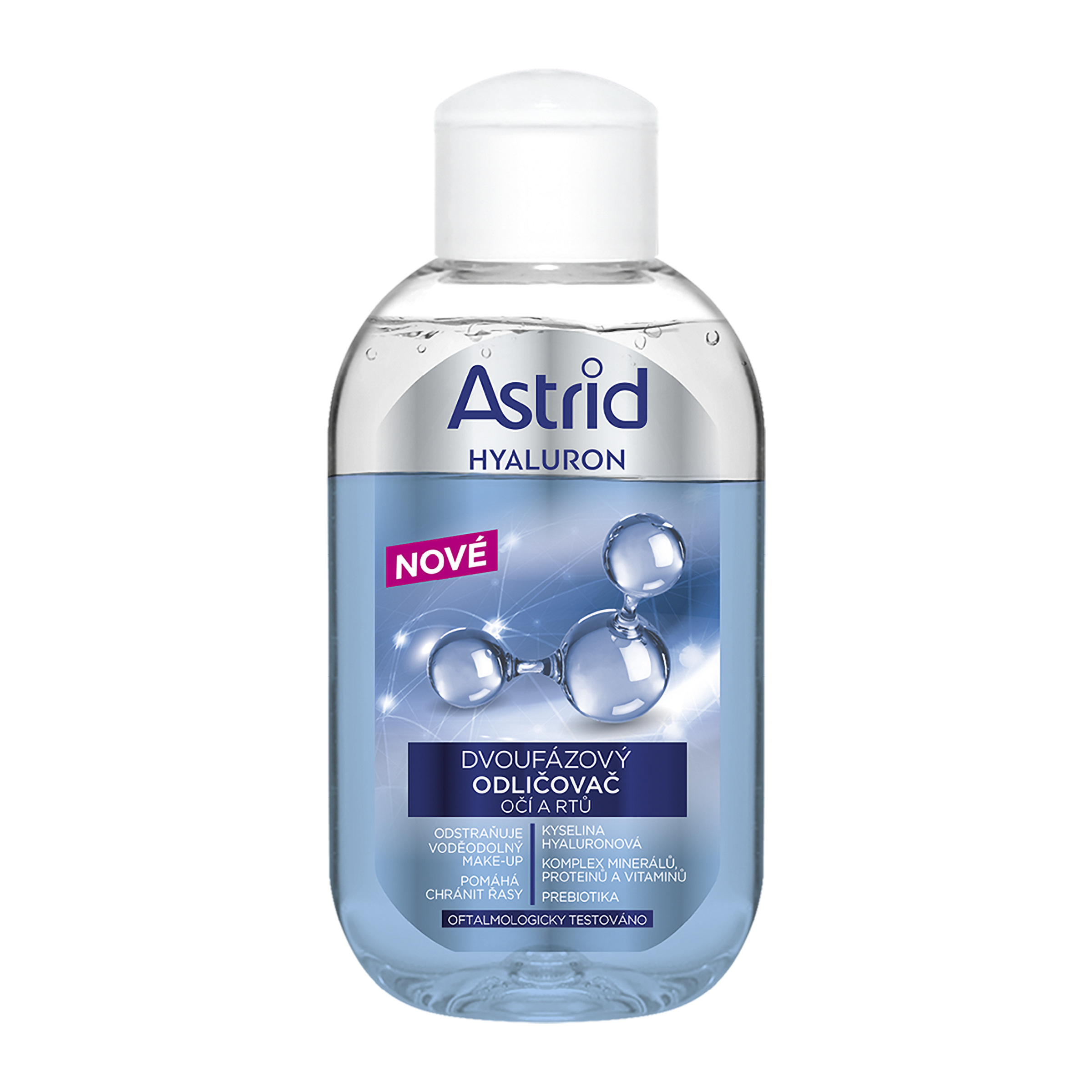 Astrid hyaluron dvoufázový odličovač očí a rtů účinně odstraňuje i voděodolný make-up. Obsahuje kyselinu hyaluronovou a komplex minerálů, proteinů a vitaminů. Důkladně a přitom šetrně čistí jemné okolí očí a zároveň pomáhá vyživovat a chránit řasy. Kyselina hyaluronová je známá tím, že intenzivně hydratuje a vypíná pokožku, zatímco komplex minerálů, proteinů a vitaminů pomáhá posilovat přirozenou kožní bariéru a omlazuje ji. Obsažená prebiotika pomáhají udržet rovnováhu kožní flóry a podporují její zdravý vzhled.