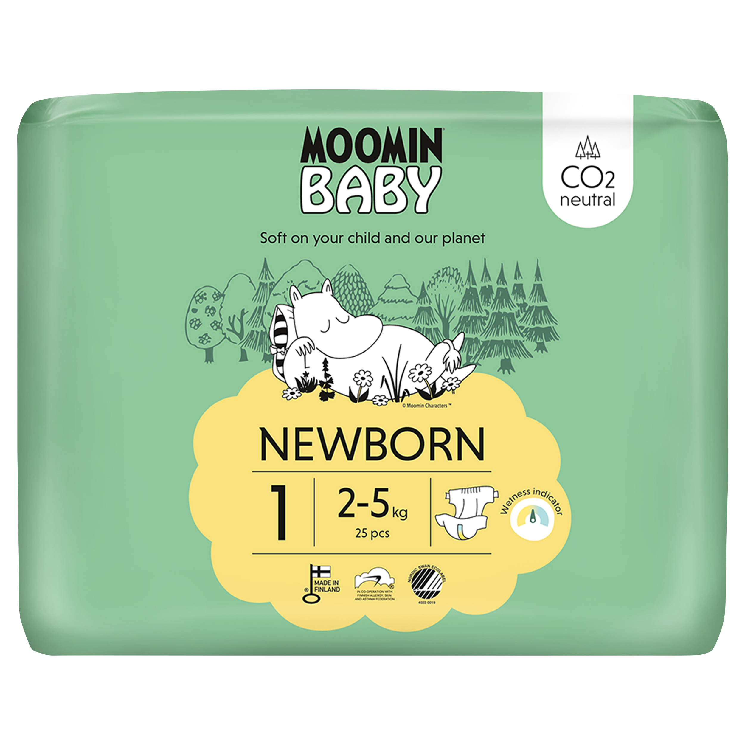 Moomin Baby 1 Newborn – šetrné pleny pro citlivou pokožku miminek. Citlivá pokožka miminek vyžaduje mimořádnou péči – plenky Moomin Baby 1 Newborn jsou hypoalergenní, dermatologicky testované a certifikované značkou Dermatest®, která zaručuje jejich bezpečnost a snášenlivost.
