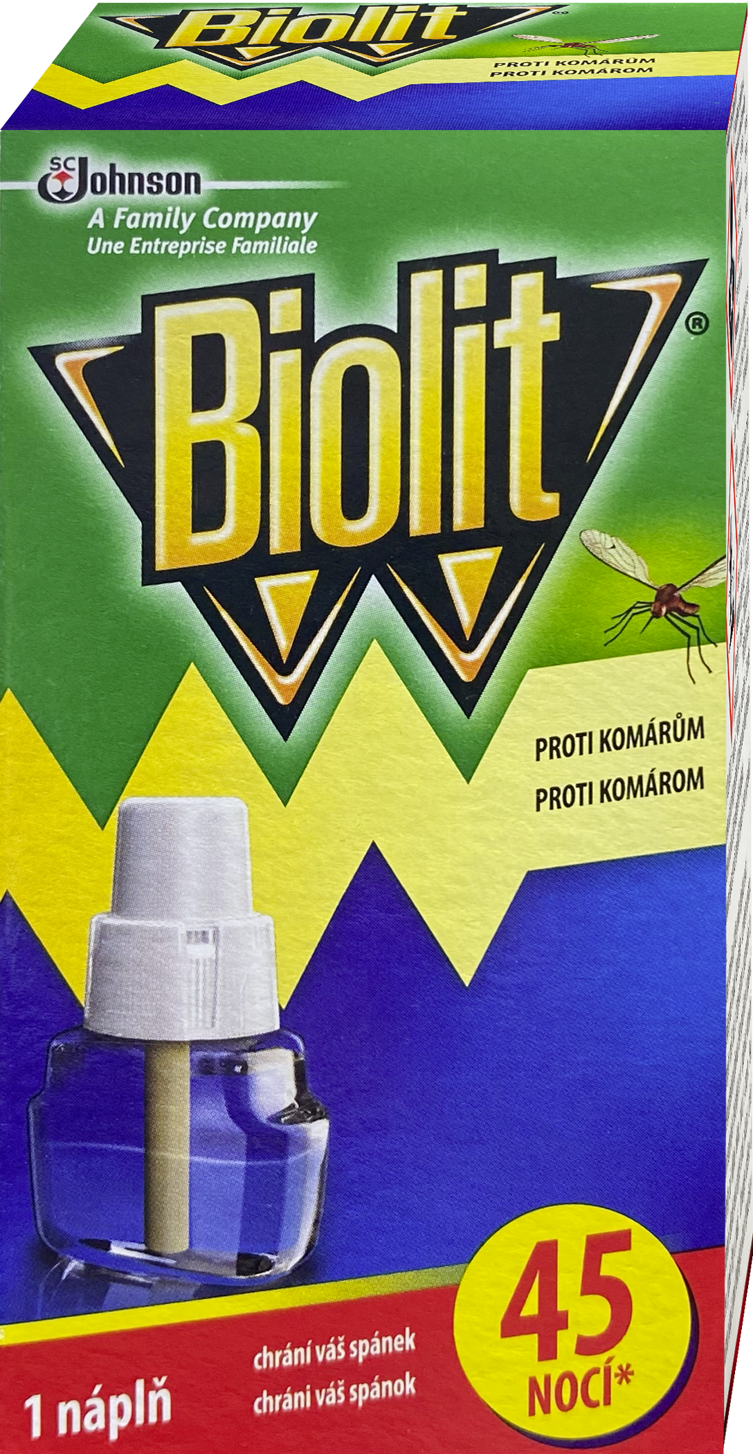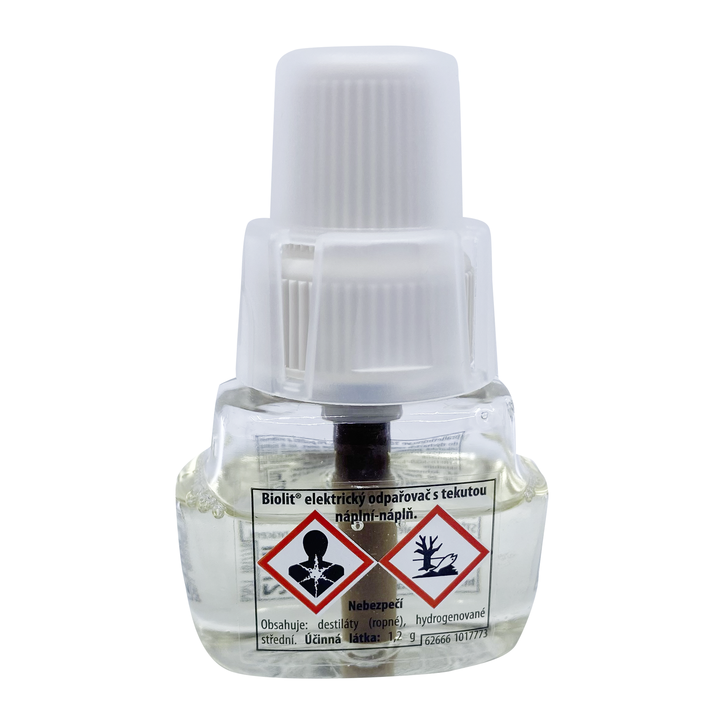 * až 45 x 8h = 360 hodin. Biolit® elektrický odpařovač s tekutou náplní-náplň, insekticid bez parfemace poskytuje efektivní ochranu proti komárům i při mírně otevřených oknech a rozsvícených světlech. Ochrání místnost do 30 m³.