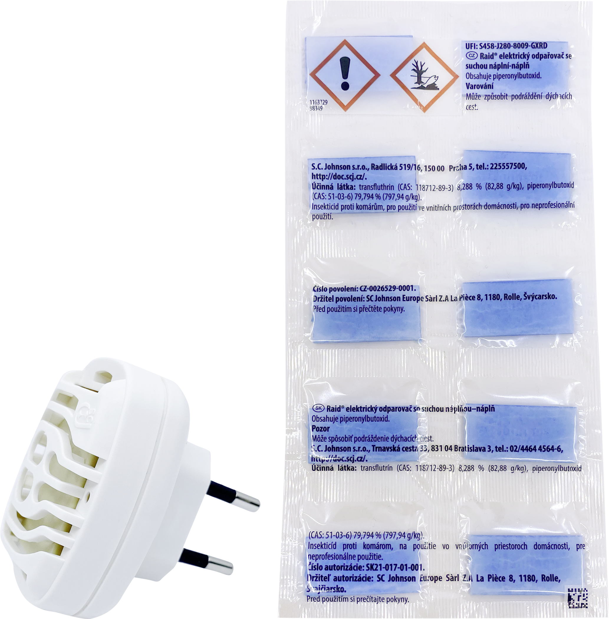 Účinné látky: 1,259 g transfluthrinu (8 mg/polštářek) a 11,803 g piperonyl butoxidu (75 mg/polštářek) ve 100 g přípravku. Vysoce toxický pro vodní organismy, s dlouhodobými účinky. Je-li nutná lékařská pomoc, mějte po ruce obal nebo štítek výrobku. Uchovávejte mimo dosah dětí. Zamezte vdechování dýmu. Obsahuje citronellol, 7-hydroxycitronellal, benzyl salicylate, alpha-methyl-1,3-benzodioxole-5-propionaldehyde, 2-(4-tert-butylbenzyl) propionaldehyde, alpha-hexylcinnamaldehyde. Může vyvolat alergickou reakci. Používejte podle návodu. Nepoužívejte v uzavřeném prostoru. Zachovejte vnější obal s bezpečnostními upozorněními do úplného spotřebování přípravku. Při styku s kůží potřísněnou oblast důkladně omyjte vodou a mýdlem. Během používání odpařovač ničím nezakrývejte. Nedotýkejte se odpařovače kovovými předměty ani vlhkýma rukama, pokud je zapojen. Před zapojením odstraňte nebo zakryjte terária, akvária, zvířecí a ptačí klece. Vypněte filtry u akvárií. Skladujte odděleně od potravin, nápojů a krmiv pro zvířata. Používejte pouze v dobře větraných prostorách. DŮLEŽITÉ BEZPEČNOSTNÍ POKYNY: Pokyny pro předcházení vzniku požáru, toxicity, zásahu el. proudem nebo zraněním. PŘED POUŽITÍM SI PŘEČTĚTE TYTO BEZPEČNOSTNÍ POKYNY A USCHOVEJTE SI JE. VÝSTRAHA: Při používání el. spotřebičů je nutno vždy dodržovat základní bezpečnostní opatření, včetně následujících: POZOR: Tento spotřebič mohou používat děti ve věku 8 let a starší a osoby se sníženými fyzickými, smyslovými nebo mentálními schopnostmi nebo nedostatkem zkušeností, pokud jsou pod dozorem nebo byly poučeny o používání spotřebiče bezpečným způsobem a rozumí případným nebezpečím. Děti si se spotřebičem nesmějí hrát. Čištění a údržbu prováděnou uživatelem nesmějí provádět děti bez dozoru. Pro bezpečné použití ho zapojujte jen do správně fungujících el. zásuvek na větraném místě, kde nemůže přijít do styku s přehozem na postel nebo jinými materiály. Nepoužívejte s prodlužovacími kabely nebo s rozdvojkami. Neponořujte do vody. Do zásuvky nad zařízení nic nezapojujte. Do odpařovačů Raid® používejte jen náplně Raid®. Spotřebič se má používat pouze s doporučeným odpařovacím médiem. Použití jiných látek může vést k nebezpečí otravy nebo požáru. Uchovávejte mimo dosah domácích zvířat. Tyto pokyny jsou k dispozici na www.scjproducts.info.