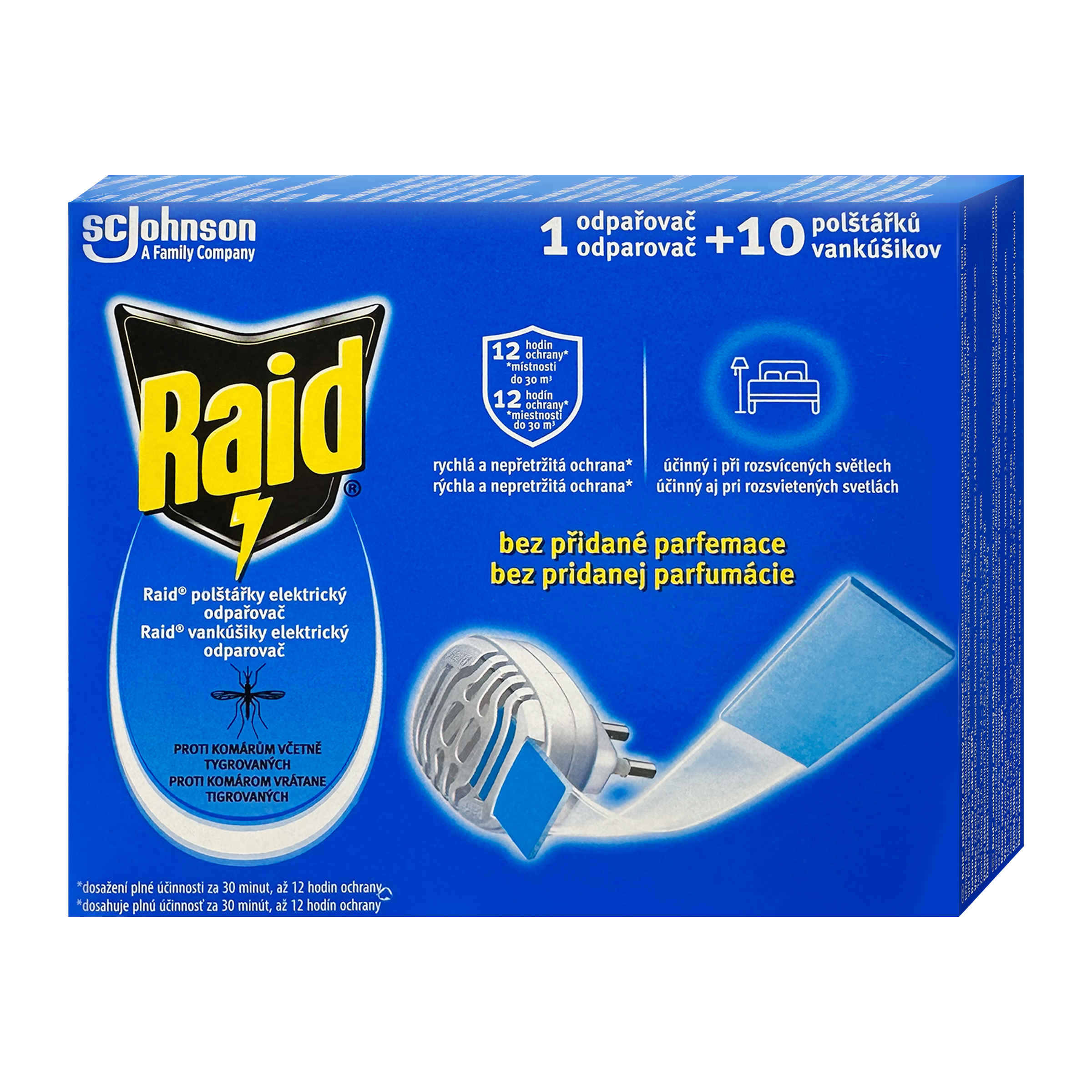 NÁVOD K POUŽITÍ 1. Vyjměte polštářek z plastového sáčku. 2. Držte polštářek za nejtenčí okraj/stranu, vložte jej do držáku a vystřeďte jej v mřížce. Následně si umyjte a usušte ruce. 3. Zapojte elektrický ohřívač do zásuvky, přípravek začne působit po 30 minutách. 4. Po 12 hodinách používání odpojte elektrický ohřívač, vyjměte polštářek a nahraďte jej novým. 5. Uchovávejte přípravek v suchu, mimo zdroje tepla a sluneční světlo. Zabraňte uvolnění do životního prostředí. Uniklý produkt seberte. Odstraňte obsah/obal/odpařovač podle místních předpisů. Nepoužívejte v uzavřeném prostoru. Po celou dobu používání si uchovávejte vnější obal s bezpečnostními pokyny. Nedovolte, aby při používání zakrývaly zařízení jakékoli materiály. Nedotýkejte se zařízení kovovými nástroji nebo mokrýma rukama. Před aplikací odstraňte nebo zakryjte terária, akvária a klece pro zvířata. Během použití vypněte vzduchový filtr akvária. Používejte pouze v dobře větraných prostorách. Skladujte mimo dosah potravin, nápojů a potravy pro zvířata. PŘED POUŽITÍM SI PŘEČTĚTE TYTO BEZPEČNOSTNÍ POKYNY A USCHOVEJTE SI JE. VÝSTRAHA: Při používání el. spotřebičů je nutno vždy dodržovat základní bezpečnostní opatření, včetně následujících: POZOR: Tento spotřebič mohou používat děti ve věku 8 let a starší a osoby se sníženými fyzickými, smyslovými nebo mentálními schopnostmi nebo nedostatkem zkušeností, pokud jsou pod dozorem nebo byly poučeny o používání spotřebiče bezpečným způsobem a rozumí případným nebezpečím. Děti si se spotřebičem nesmějí hrát. Čištění a údržbu prováděnou uživatelem nesmějí provádět děti bez dozoru. Pro bezpečné použití ho zapojujte jen do správně fungujících el. zásuvek na větraném místě, kde nemůže přijít do styku s přehozem na postel nebo jinými materiály. Nepoužívejte s prodlužovacími kabely nebo s rozdvojkami. Neponořujte do vody. Do zásuvky nad zařízení nic nezapojujte. Do odpařovačů Raid® používejte jen náplně Raid®. Spotřebič se má používat pouze s doporučeným odpařovacím médiem. Použití jiných látek může vést k nebezpečí otravy nebo požáru