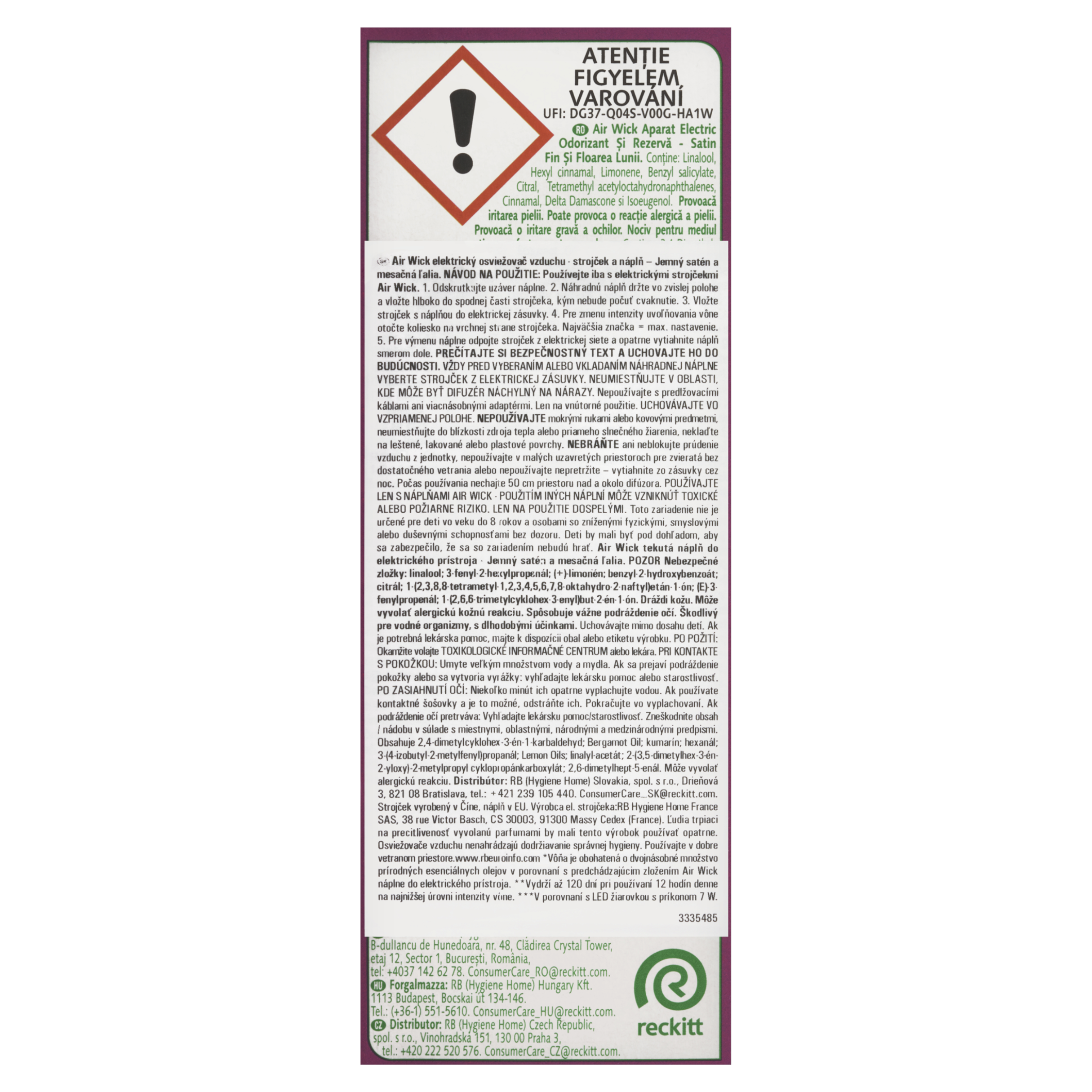 VAROVÁNÍ Air Wick tekutá náplň do elektrického přístroje - Jemný satén a měsíční lilie. Nebezpečné složky: linalool; α-hexylcinnamaldehyd; d-limonen; benzyl-salicylát; citral; 1-(1,2,3,4,5,6,7,8-oktahydro-2,3,8,8-tetramethyl-2-naftyl)ethan-1-on; cinnamaldehyd; 1-(2,6,6-trimethyl-3-cyklohexen-1-yl)-2-buten-1-on; isoeugenol. Dráždí kůži. Může vyvolat alergickou kožní reakci. Způsobuje vážné podráždění očí. Škodlivý pro vodní organismy, s dlouhodobými účinky. Uchovávejte mimo dosah dětí. Je-li nutná lékařská pomoc, mějte po ruce obal nebo štítek výrobku. PŘI POŽITÍ: Okamžitě volejte TOXIKOLOGICKÉ INFORMAČNÍ STŘEDISKO nebo lékaře. PŘI STYKU S KŮŽÍ: Omyjte velkým množstvím vody a mýdla. Při podráždění kůže nebo vyrážce: Vyhledejte lékařskou pomoc nebo ošetření. PŘI ZASAŽENÍ OČÍ: Několik minut opatrně vyplachujte vodou. Vyjměte kontaktní čočky, jsou-li nasazeny a pokud je lze vyjmout snadno. Pokračujte ve vyplachování. Přetrvává-li podráždění očí: Vyhledejte lékařskou pomoc nebo ošetření. Obsahuje 2,4-dimethylcyklohex-3-en-1-karbaldehyd; Bergamot Oil; kumarin; hexanal; 3-(4-isobutyl-2-methylfenyl)propanal; Lemon Oils; linalyl-acetát; 2-(3,5-dimethylhex-3-en-2-yloxy)-2-methylpropyl cyklopropankarboxylát; 2,6-dimethyl-5- heptenal. Může vyvolat alergickou reakci. PŘEČTĚTE SI TEXT O BEZPEČNÉM POUŽITÍ A UCHOVEJTE SI JEJ PRO POZDĚJŠÍ POUŽITÍ. PŘED ODSTRANĚNÍM NEBO VLOŽENÍM NÁHRADNÍ NÁPLNĚ OSVĚŽOVAČ VŽDY VYJMĚTE Z ELEKTRICKÉ ZÁSUVKY. NEUMISŤUJTE DO PROSTORŮ, VE KTERÝCH BY BYL OSVĚŽOVAČ VYSTAVEN TVRDÝM NÁRAZŮM. Nepoužívejte osvěžovač společně s prodlužovacími kabely nebo adaptéry s více zásuvkami. Pouze pro vnitřní použití. UCHOVÁVEJTE VE VZPŘÍMENÉ POLOZE. NEPOUŽÍVEJTE mokrýma rukama nebo kovovými předměty, neumisťujte do blízkosti zdroje tepla nebo přímého slunečního záření, nepokládejte na leštěné, lakované nebo plastové povrchy. NEBRAŇTE ani neblokujte proudění vzduchu z jednotky, nepoužívejte v malých uzavřených prostorách pro zvířata bez dostatečného větrání nebo nepoužívejte nepřetržitě - vytáhněte ze zásuvky přes noc. Během používání ponechejte 50 cm prostoru nad a kolem difuzéru. POUŽÍVEJTE POUZE S NÁPLNĚMI AIR WICK - POUŽITÍM JINÝCH NÁPLNÍ MŮŽE VZNIKNOUT TOXICKÉ NEBO POŽÁRNÍ RIZIKO. ZAŘÍZENÍ SMĚJÍ POUŽÍVAT POUZE DOSPĚLÍ. Toto zařízení není určeno pro použití dětmi ve věku do 8 let a osobami se sníženými fyzickými, smyslovými nebo duševními schopnostmi bez dozoru. Děti by měly být pod dohledem, aby bylo zajištěno, že si se zařízením nebudou hrát. Osoby s přecitlivělostí na vůně by měly tento výrobek používat s opatrností. Osvěžovače vzduchu nemohou nahradit správné hygienické návyky. Používejte v dobře větraném prostoru.
