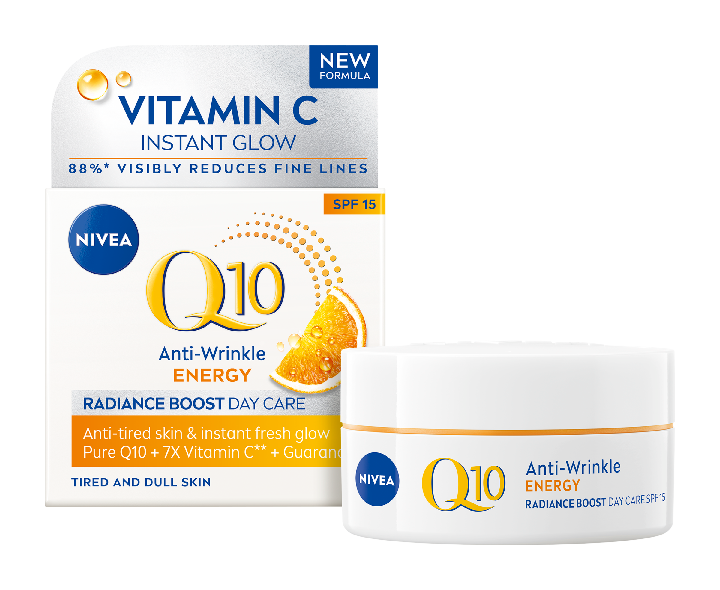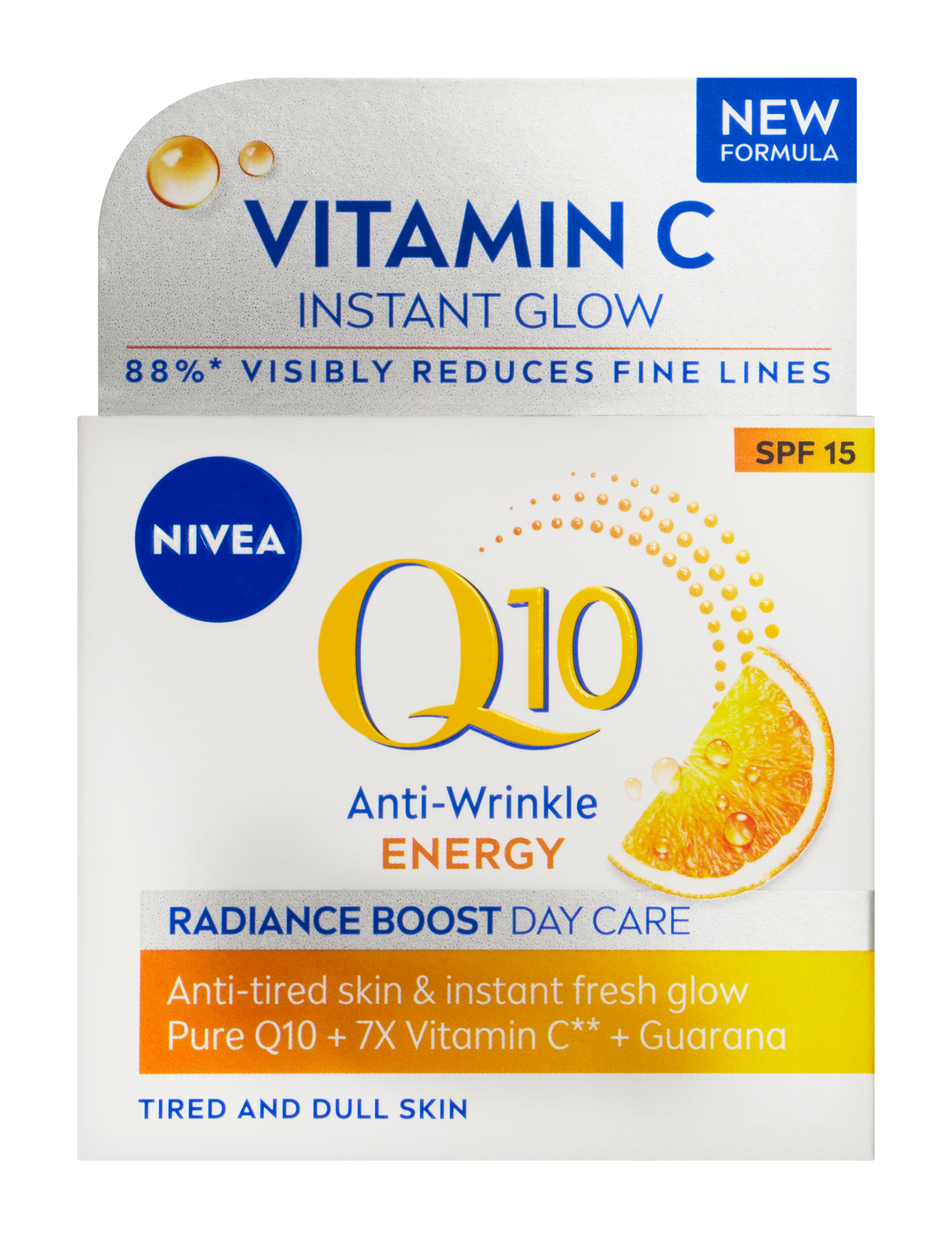 Nivea® Rozjasňující denní krém proti vráskám Q10 Energy pro okamžité osvěžení a rozzářenou pleť.