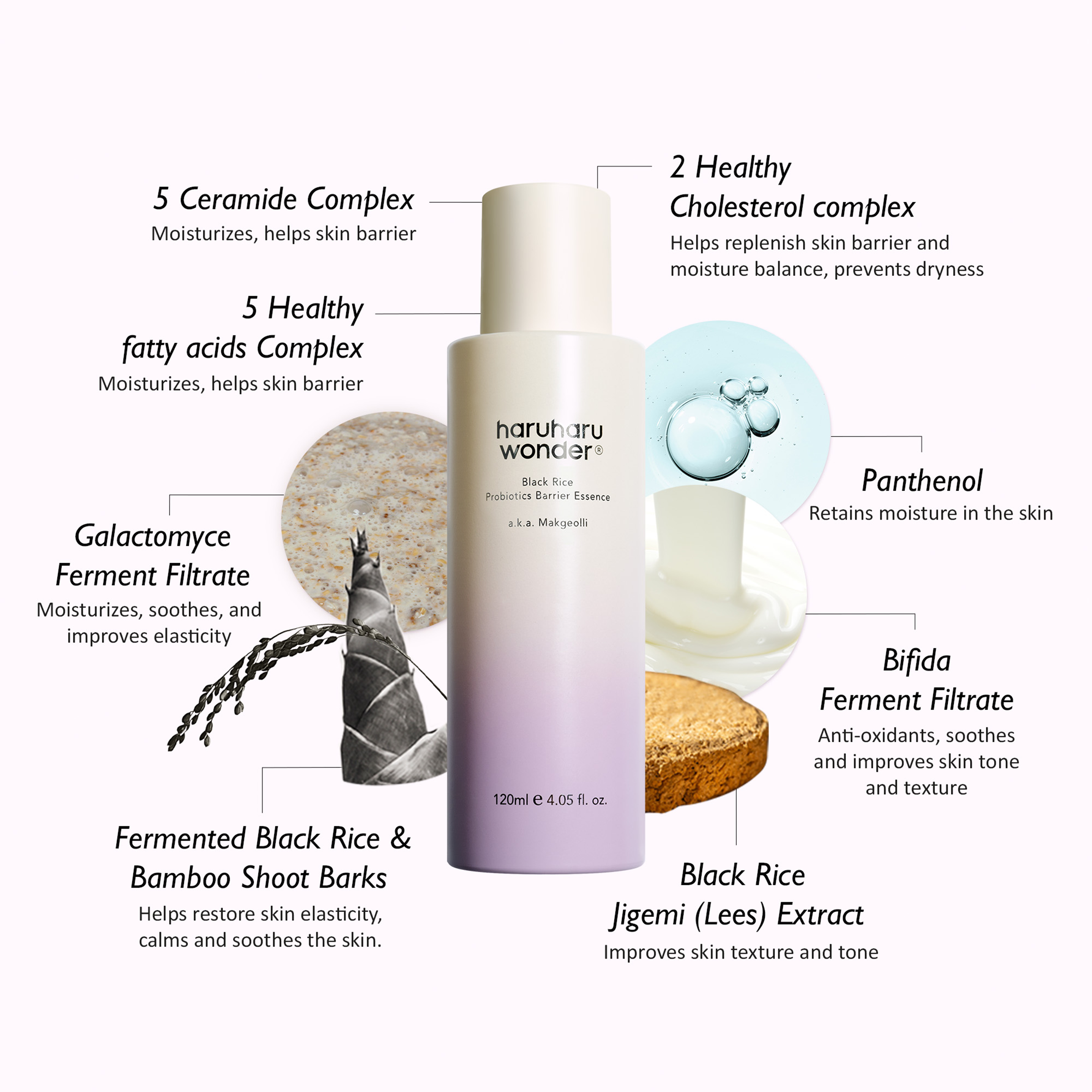 Pleťová esence se zklidňujícími účinky. Vhodná pro všechny typy pleti, včetně citlivé. Obsahuje probiotické složky, které zvyšují pružnost, vyhlazují a podporují přirozený mikrobiom pokožky. Výtažek z rýže navíc zpomaluje proces stárnutí pleti, dodává jí pružnost a vyživuje ji. Textura esence je mléčná, zanechává pleť jasnější, pružnější a hydratovanější. Bez parfemace a dermatologicky testováno pro všechny typy pleti.