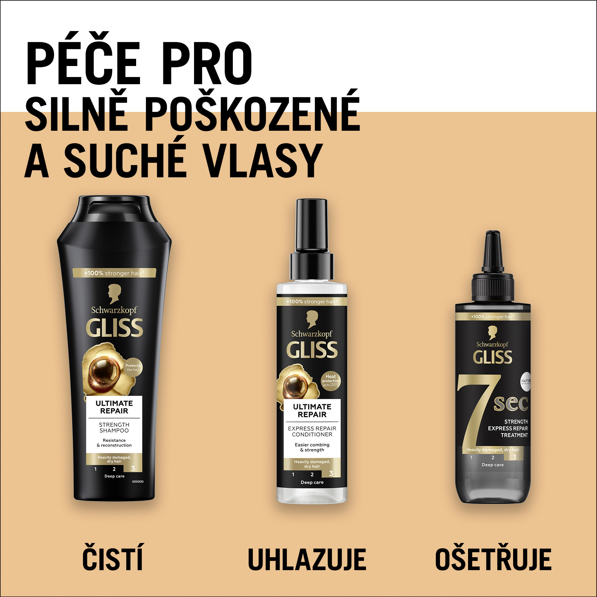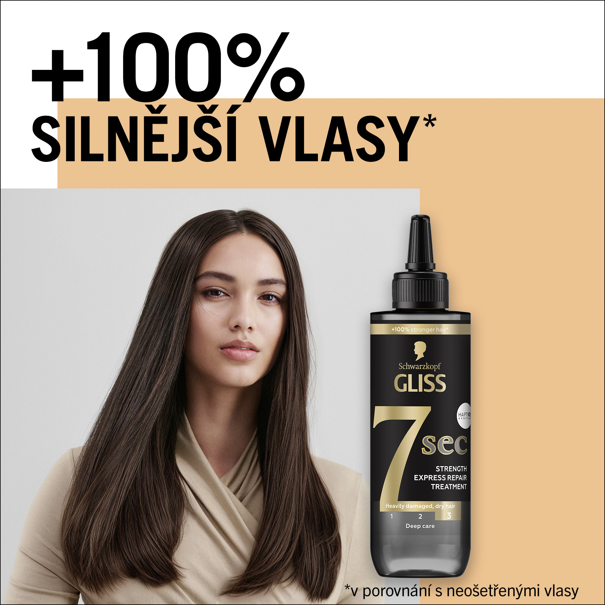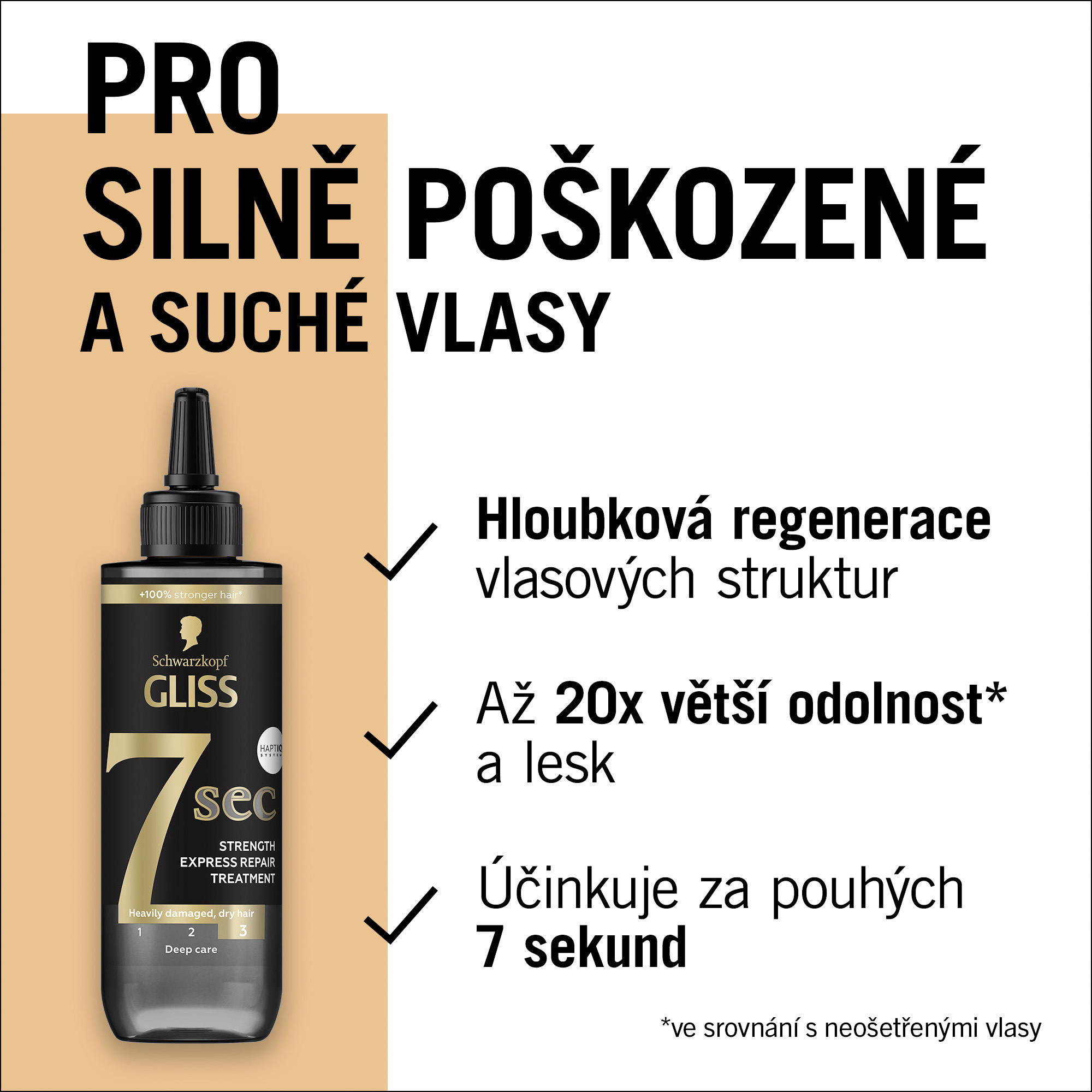 - Pečující kúra: 7vteřinová kúra na velmi poškozené a suché vlasy pro hedvábně hladké vlasy, aniž by je zatěžovala. Objevte nové úrovně regenerace vlasů s Gliss.