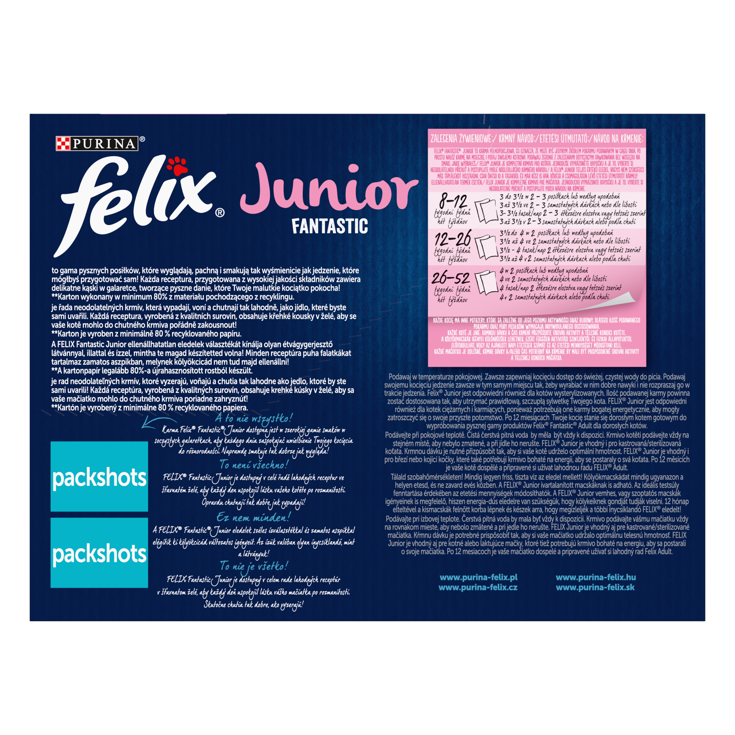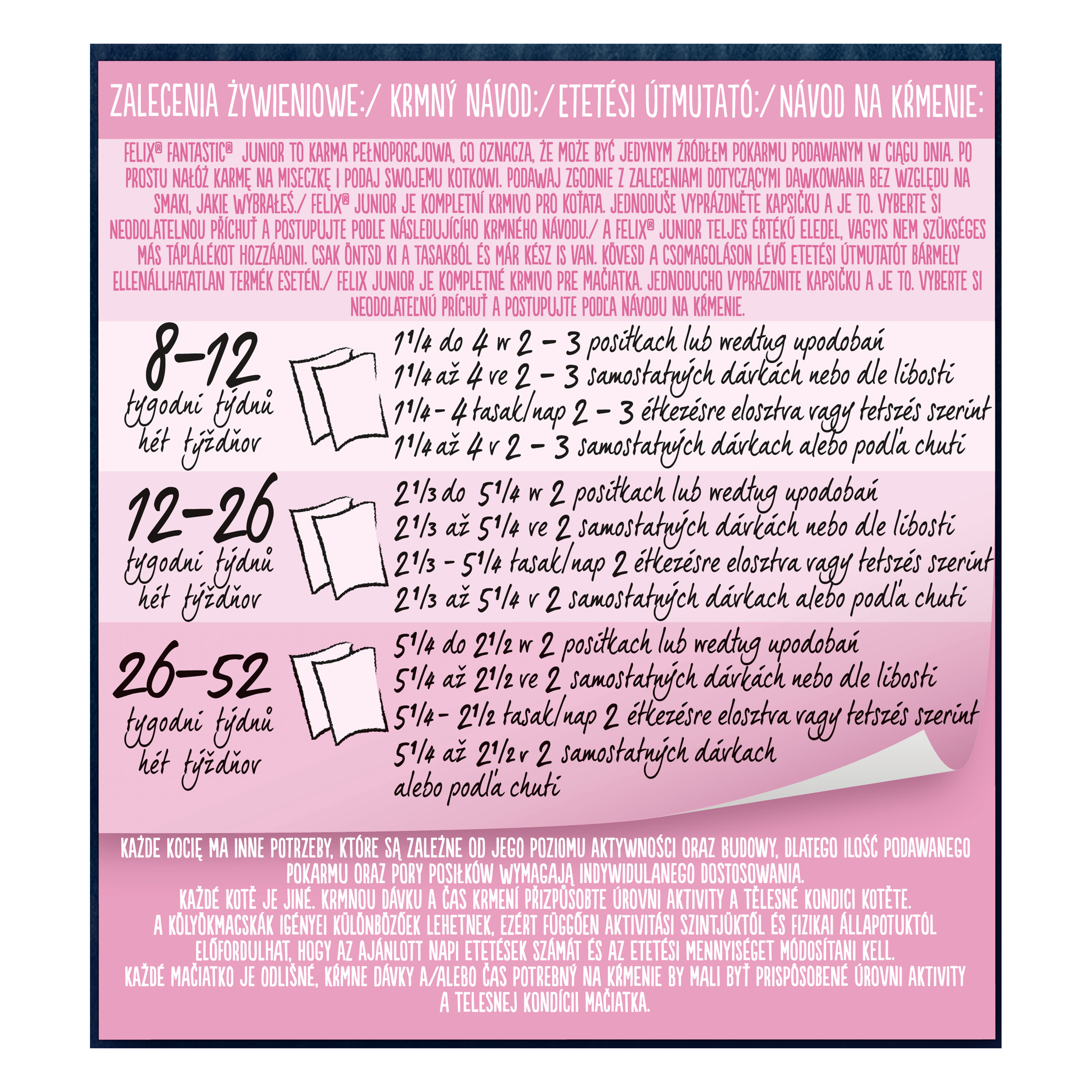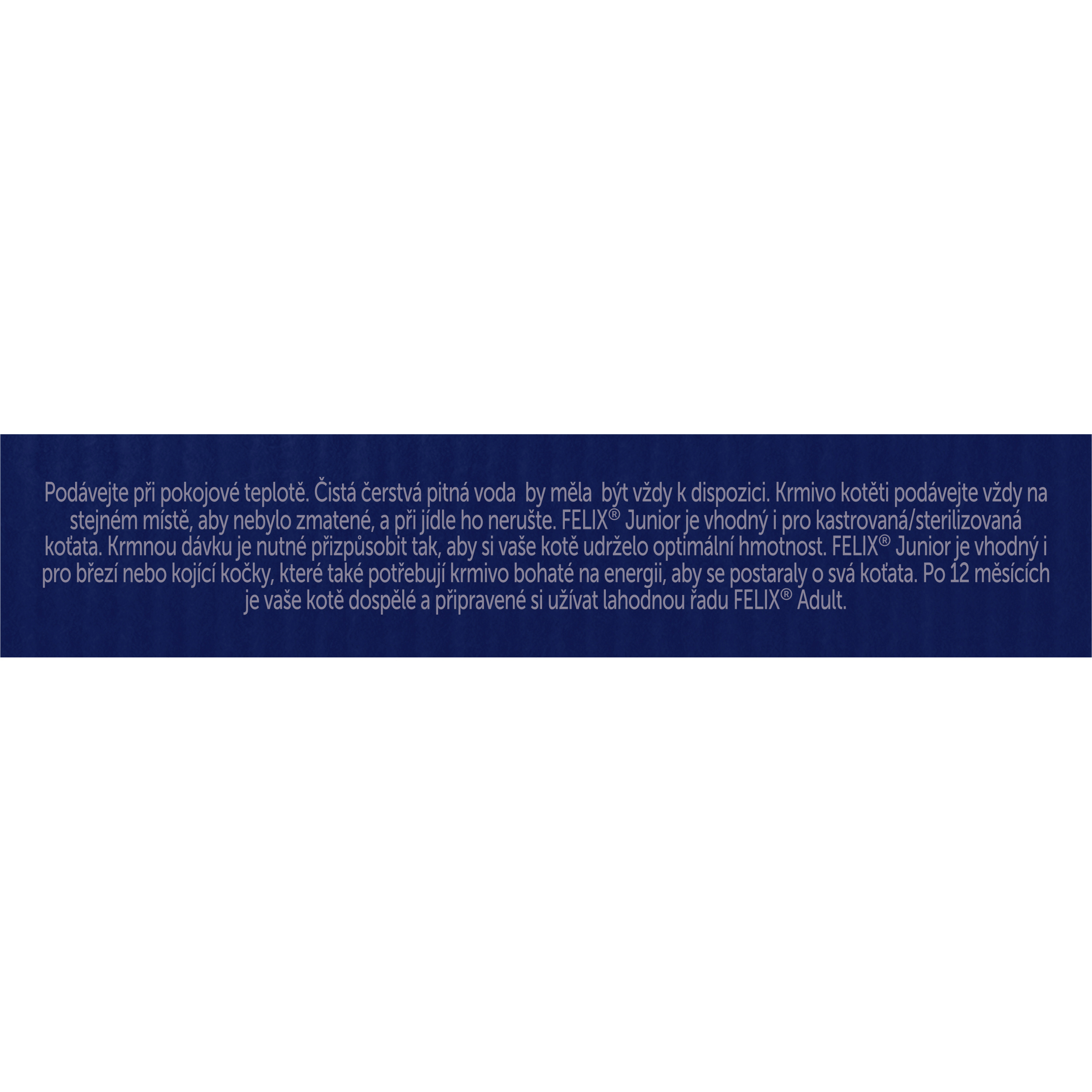 Krmný návod: Felix Junior je kompletní krmivo pro koťata. Jednoduše vyprázdněte kapsičku a je to. Vyberte si neodolatelnou příchuť a postupujte podle následujícího krmného návodu. Krmný návod: Každé kotě je jiné. Krmnou dávku a čas krmení přizpůsobte úrovni aktivity a tělesné kondici kotěte. Podávejte při pokojové teplotě. Čistá čerstvá voda by měla být vždy k dispozici. Krmivo kotěti podávejte vždy na stejném místě, aby nebylo zmatené, a při jídle ho nerušte. FELIX Junior je vhodný i pro březí nebo kojící kočky, které také potřebují krmivo bohaté na energii, aby se postaraly o svá koťata. Po 12 měsících je vaše kotě dospělé a připravené si užívat lahodnou řadu Felix Adult.
