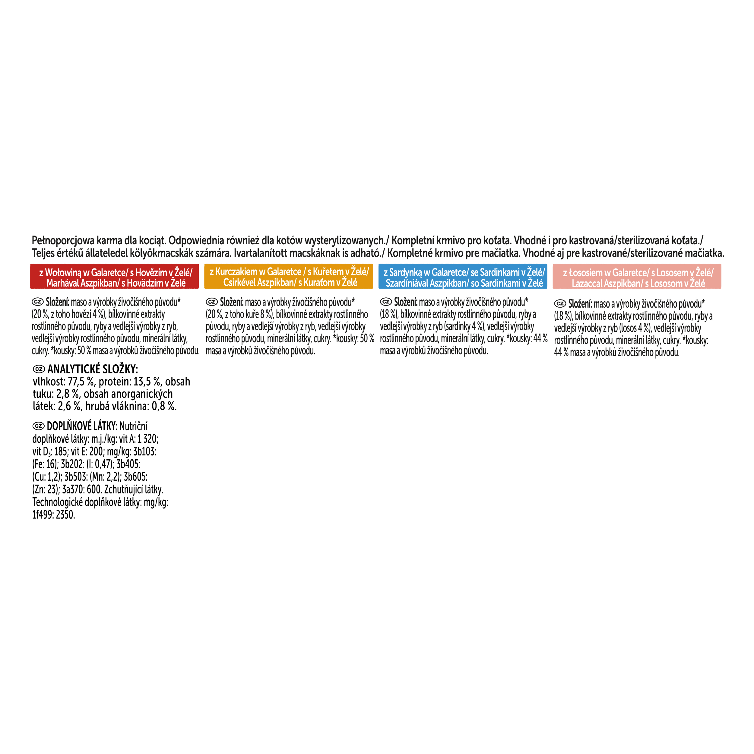 Se sardinkami v želé: maso a výrobky živočišného původu* (18 %), bílkovinné extrakty rostlinného původu, ryby a vedlejší výrobky z ryb (sardinky 4 %), vedlejší výrobky rostlinného původu, minerální látky, cukry. *kousky: 44 % masa a výrobků živočišného původu