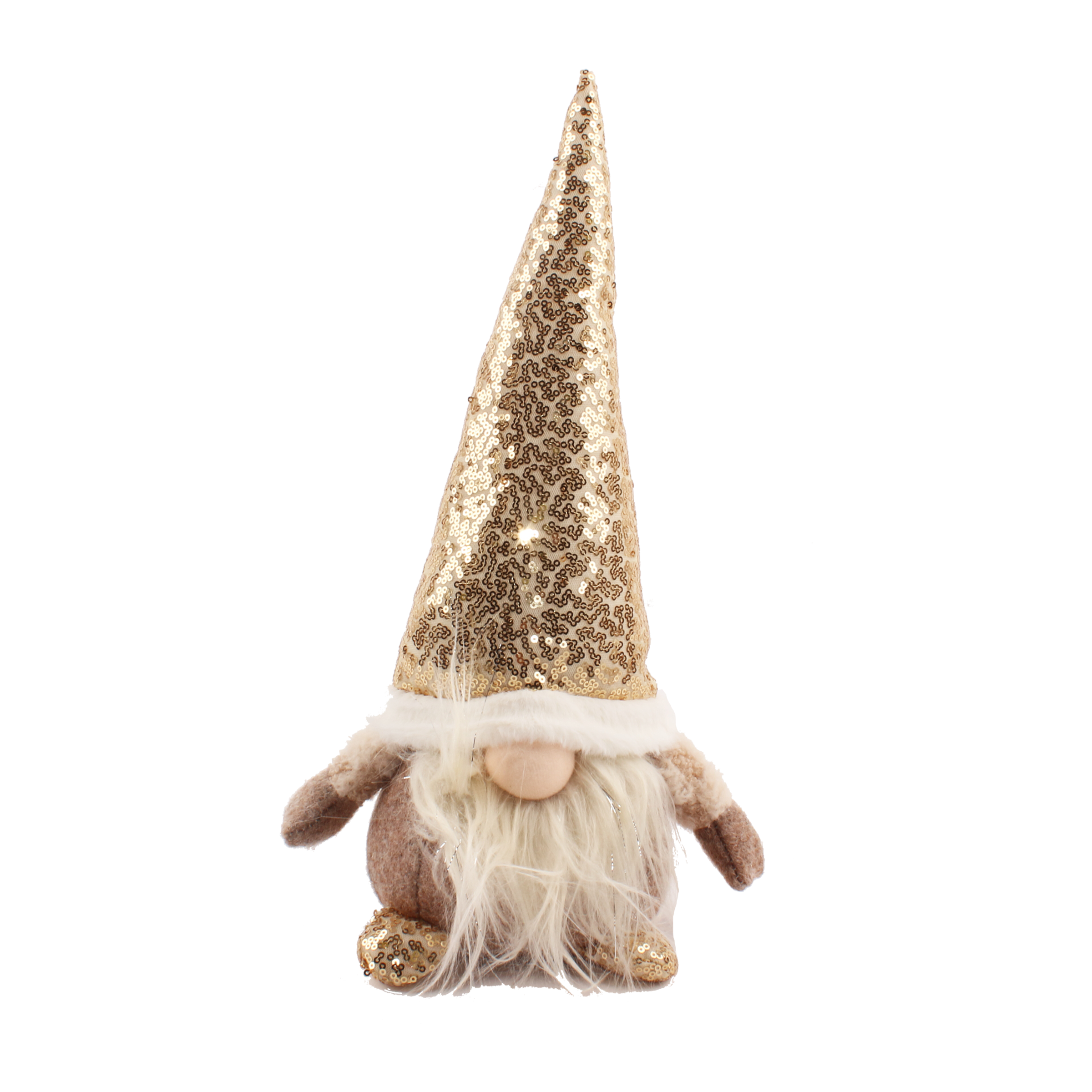 Luxusní trpaslík s třpytivou zlatou čepicí zdobenou flitry a bílým kožíškem dodá vašemu domovu slavnostní atmosféru. S dlouhým bílým plnovousem, hnědým tělem a zlatými botami ladí do elegantní vánoční výzdoby. Stylový doplněk na stůl, komodu nebo pod stromeček. Výška: 40 cm.