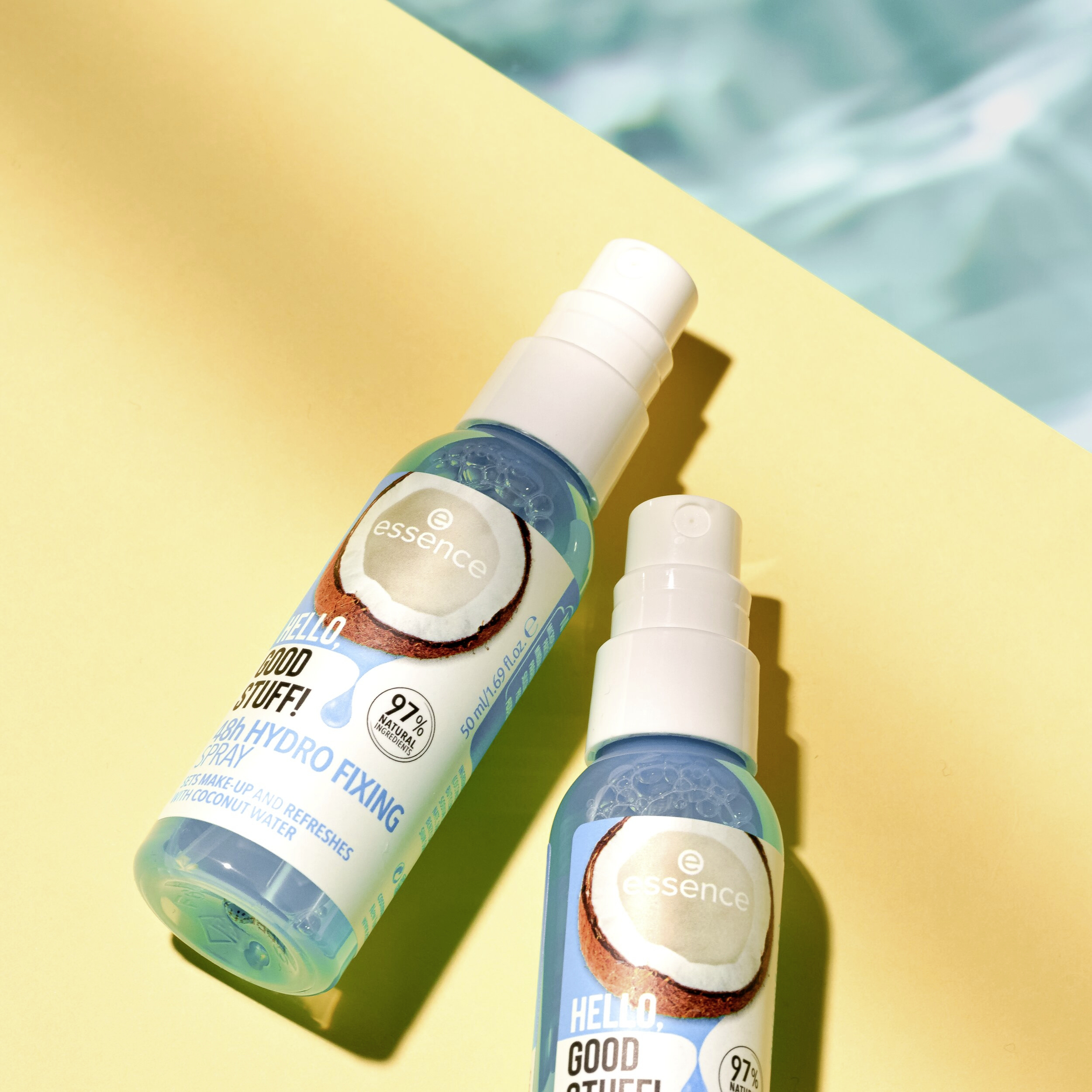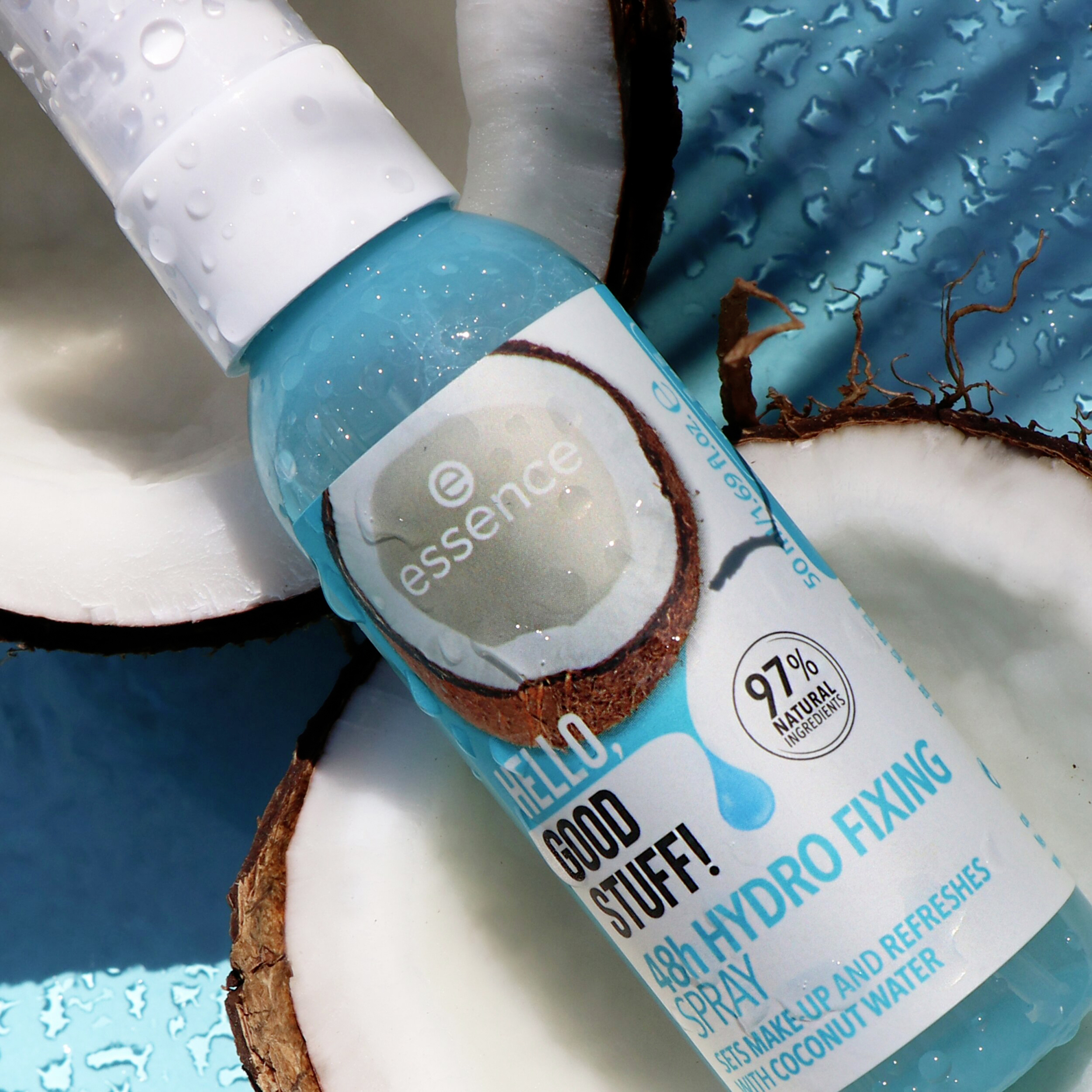 Fixační sprej na make-up, který revitalizuje a hydratuje zároveň: fixační sprej HELLO, GOOD STUFF! 48h Je obohacený o kokosovou vodu a dodává pokožce hydrataci až po dobu 48 hodin. Sprej lze použít několikrát denně – pro příval svěžesti na cestách. Obsahuje 97 % přírodních složek a je dermatologicky testován.