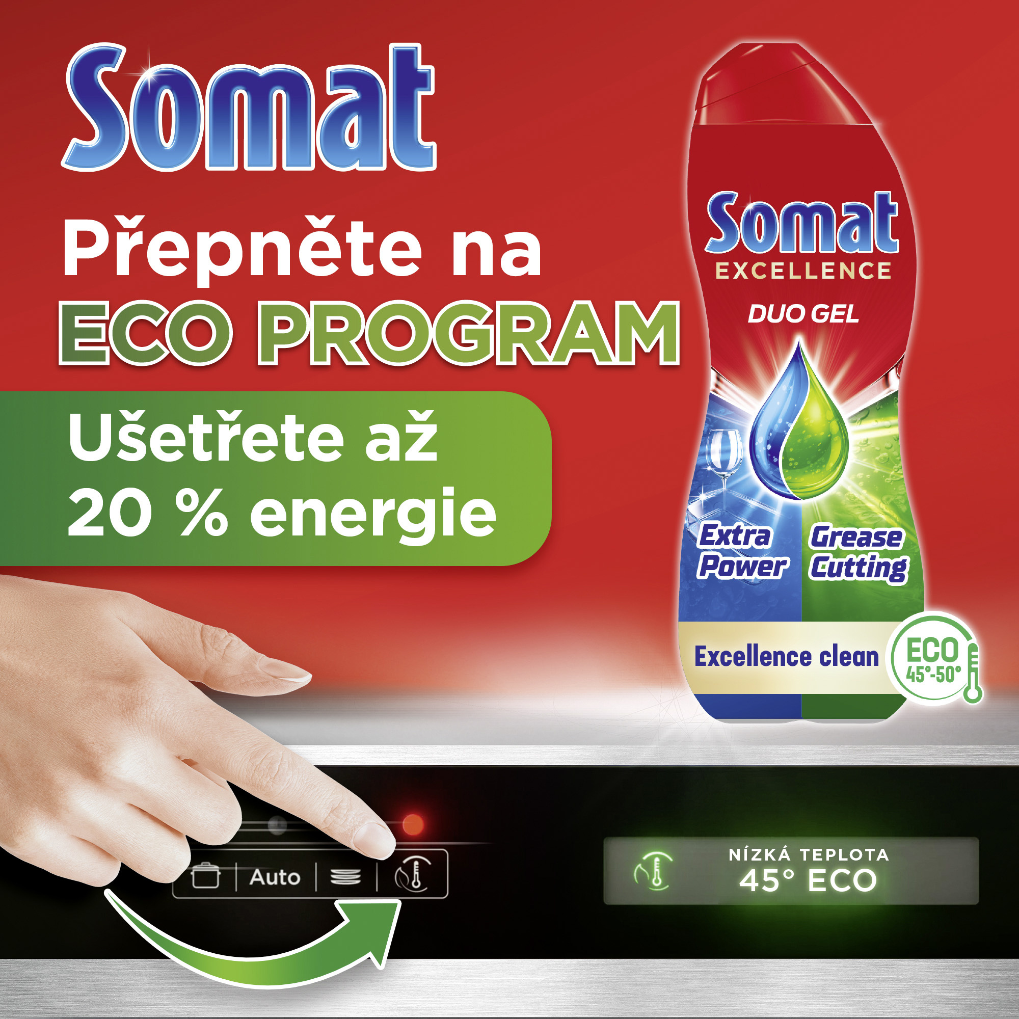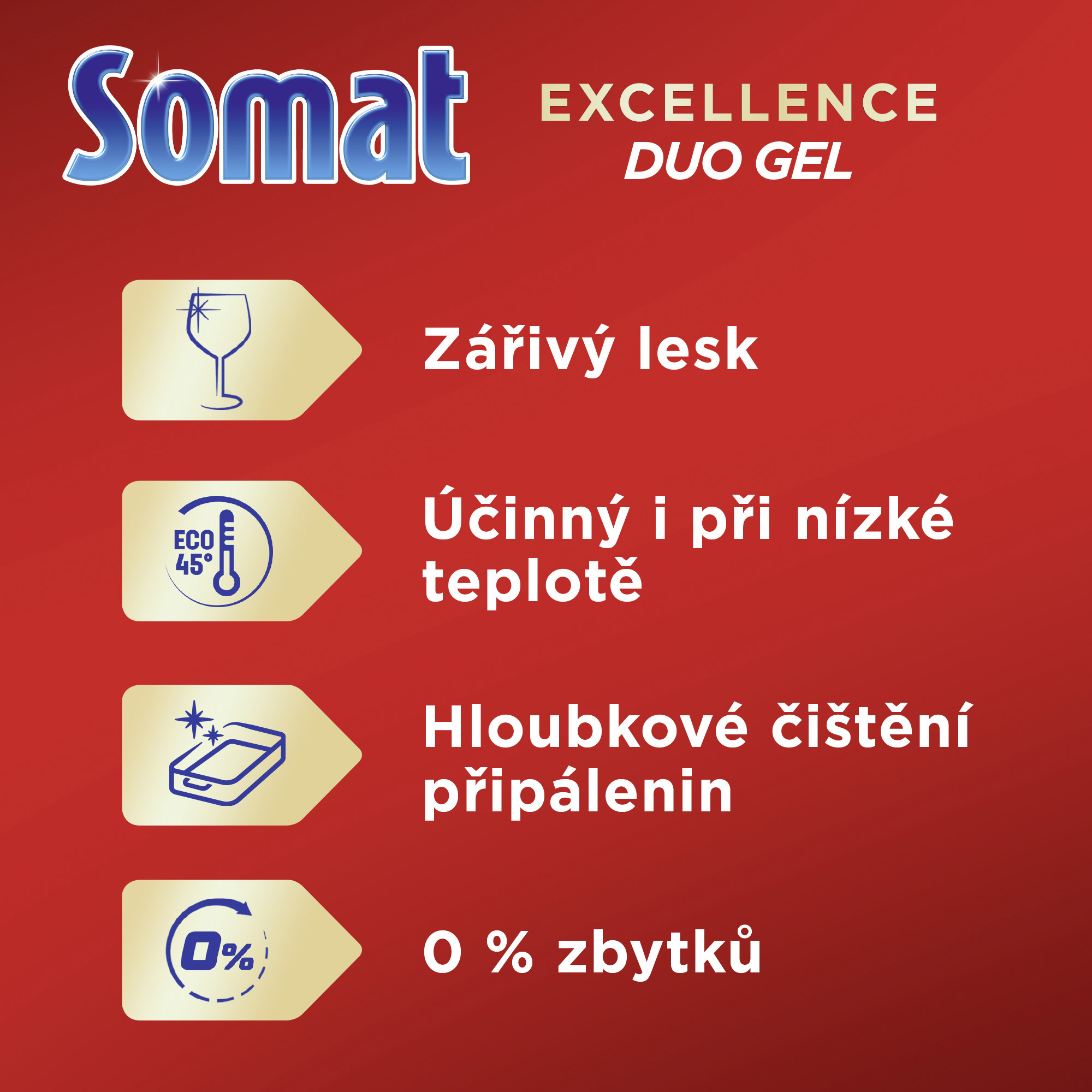 Ochrana proti skvrnám od vodního kamene. Somat Excellence Duo Gel - naše nejlepší složení Somat gelu zajišťuje účinné čištění a brilantní lesk i při nízkých teplotách na eco a krátké programy. Jedinečná kombinace dvou doplňujících se receptur poskytuje hloubkové čištění připálenin a silné odmašťovací účinky. Pro okamžitý efekt a extra lesk nádobí. I při nízkých teplotách na eco a krátké programy zanechá za sebou oslnivě čisté nádobí bez usazenin.