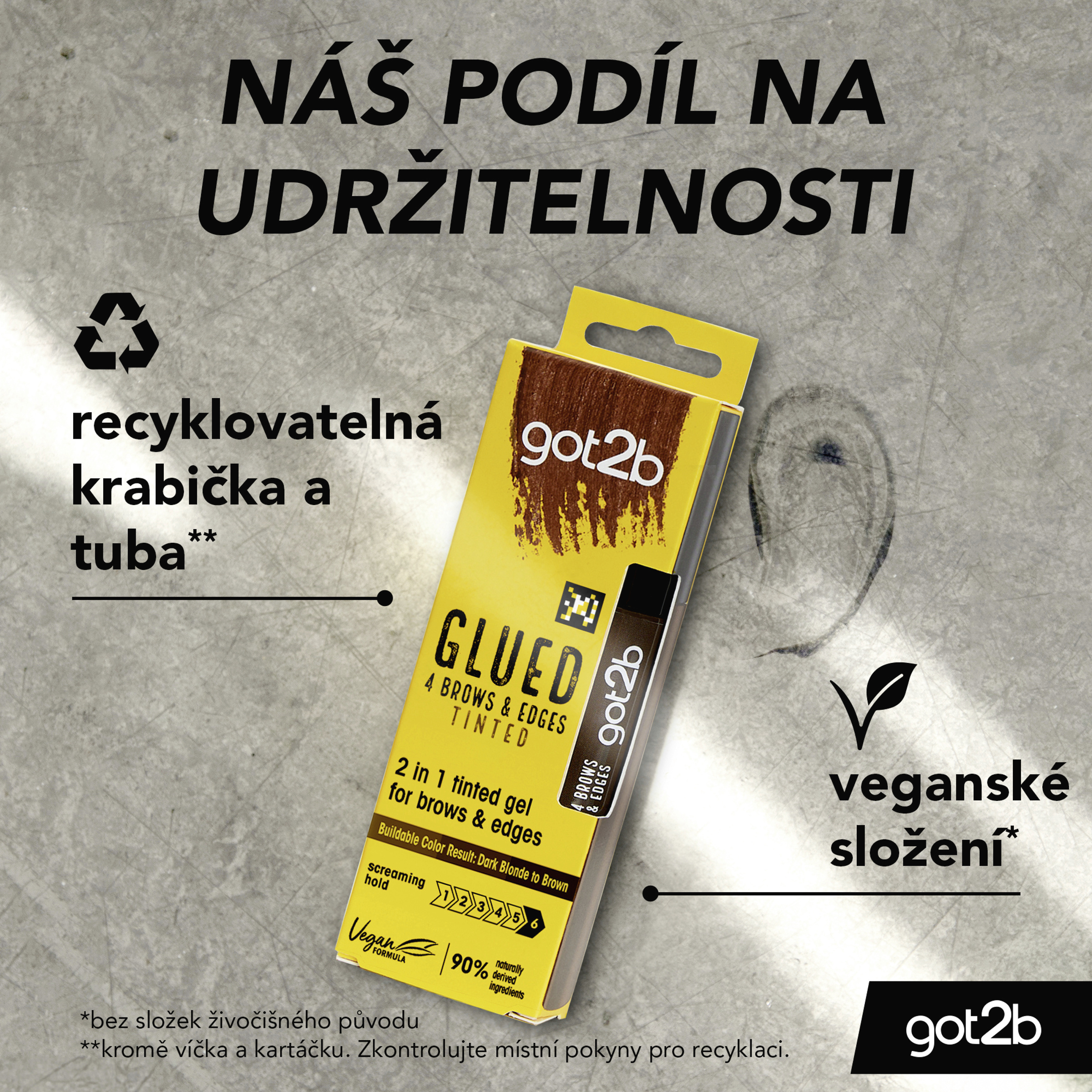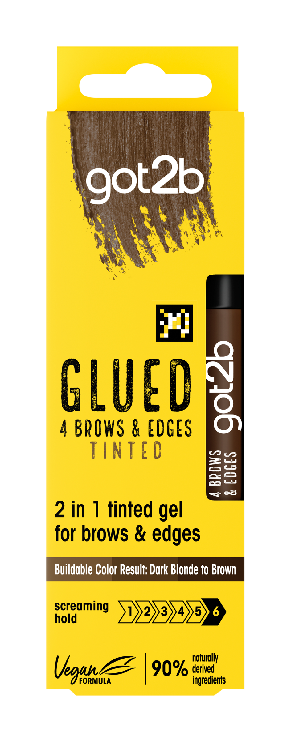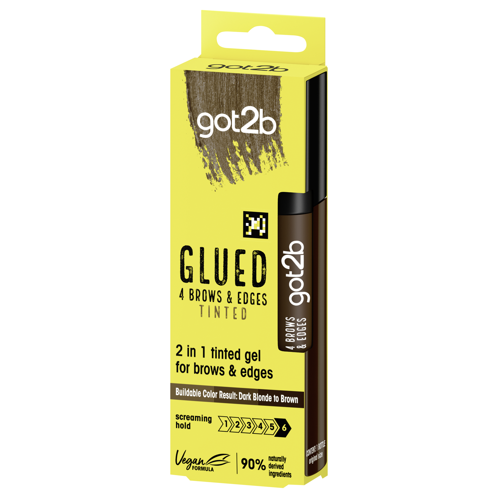 got2b Tinted Glued Gel stylingový barvící gel na obočí a „baby" vlásky poskytuje plněji vypadající obočí a uhlazuje krátké vlásky. Vydrží během celého dne. Barevný výsledek: tmavá blond až hnědá. Produkt je bez parfému