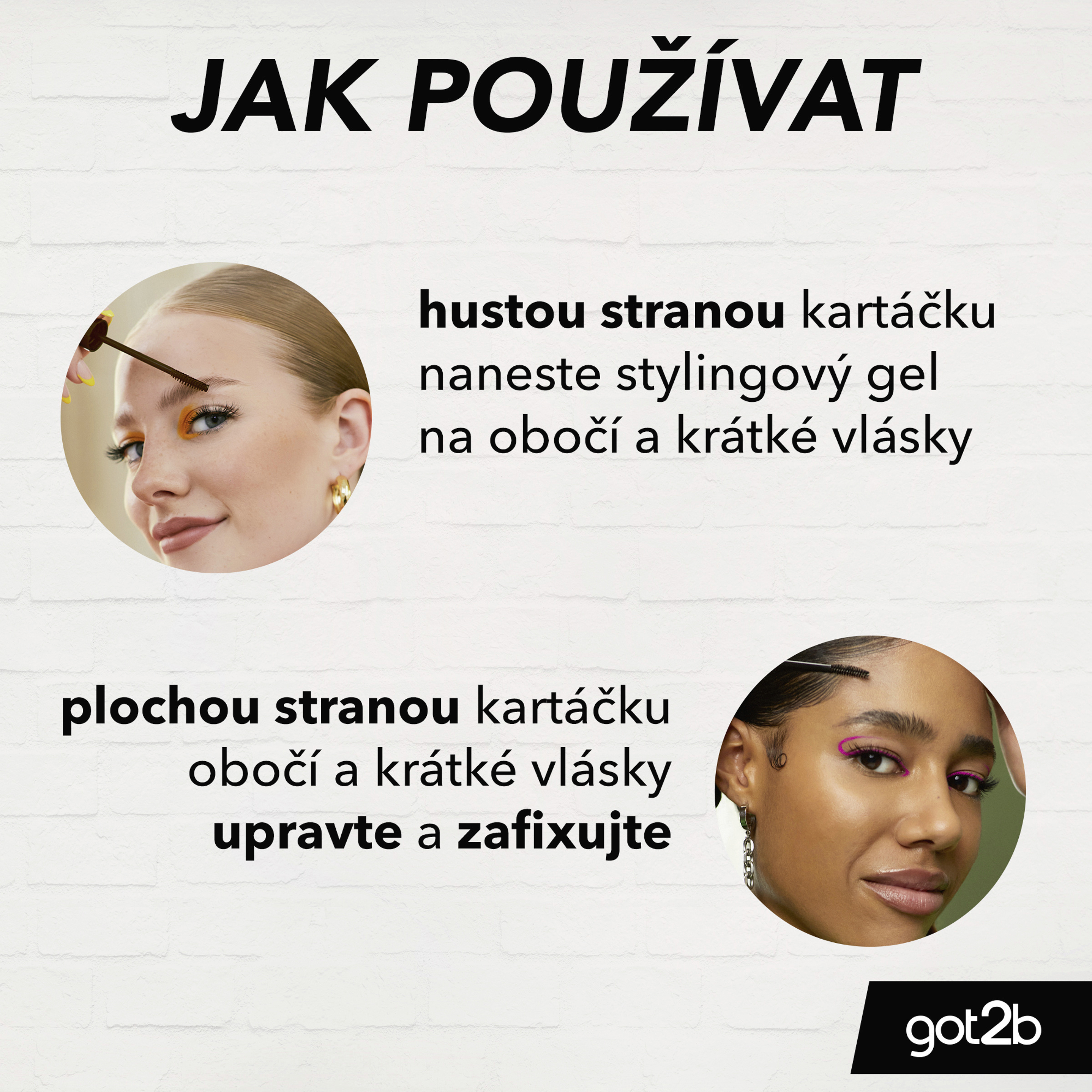 Zaoblenou stranu kartáčku použijte na aplikaci produktu na obočí nebo vlasy. Plochou stranou upravte a nastylujte podle vašich představ. Před aplikací na obočí odstraňte přebytečný gel ze štětce.